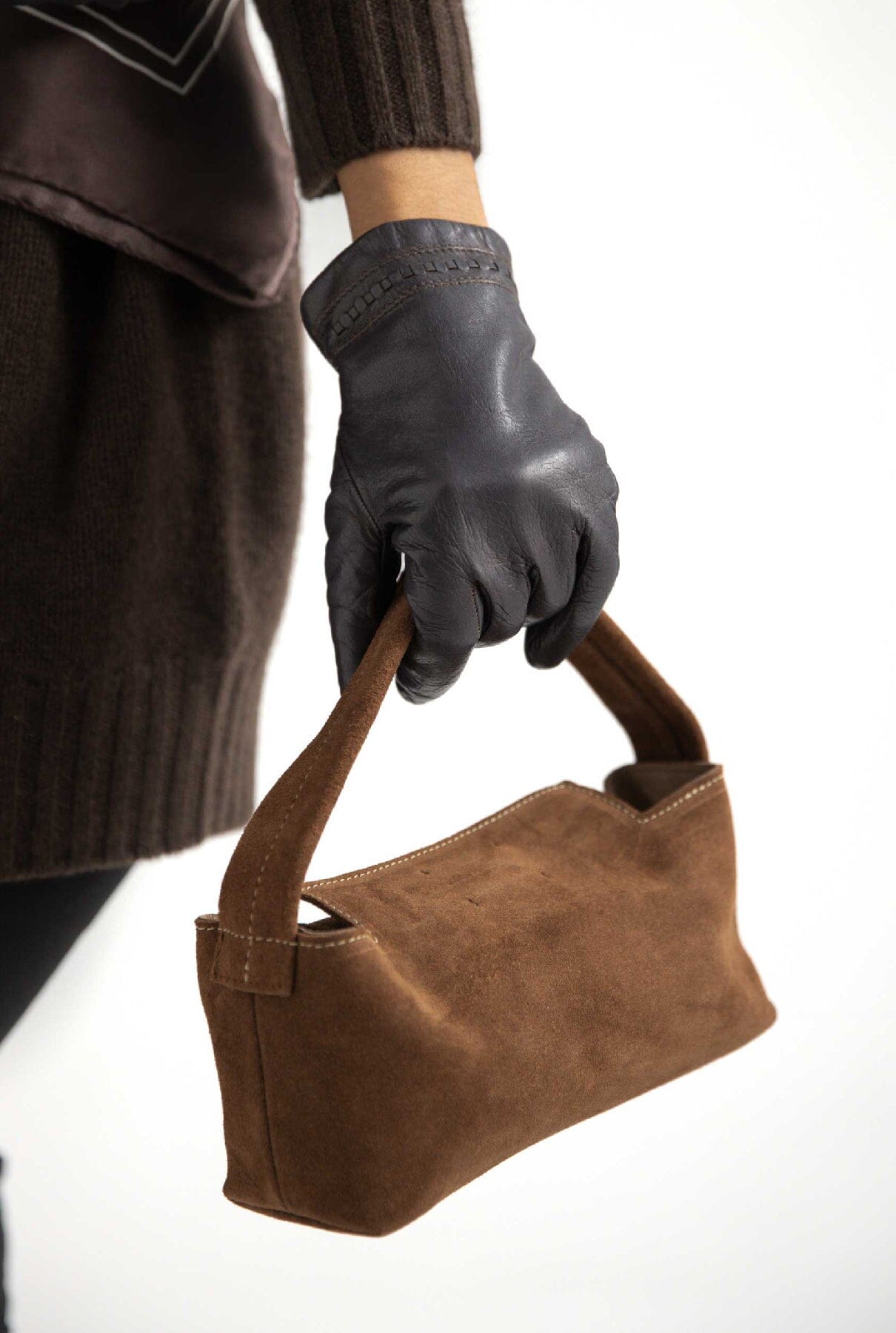 BOLSO DE PIEL DE VACUNO CON ACABADO EN SERRAJE. ESTE BOLSO DE TAMAÑO MINI EN COLOR NEGRO SE DISTINGUE POR SU BORDE BLANCO.