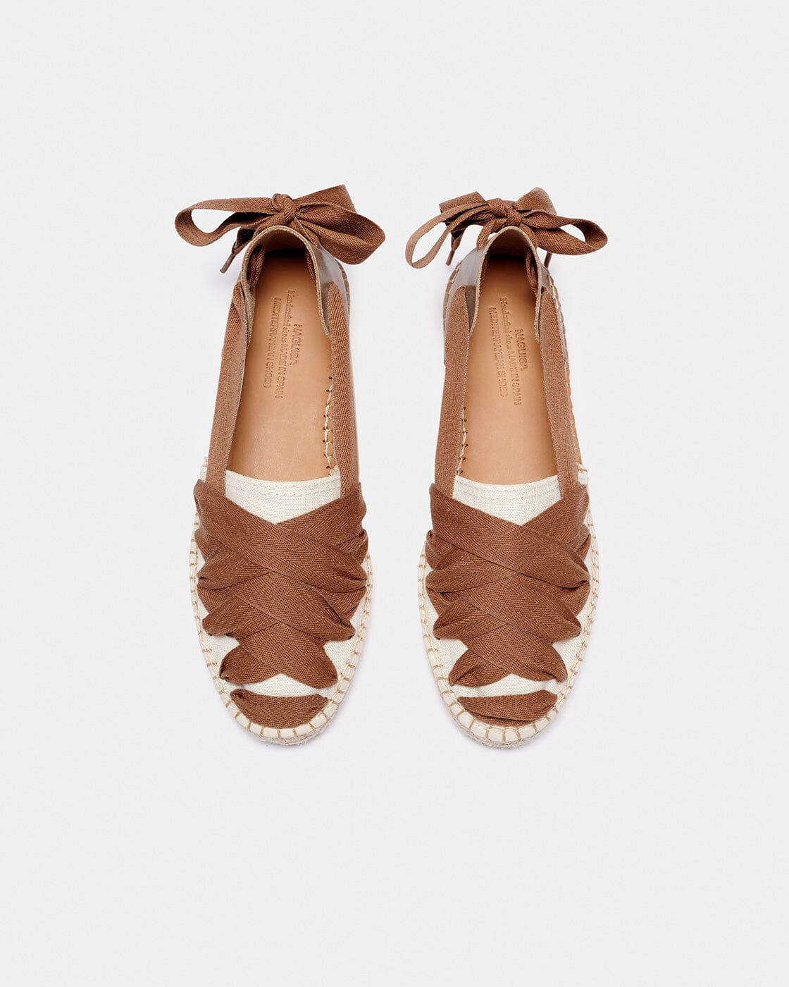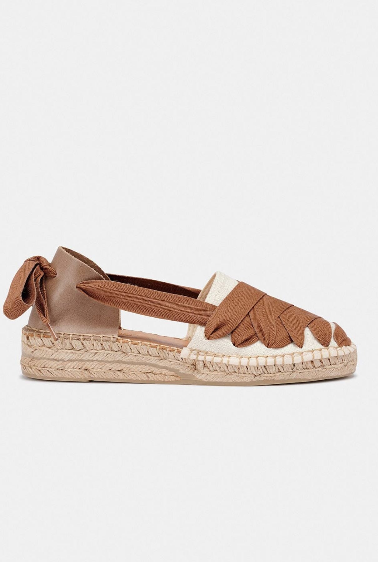 Sukha es una alpargata con cintas. La parte superior, así como las tiras, son de algodón y el tacón es de piel de vacuno. Forro de piel. La suela está acolchada con espuma y forrada con piel de vacuno natural para una mejor transpiración del pie. La suela está hecha con una sencilla trenza de yute, una pequeña cuña para mayor comodidad y una suela de goma antideslizante. La altura total es de 3 cm.