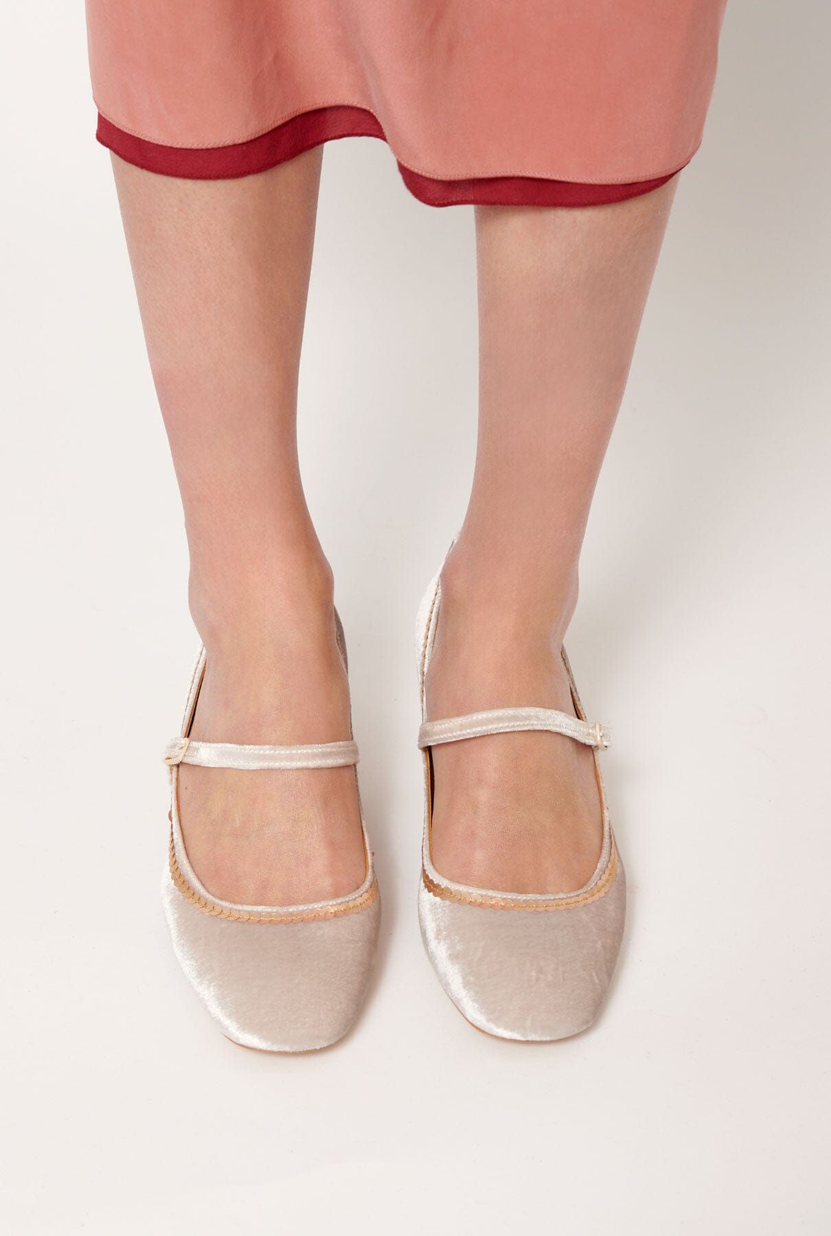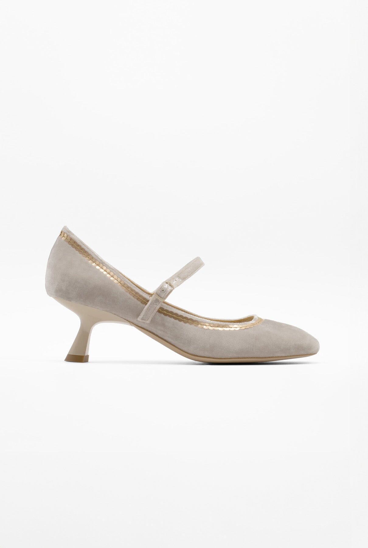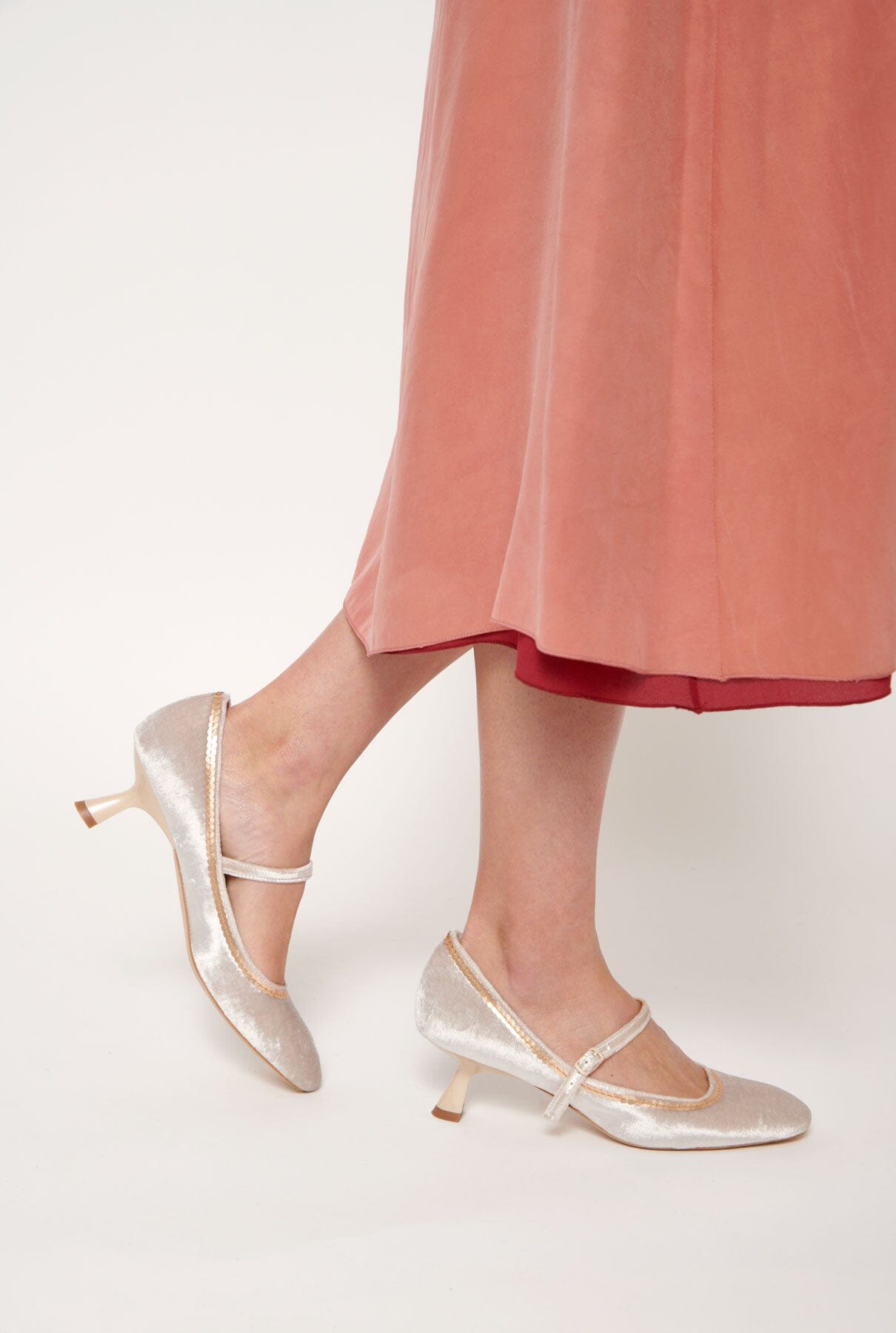 Tacones cerrados en color gris claro diseñados para novias e invitadas, hechos a mano 100% en España.