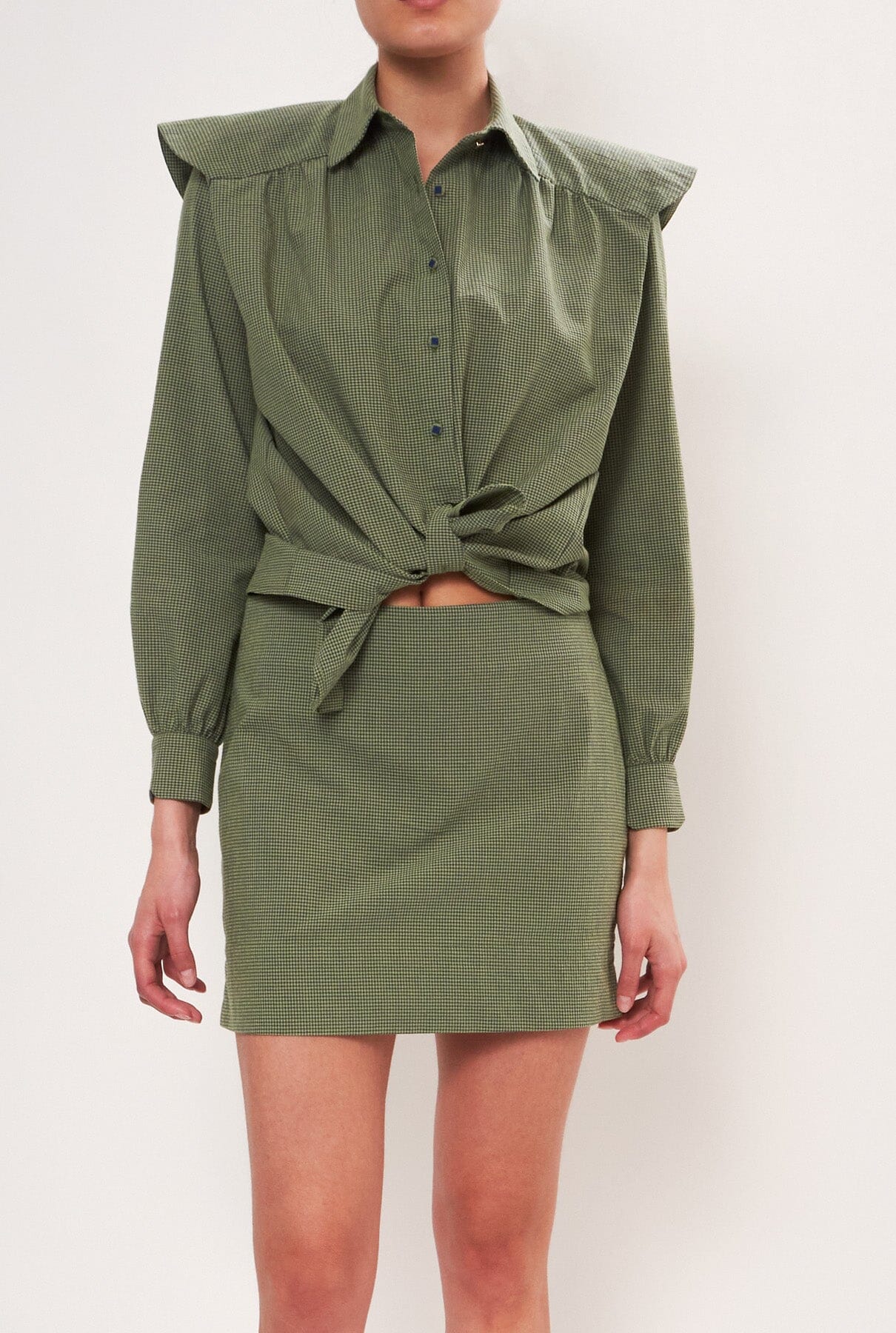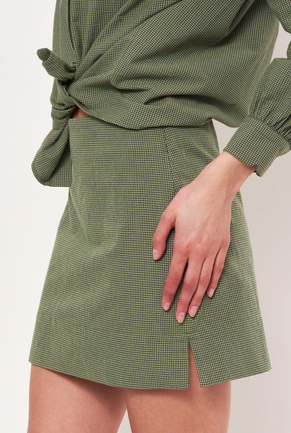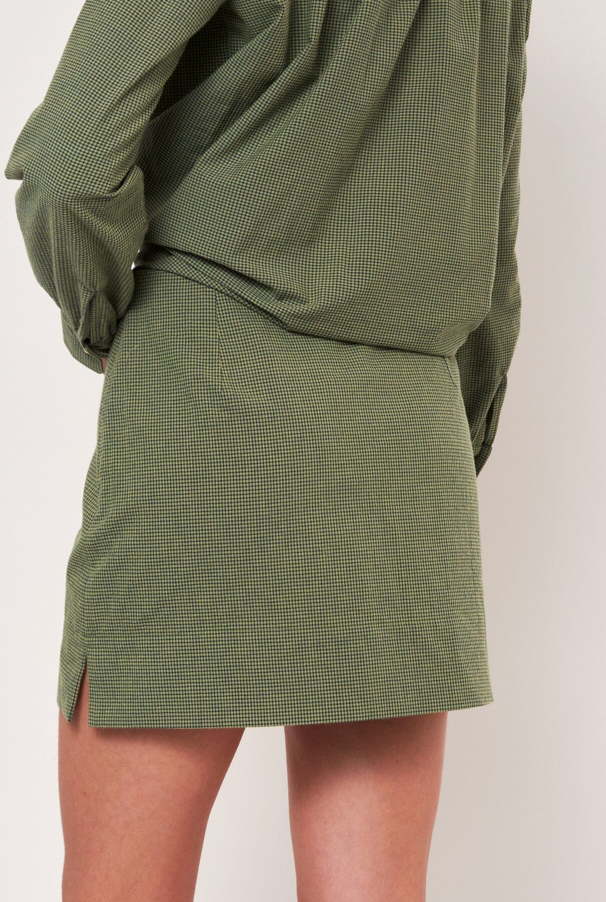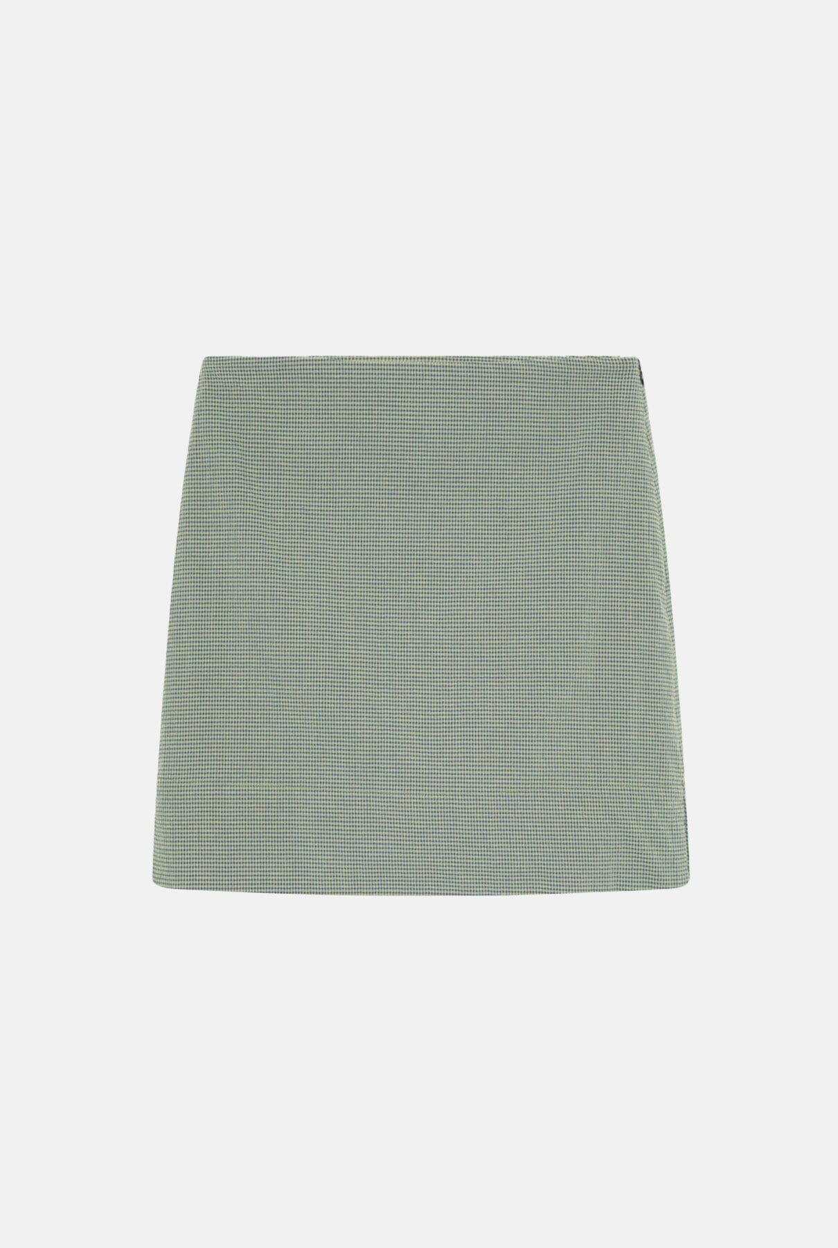Falda mini recta en microvichy verde y azul marino. Con 2 pequeñas aberturas laterales y cierre de cremallera. Para un look completo combínalo con la camisa Miru oliva, Miru sin mangas o Marieta voile azul.