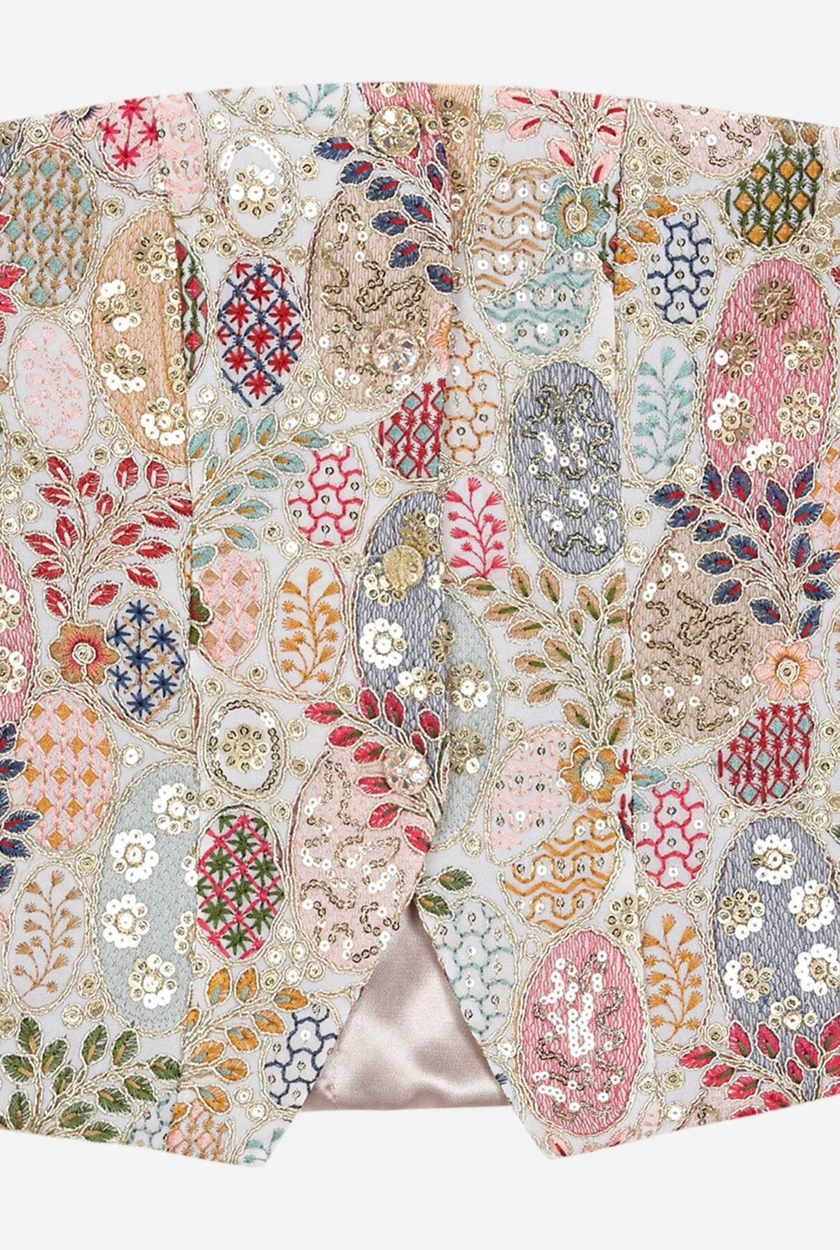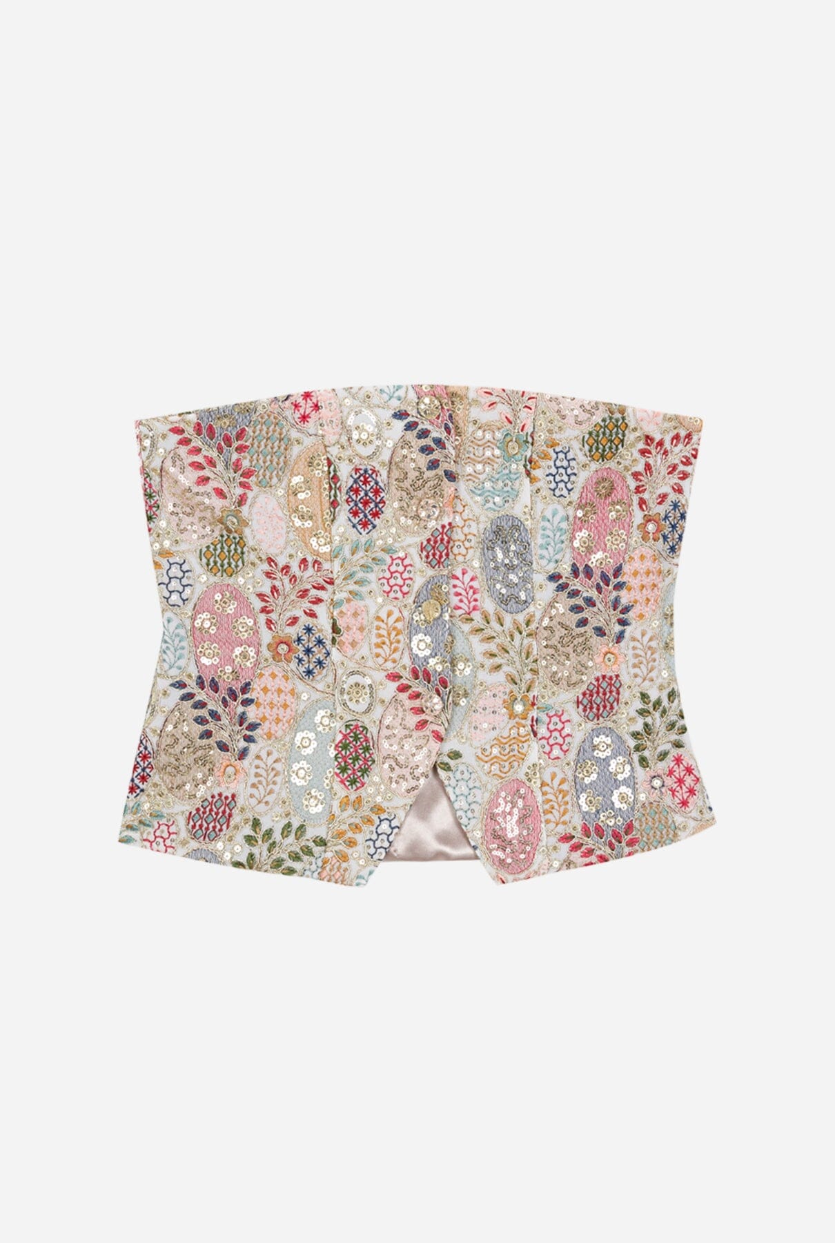 Este diseño LD está confeccionado con tela joya bordada en tonos malva, rosa, dorado y azul. Tiene hombros descubiertos y cierre frontal con botones joya. Incluye lazos interiores. Forrado.