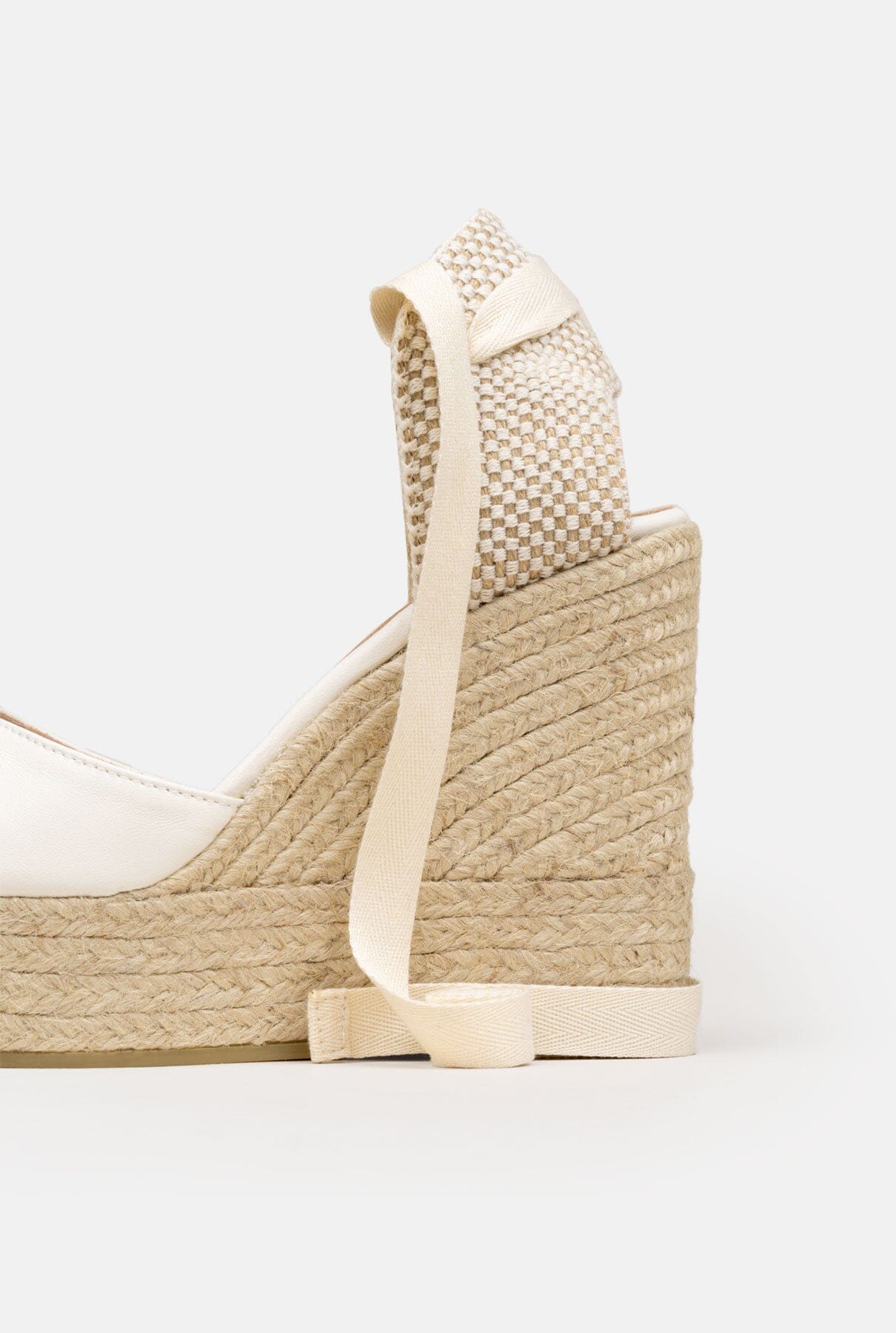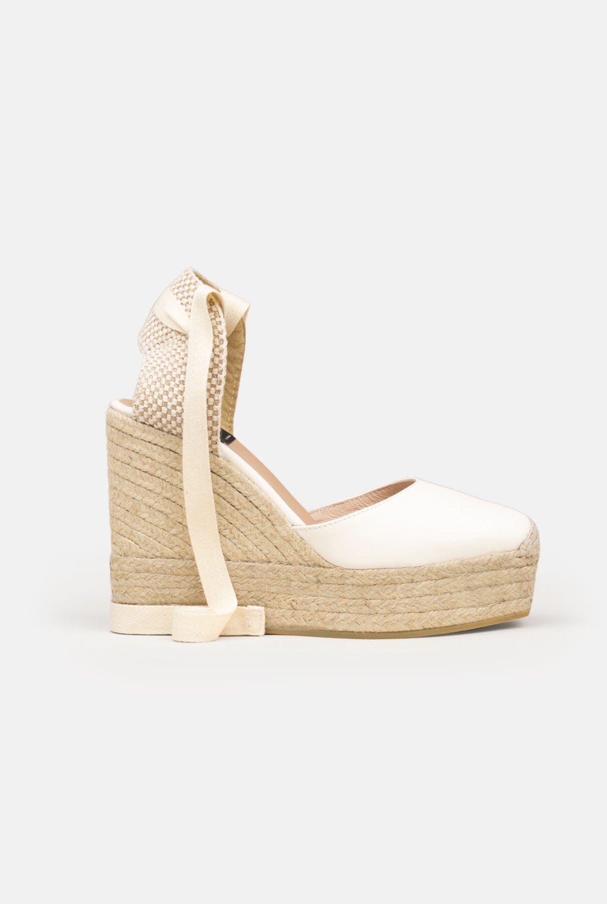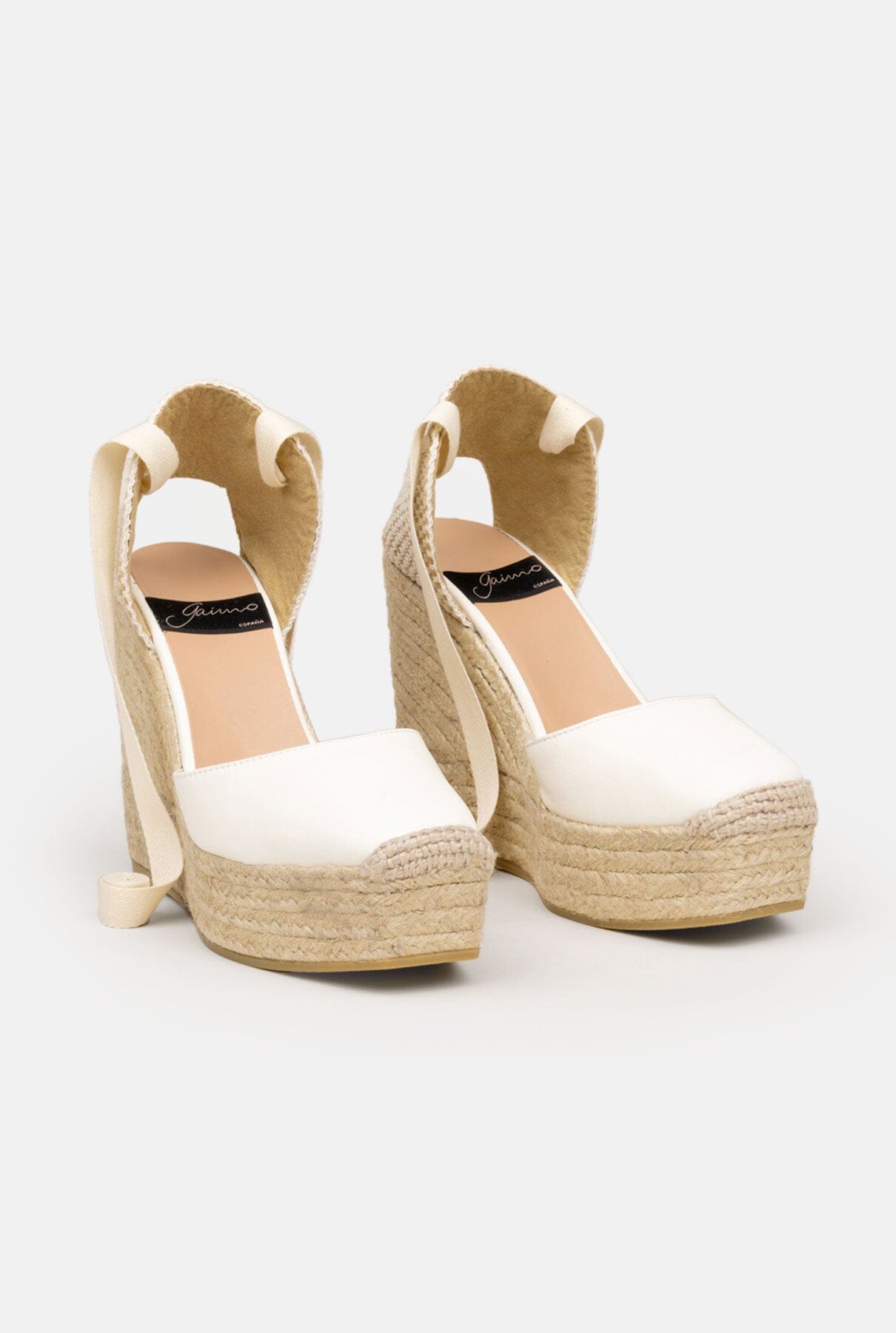 Alpargata de mujer Gaimo en piel. Estilo tedie con pala cerrada de punta cuadrada y tacón con cintas para anudar en el tobillo. Plantilla acolchada de piel y forro con cuña de yute orgánico de 12,5cm y plataforma de 4cm. Diseñados y elaborados tradicionalmente en España, son la elección perfecta para ganar un poco de altura y dar un toque final llamativo a tu look sin renunciar a la comodidad.