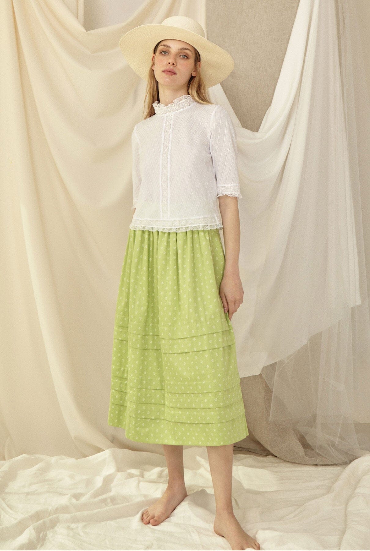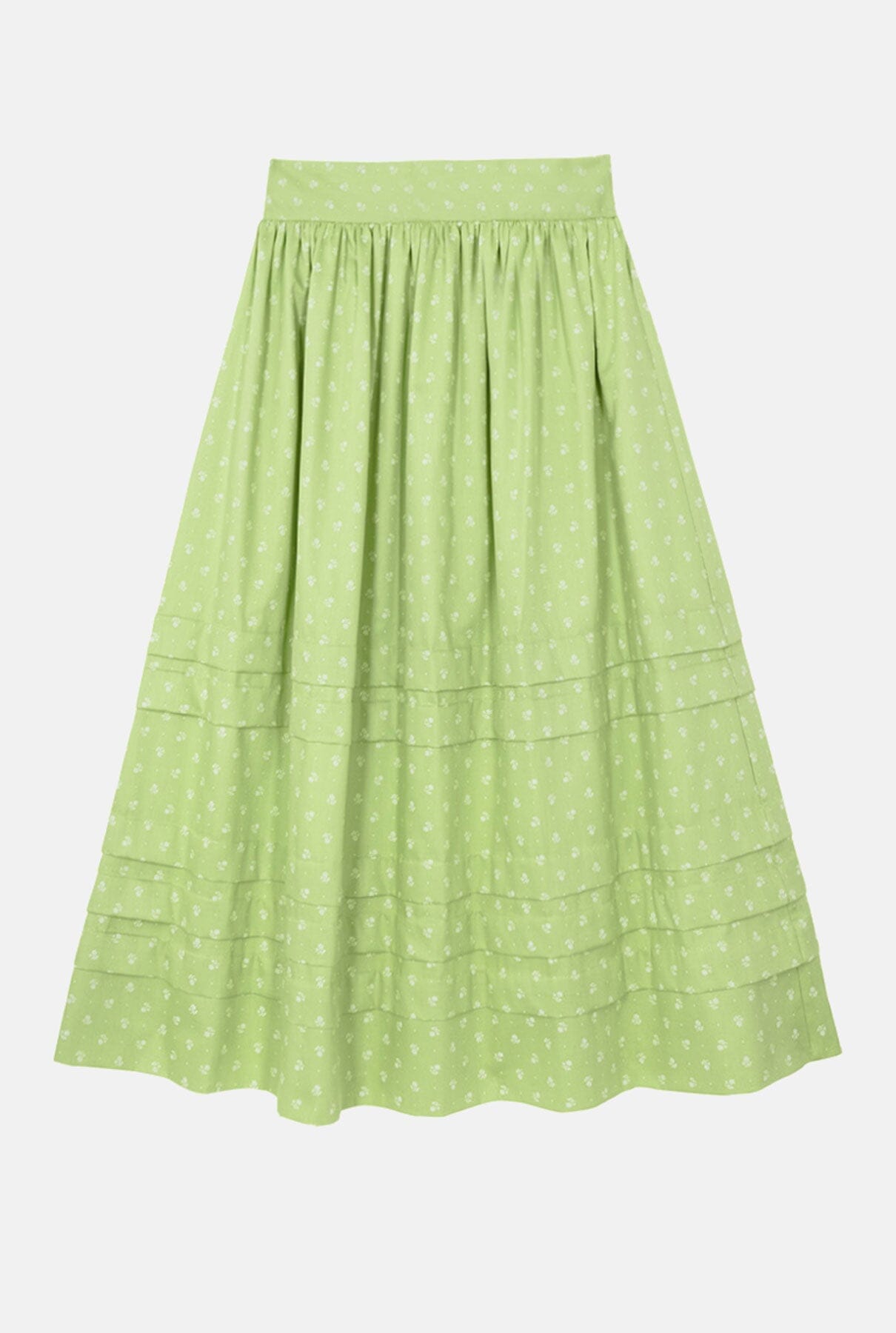 Falda midi verde de algodón con estampado de flores. Con forro de gasa.