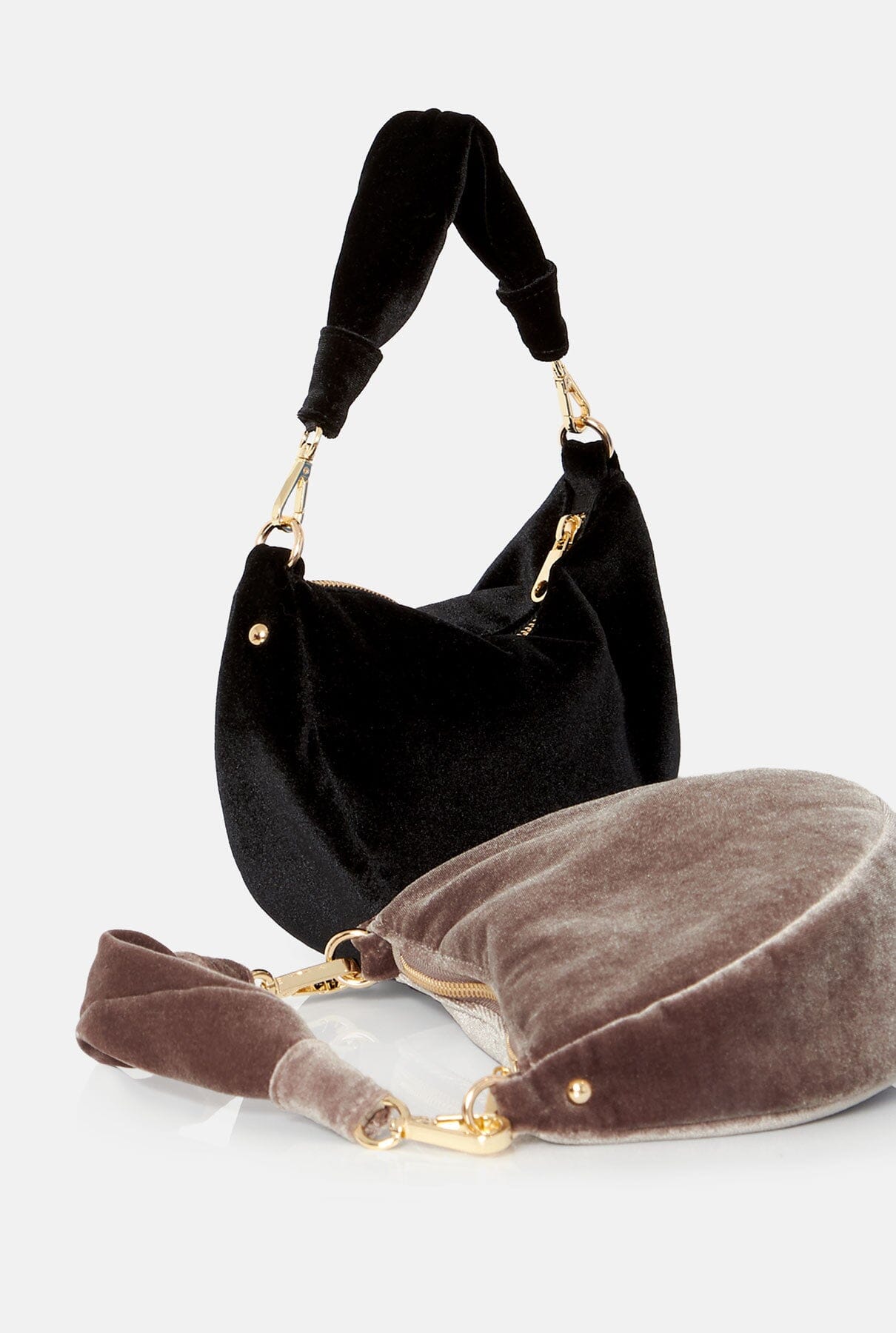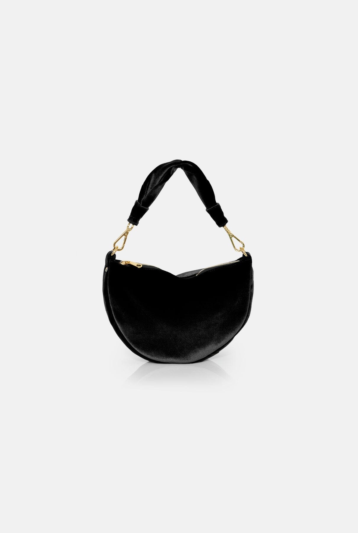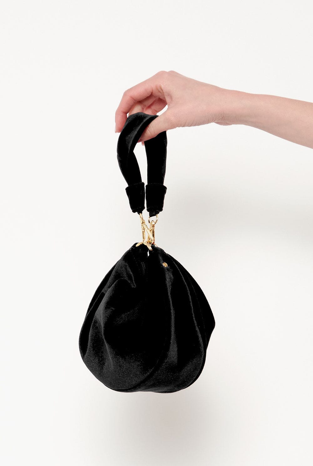 Bolso de terciopelo negro con correa de mano. Bolso suave hecho a mano con terciopelo. Bolsillo interior y cierre de cremallera. Diseñado por The Bag Lab.
