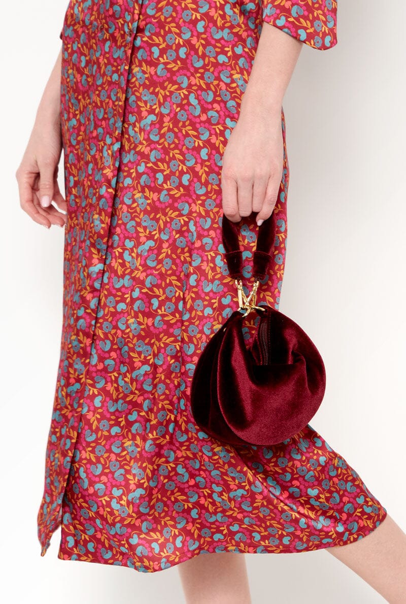 Bolso de terciopelo burdeos con correa de mano. Bolso suave hecho a mano con terciopelo. Bolsillo interior y cierre de cremallera. Diseñado por The Bag Lab.