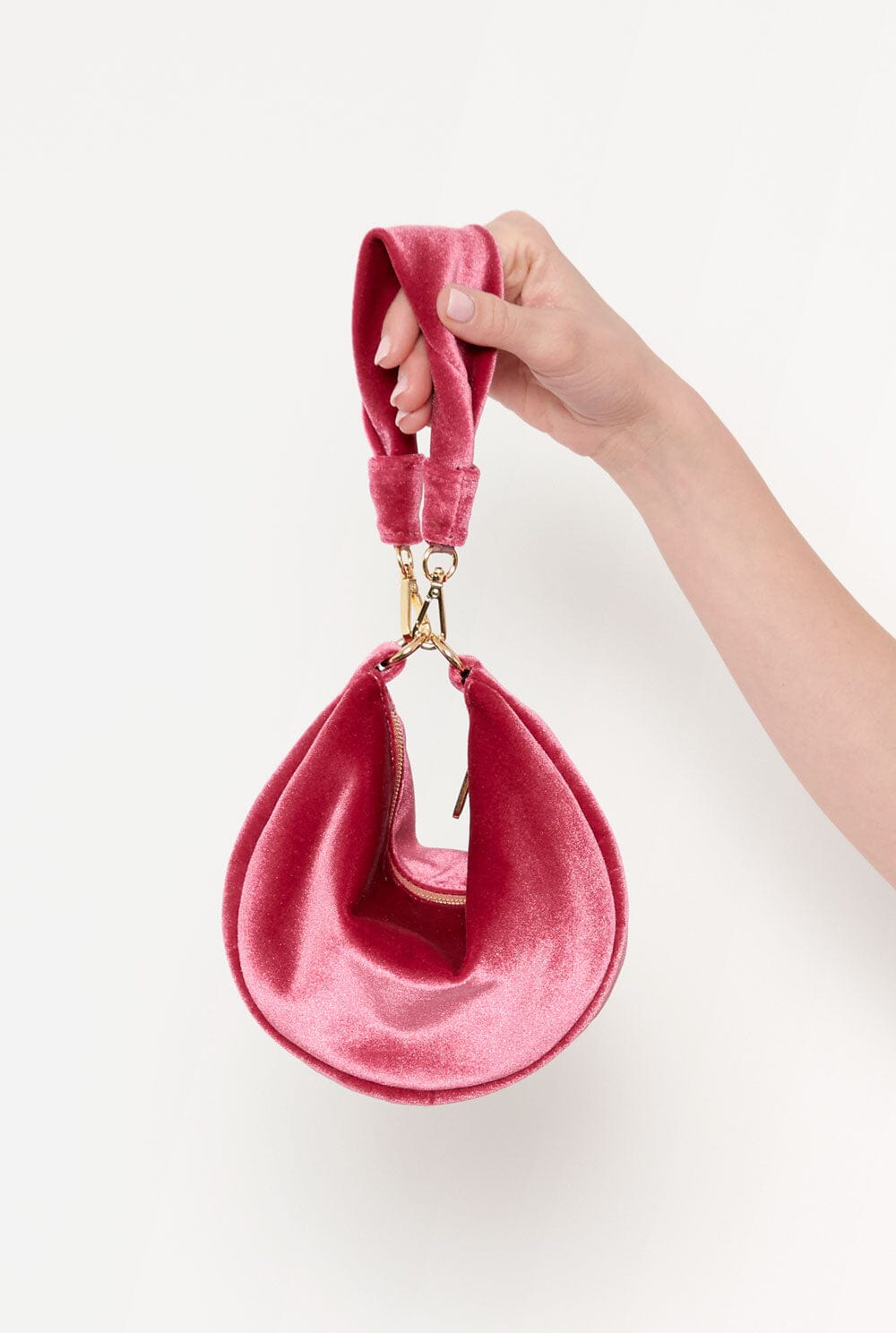Bolso de terciopelo rosa con correa de mano. Bolso suave hecho a mano con terciopelo. Bolsillo interior y cierre de cremallera. Diseñado por The Bag Lab.