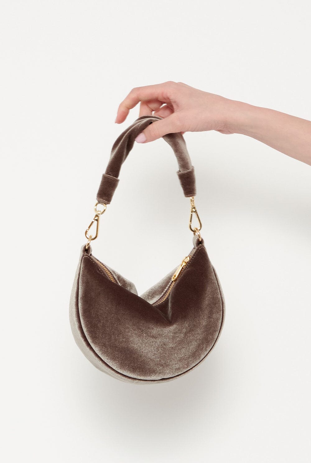 Bolso de terciopelo color topo con asa de mano. Bolso suave hecho a mano con terciopelo. Bolsillo interior y cierre de cremallera. Diseñado por The Bag Lab.