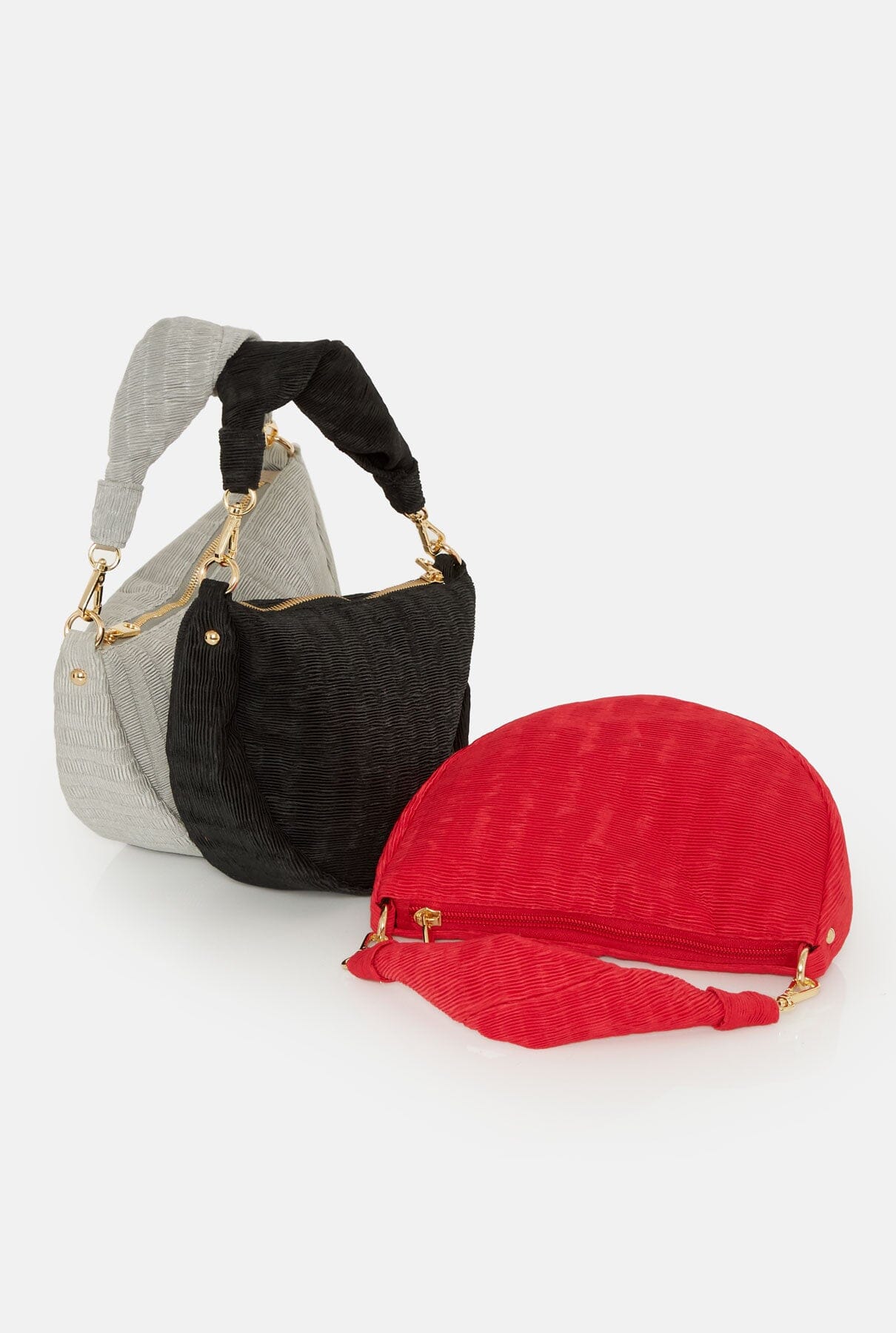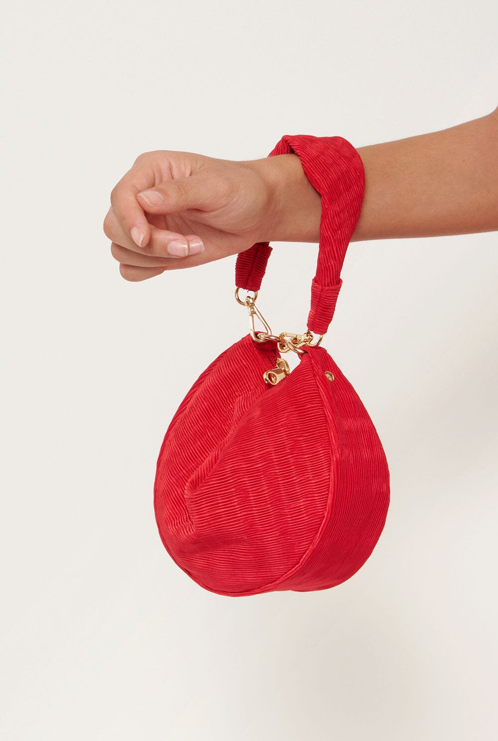 Bolso de satén plisado con asa de mano. Cierre de cremallera y bolsillo interior. Cadena dorada opcional con 2 mosquetones. Diseñado por The Bag Lab.