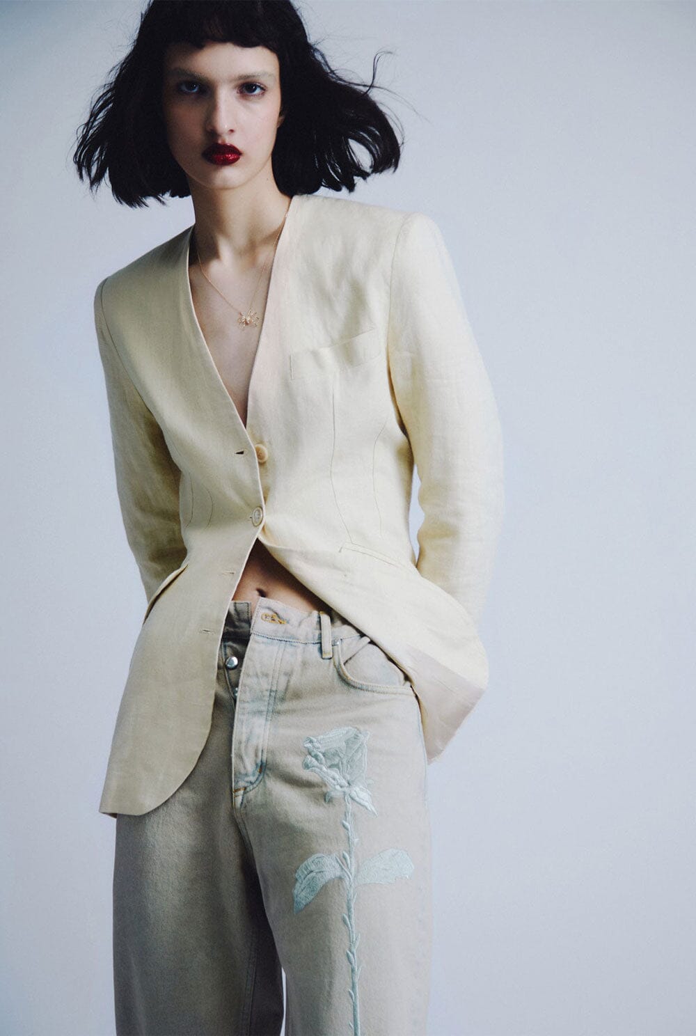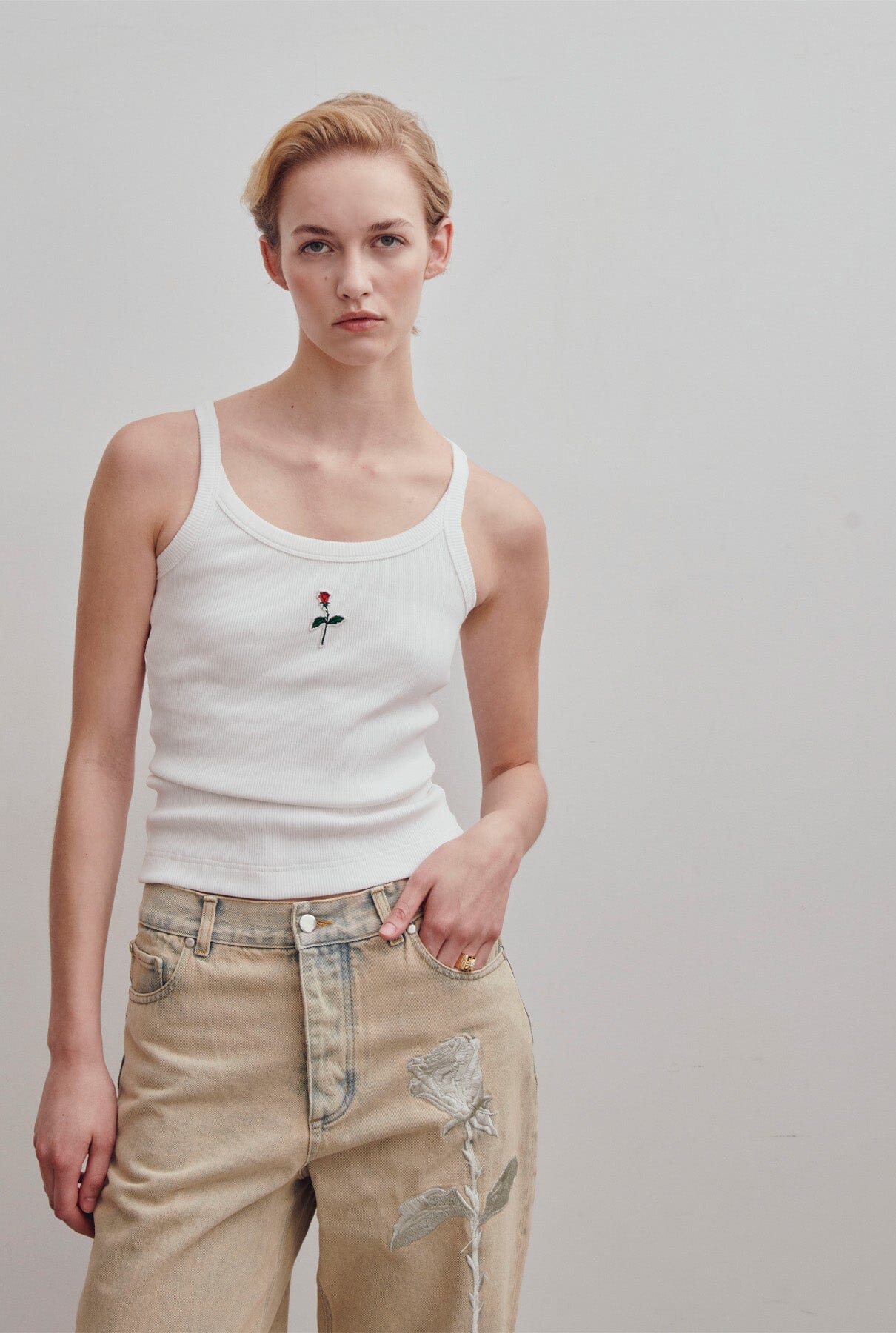 Nuestra icónica rosa bordada en la pierna delantera. Cremallera con botones metálicos.