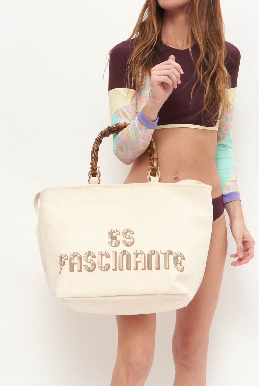 Bolso de lona artesanal con clutch adicional desmontable con cremallera en el interior. Dos asas de bambú y una bandolera de algodón. Diseñado por The Bag Lab.