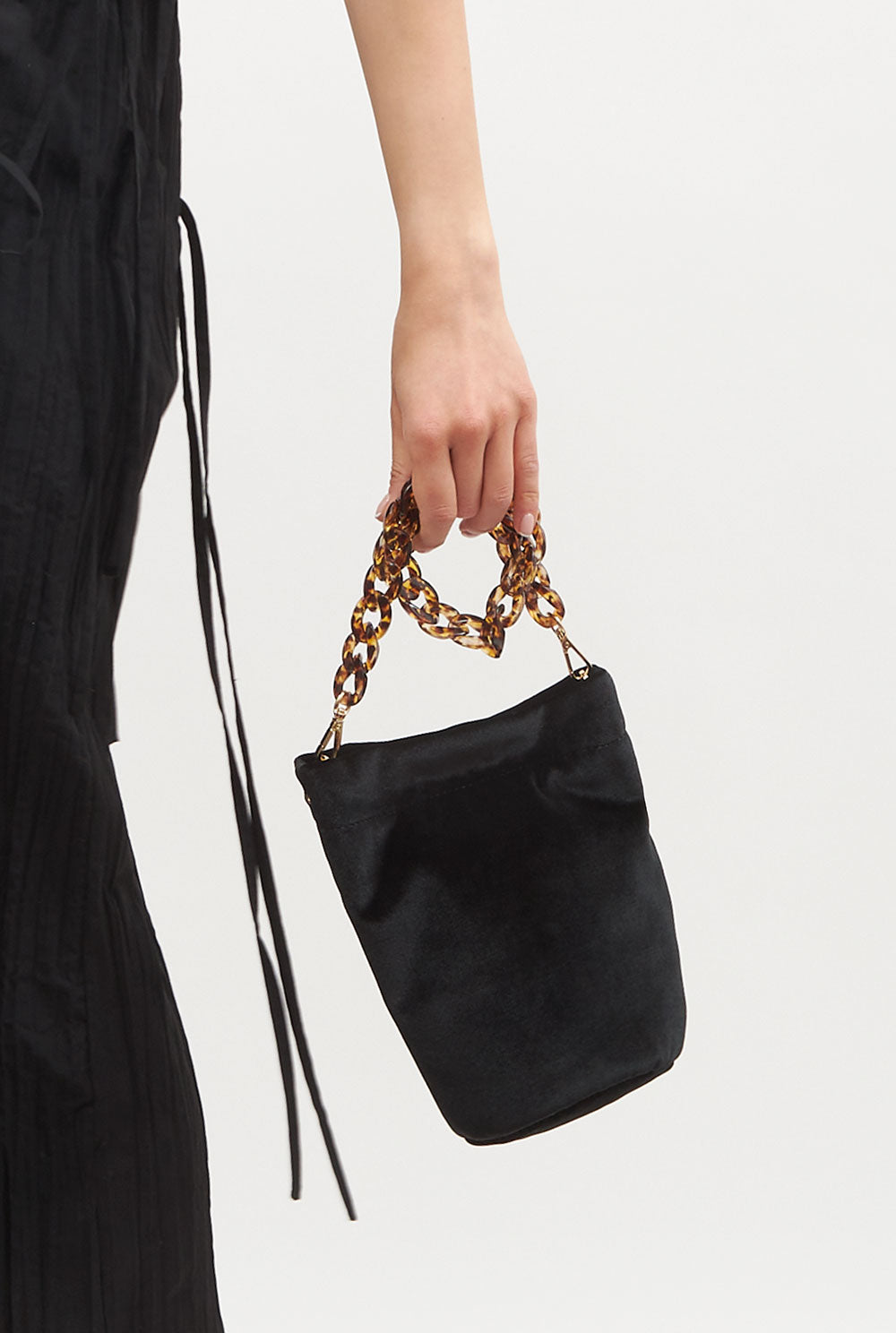 Bolso suave hecho a mano con terciopelo. Bolsillo interior y cierre a presión. Cadena desmontable de resina a juego con 2 ganchos. Diseñado por The Bag Lab.