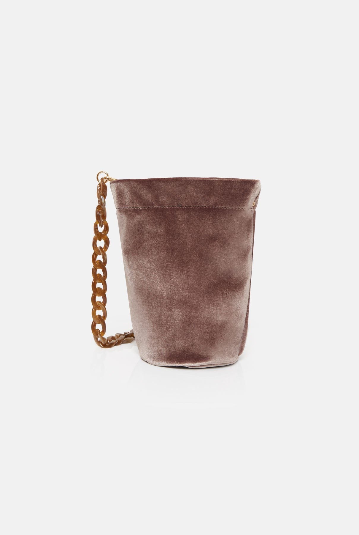 Bolso suave hecho a mano con terciopelo. Bolsillo interior y cierre a presión. Cadena desmontable de resina a juego con 2 ganchos. Diseñado por The Bag Lab.
