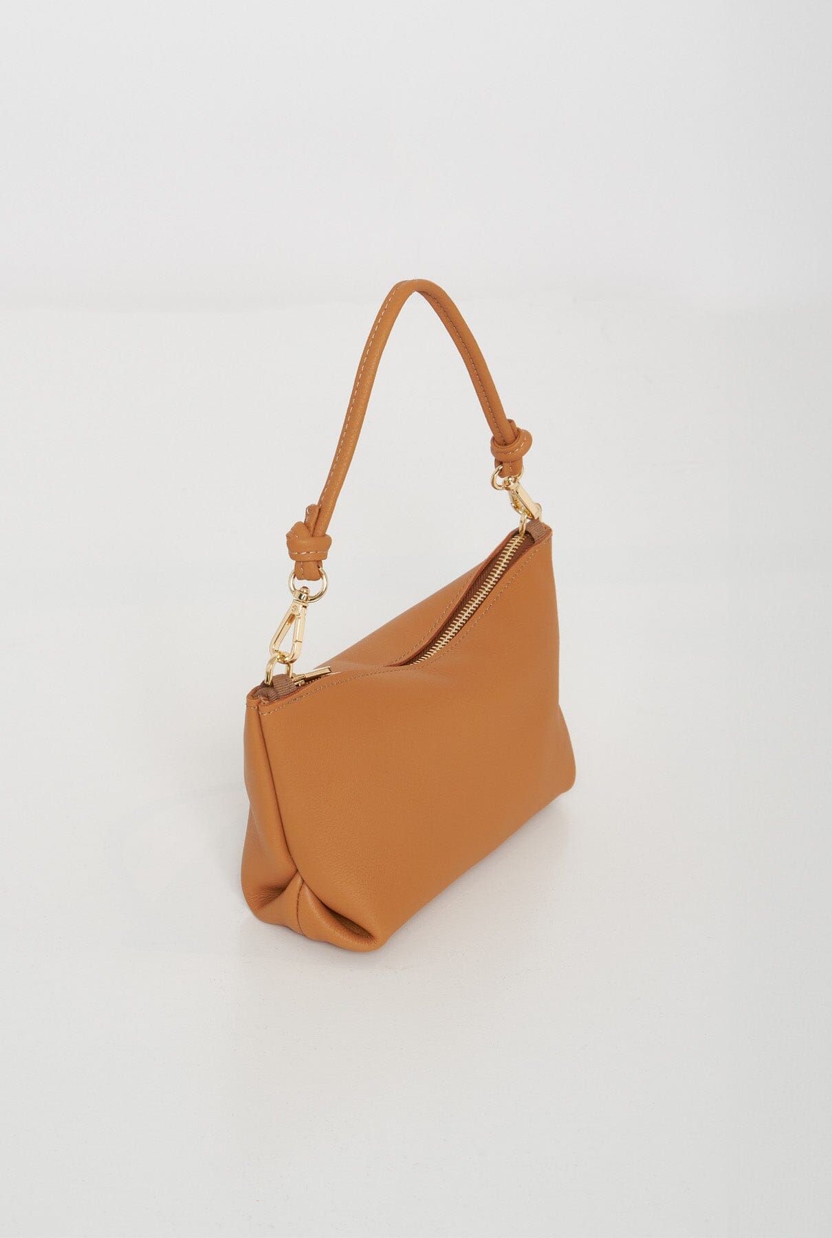 Bolso blando elaborado artesanalmente con piel de vacuno, cierre de cremallera y asa de piel.