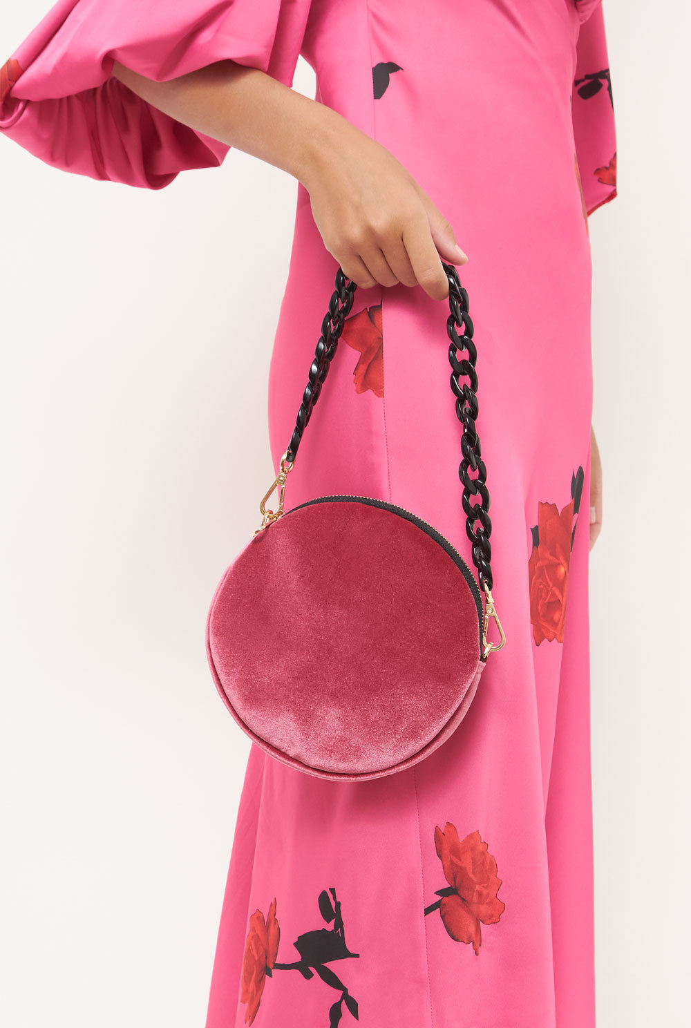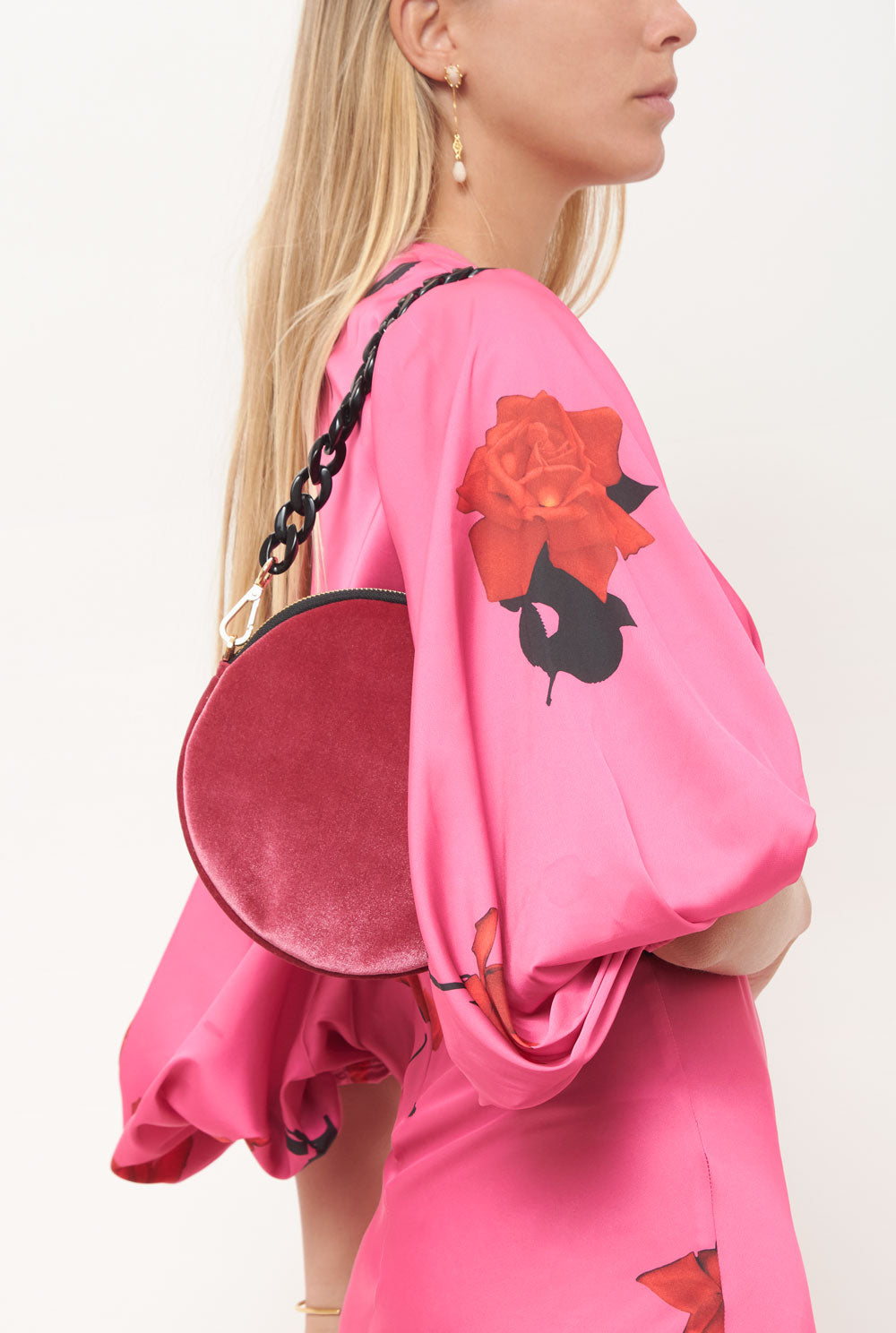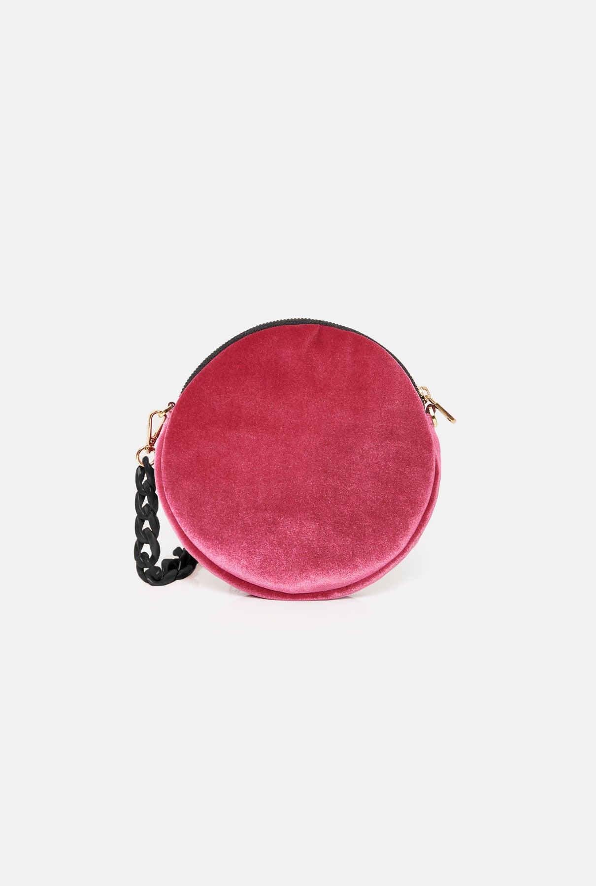 Bolso blando artesanal con cremallera hecho con Terciopelo. Bolsillo interior y cadena de resina desmontable con 2 ganchos. Diseñado por The Bag Lab.