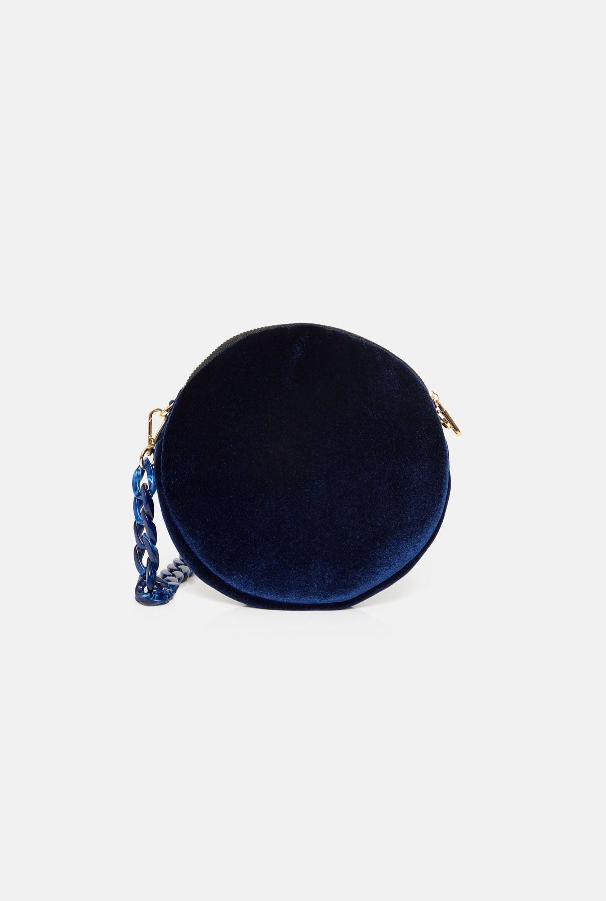Bolso redondo con cremallera hecho a mano con terciopelo. Bolsillo interior . Cadena desmontable de resina a juego con 2 ganchos. Diseñado por The Bag Lab.