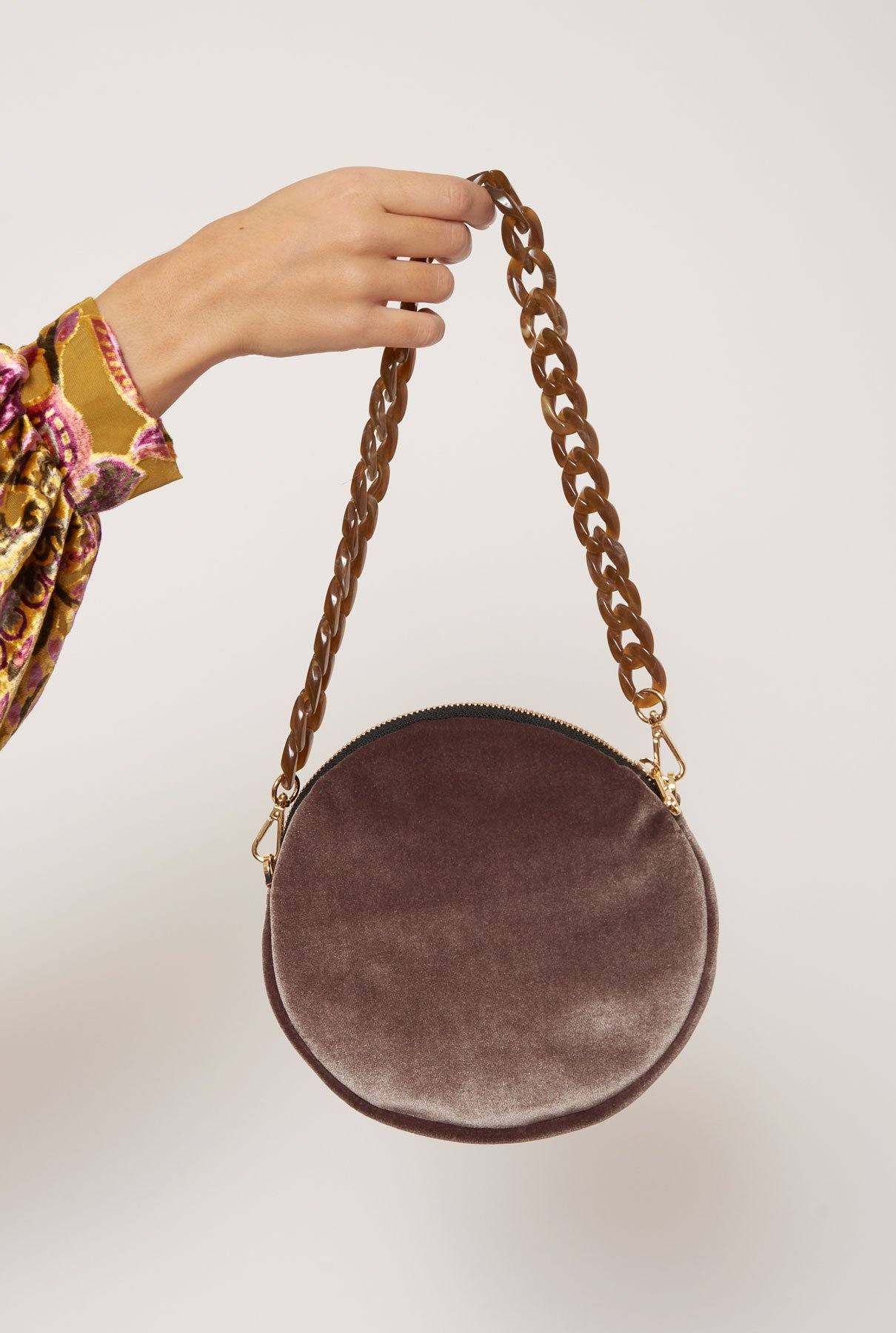 Bolso redondo con cremallera hecho a mano con terciopelo. Bolsillo interior . Cadena desmontable de resina a juego con 2 ganchos. Diseñado por The Bag Lab.