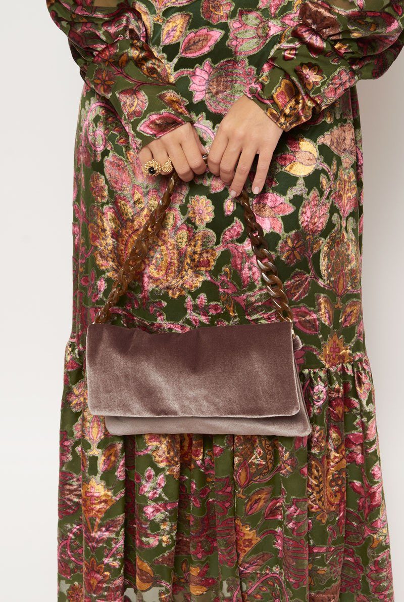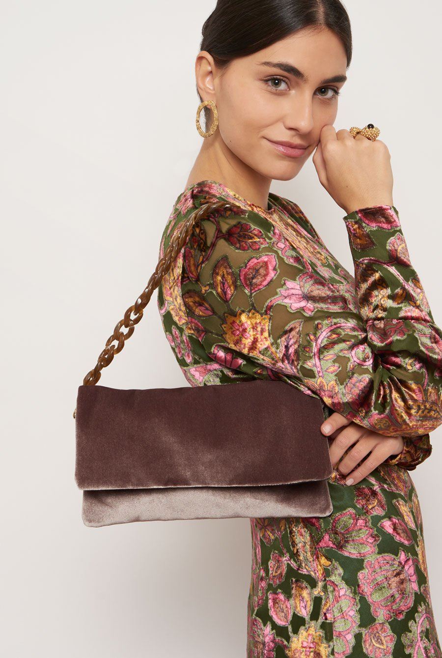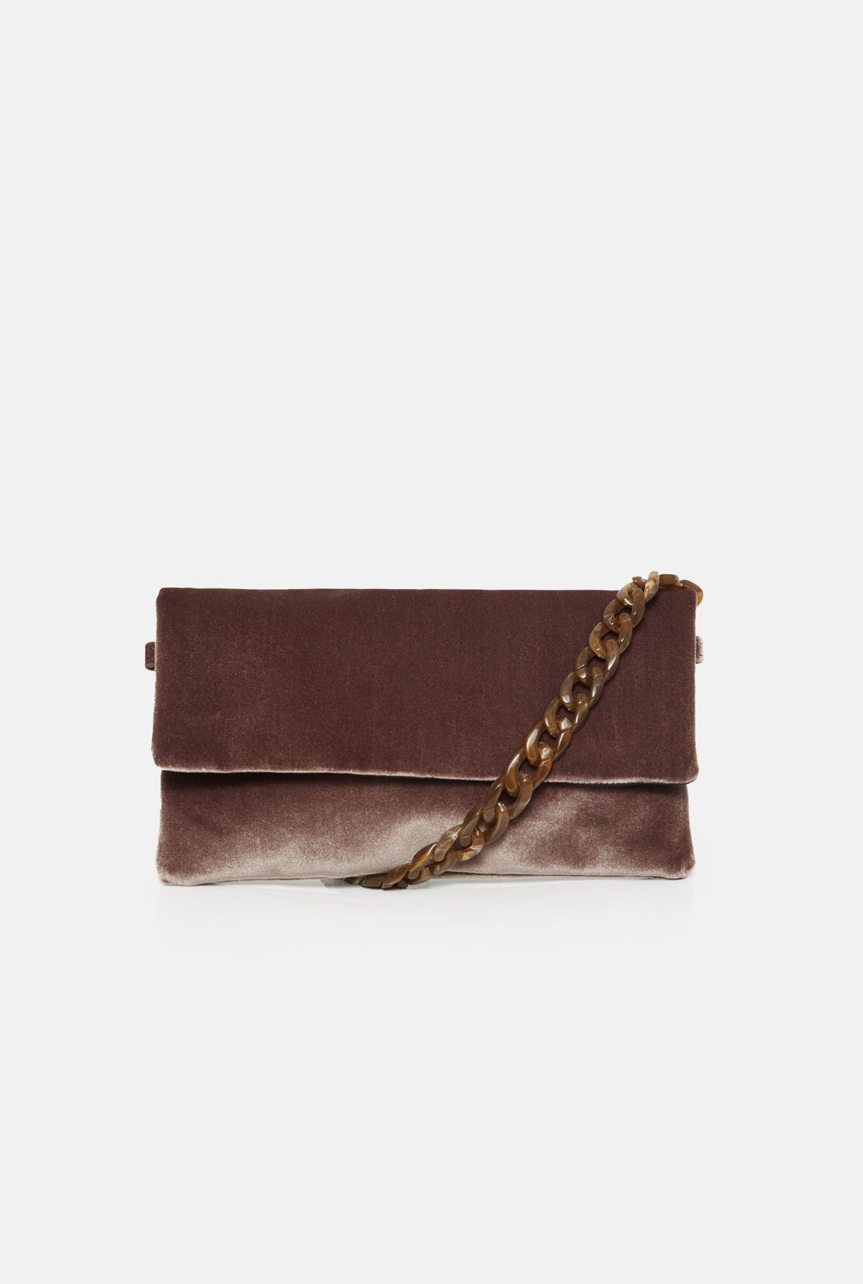 Bolso suave hecho a mano con solapa de terciopelo. Bolsillo interior y cierre de imán. Cadena desmontable de resina a juego con 2 ganchos. Diseñado por The Bag Lab.