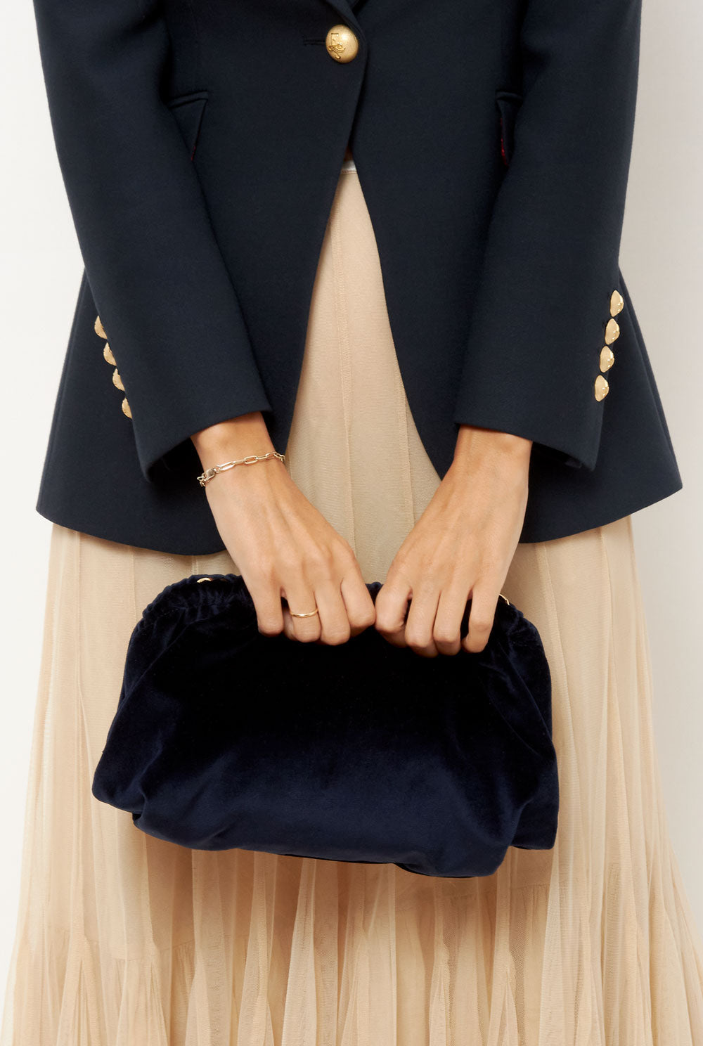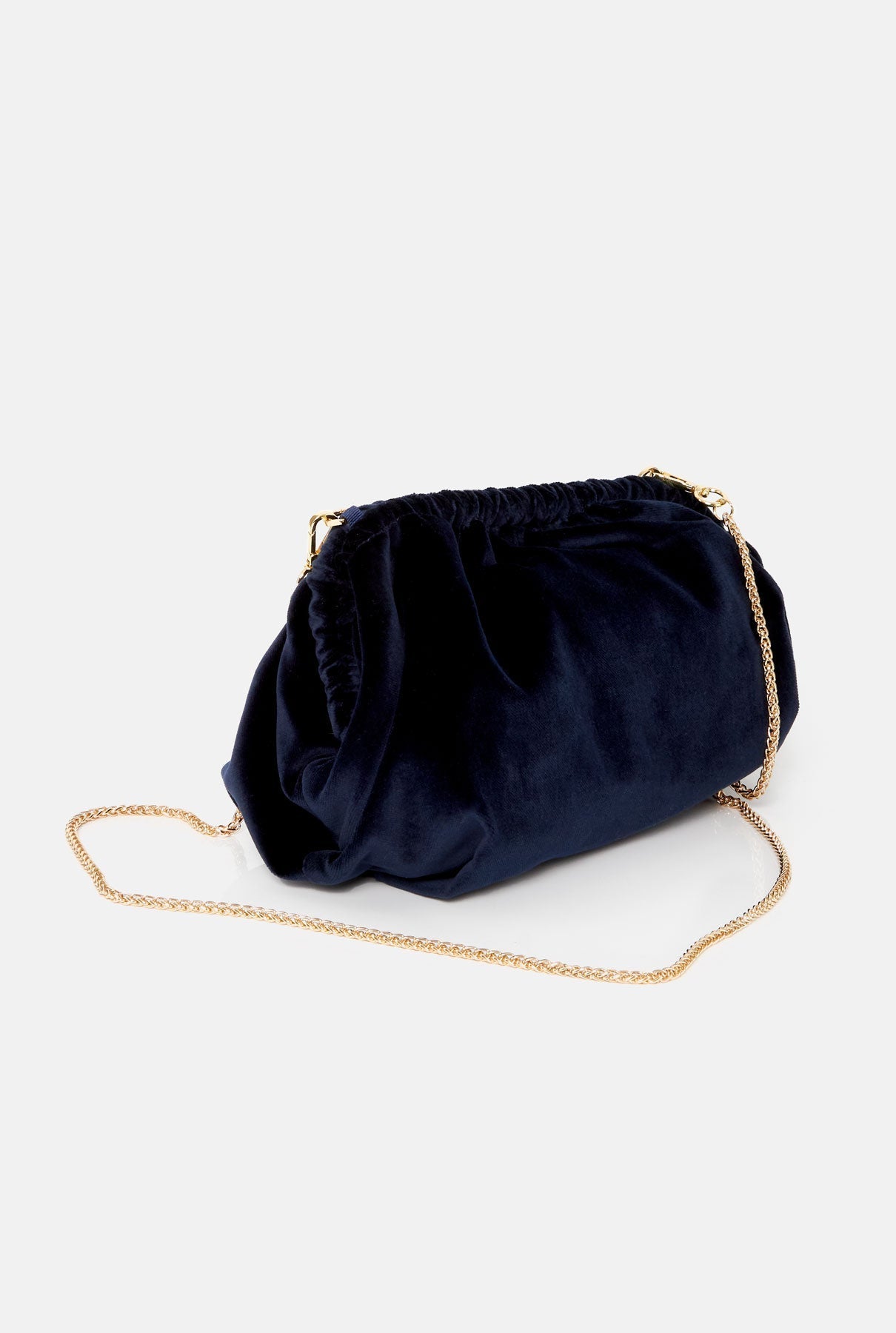 Bolso blando artesanal hecho con Terciopelo. Bolsillo interior y cierre a presión. Cadena dorada desmontable con 2 ganchos. Diseñado por The Bag Lab.