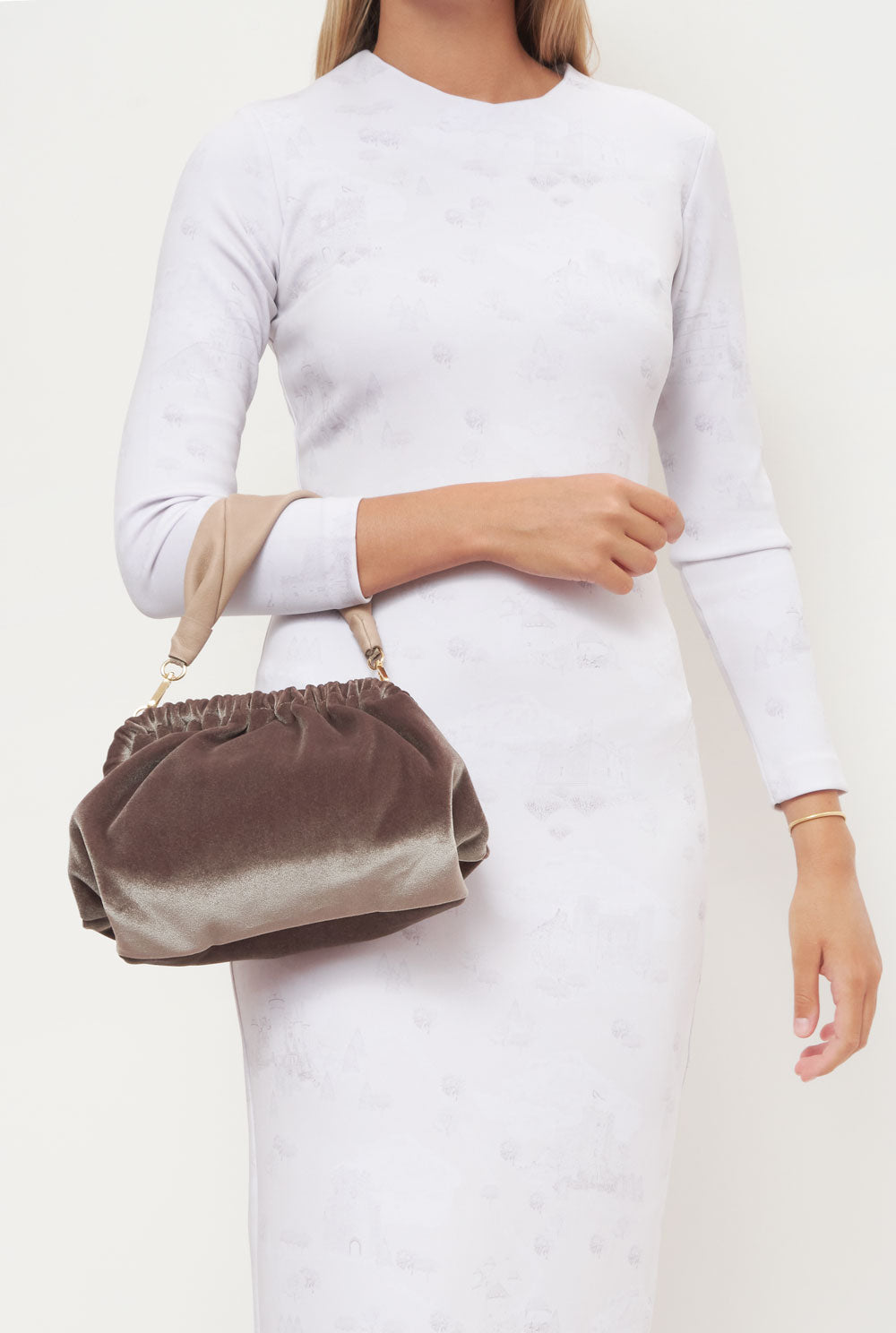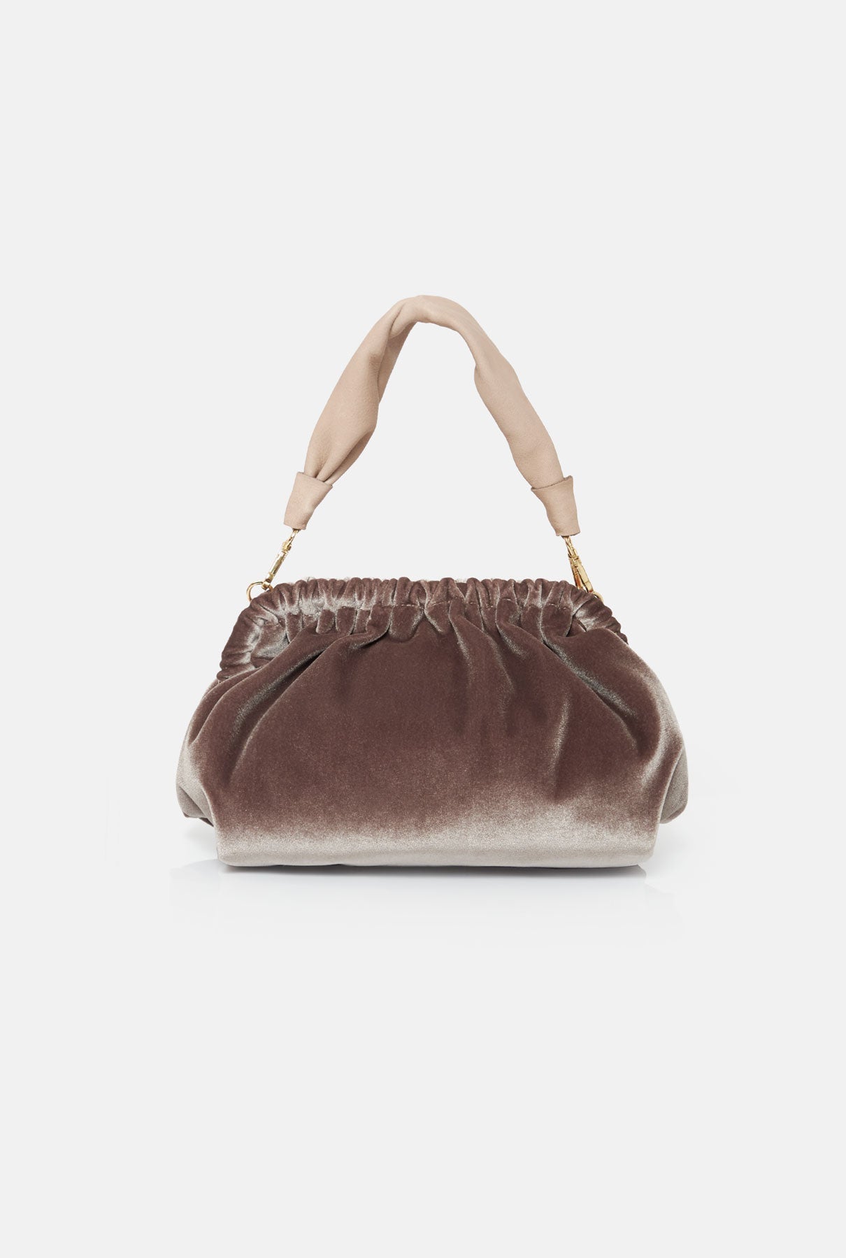 Bolso blando artesanal hecho con Terciopelo. Bolsillo interior y cierre a presión. Cadena dorada desmontable con 2 ganchos. Diseñado por The Bag Lab.