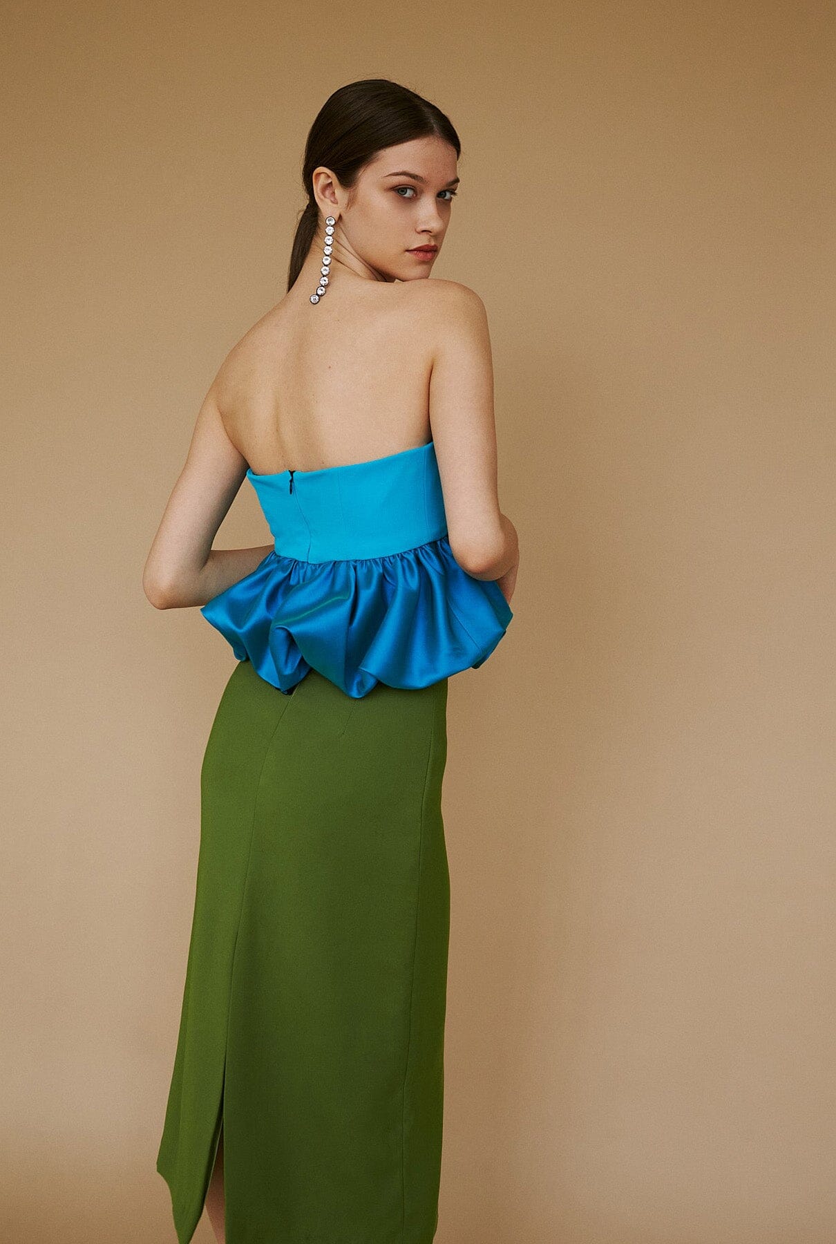 Top en crepe azul y volante de raso del mismo color. Tirantes finos. Se puede combinar con la falda verde.