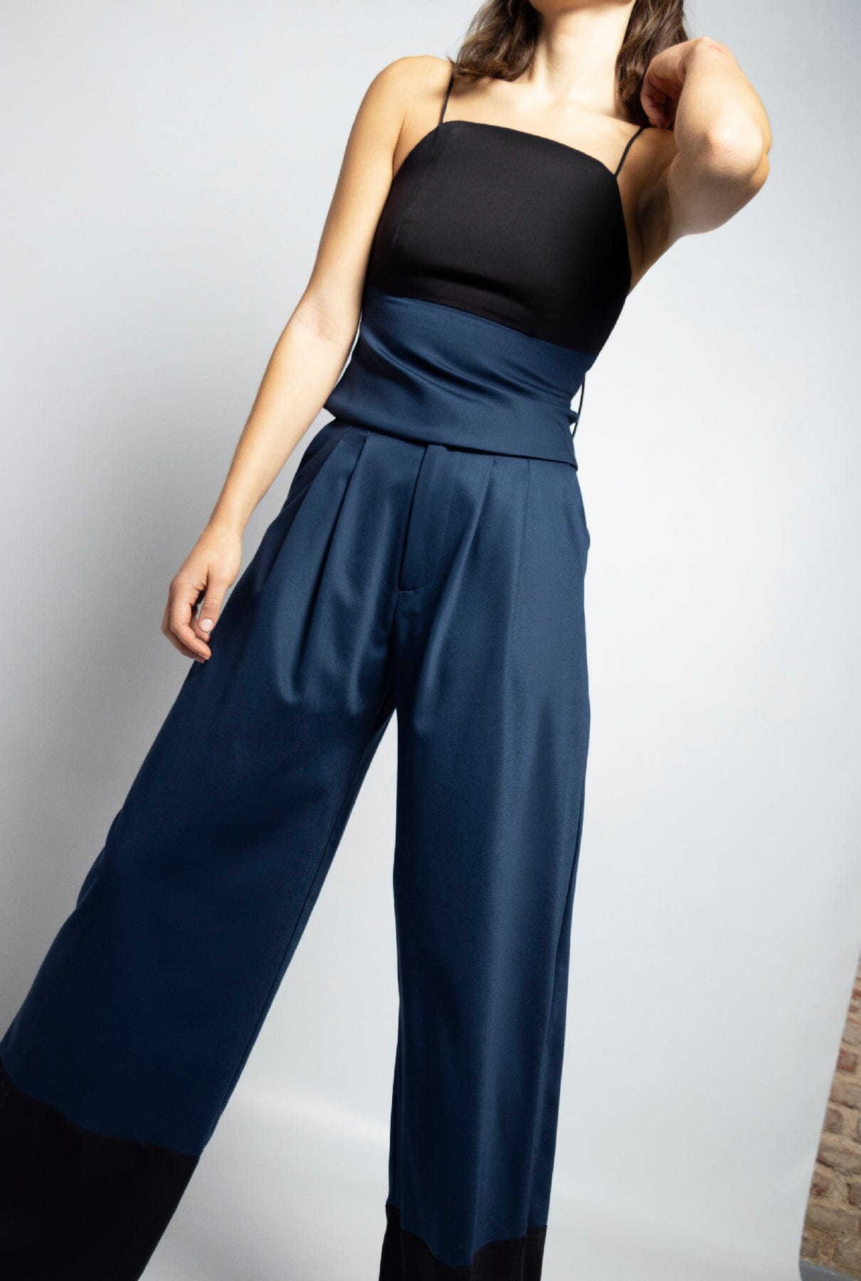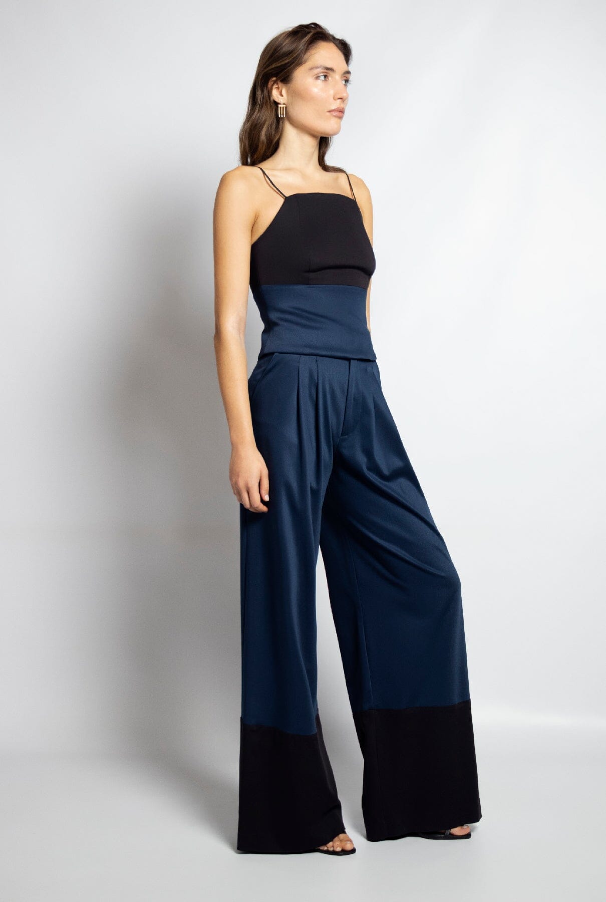 Bustier bicolor con corte bajo el pecho. El escote es ligeramente elevado y la falda ligeramente acampanada. Se puede llevar con o sin tirantes.