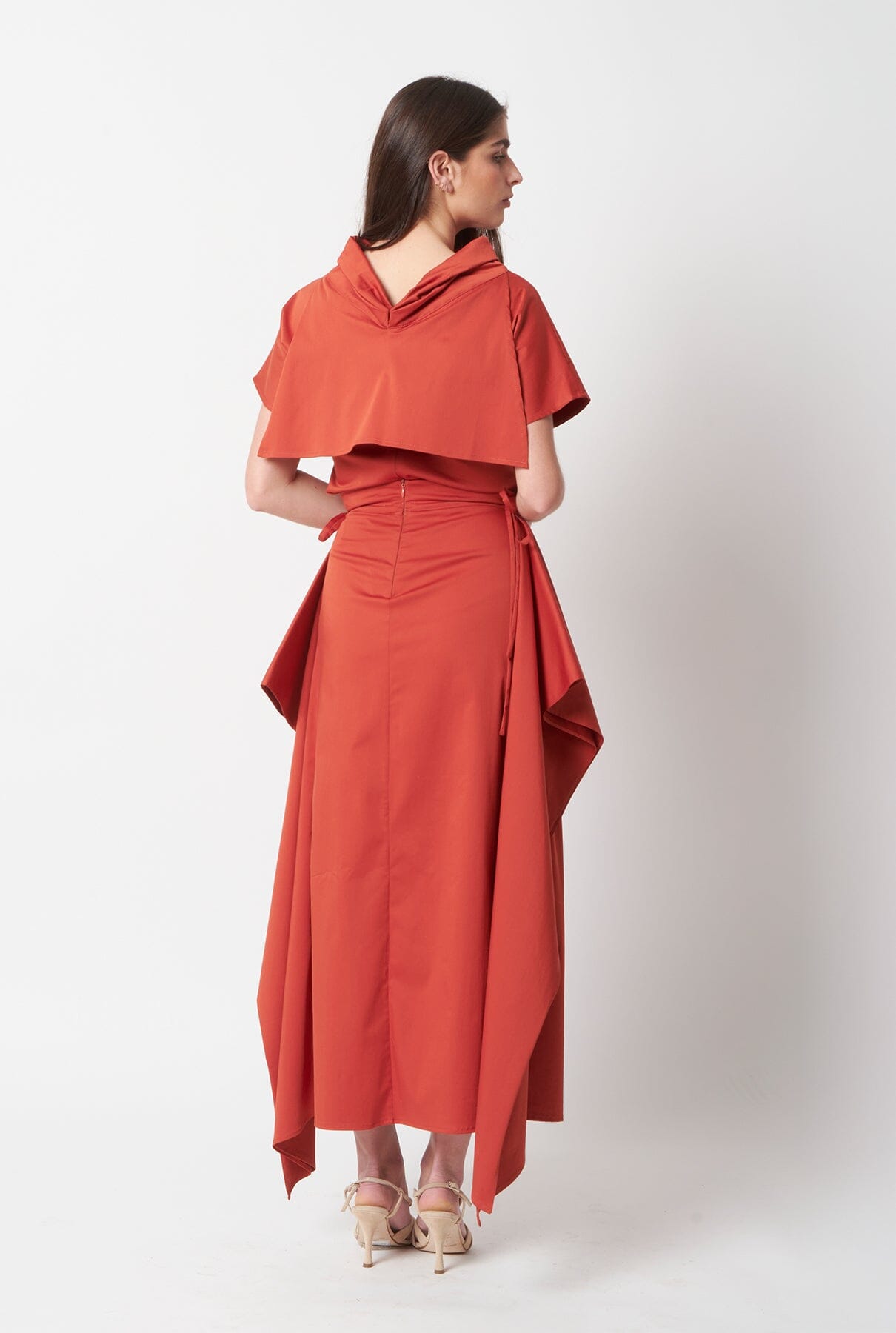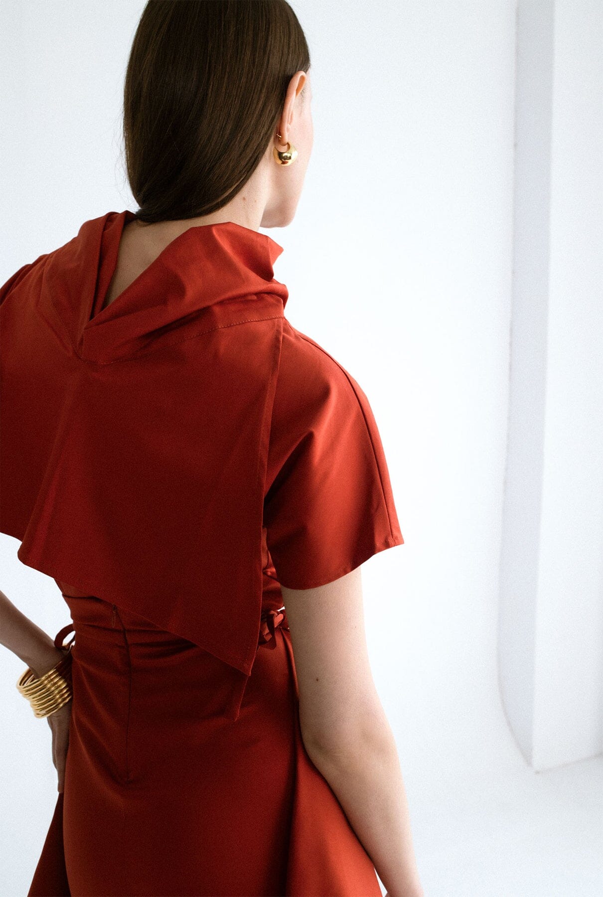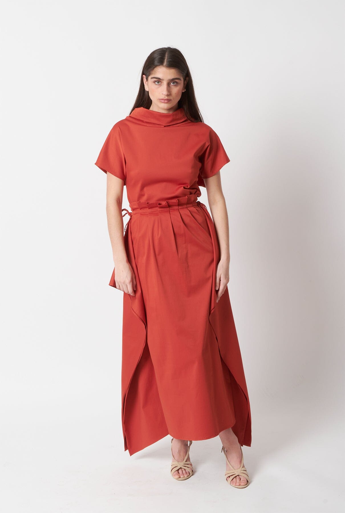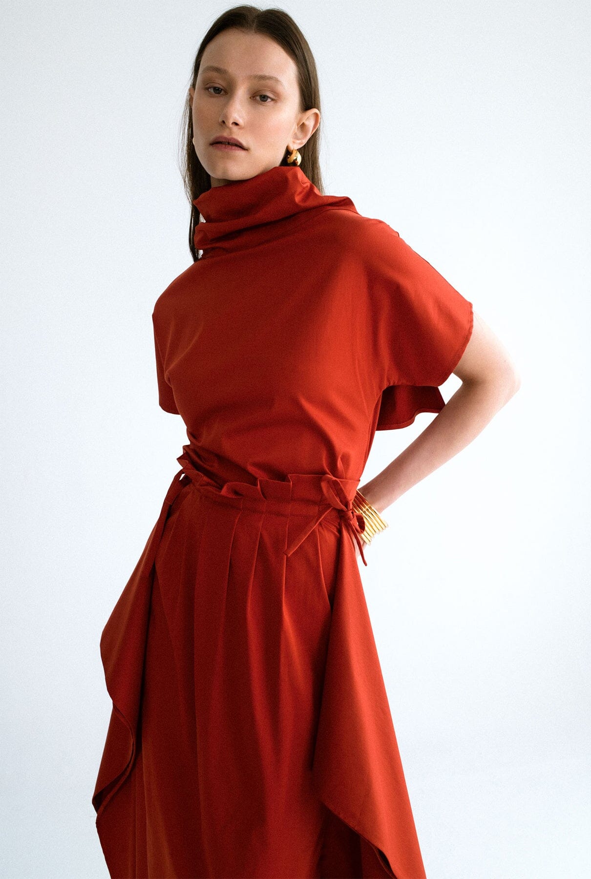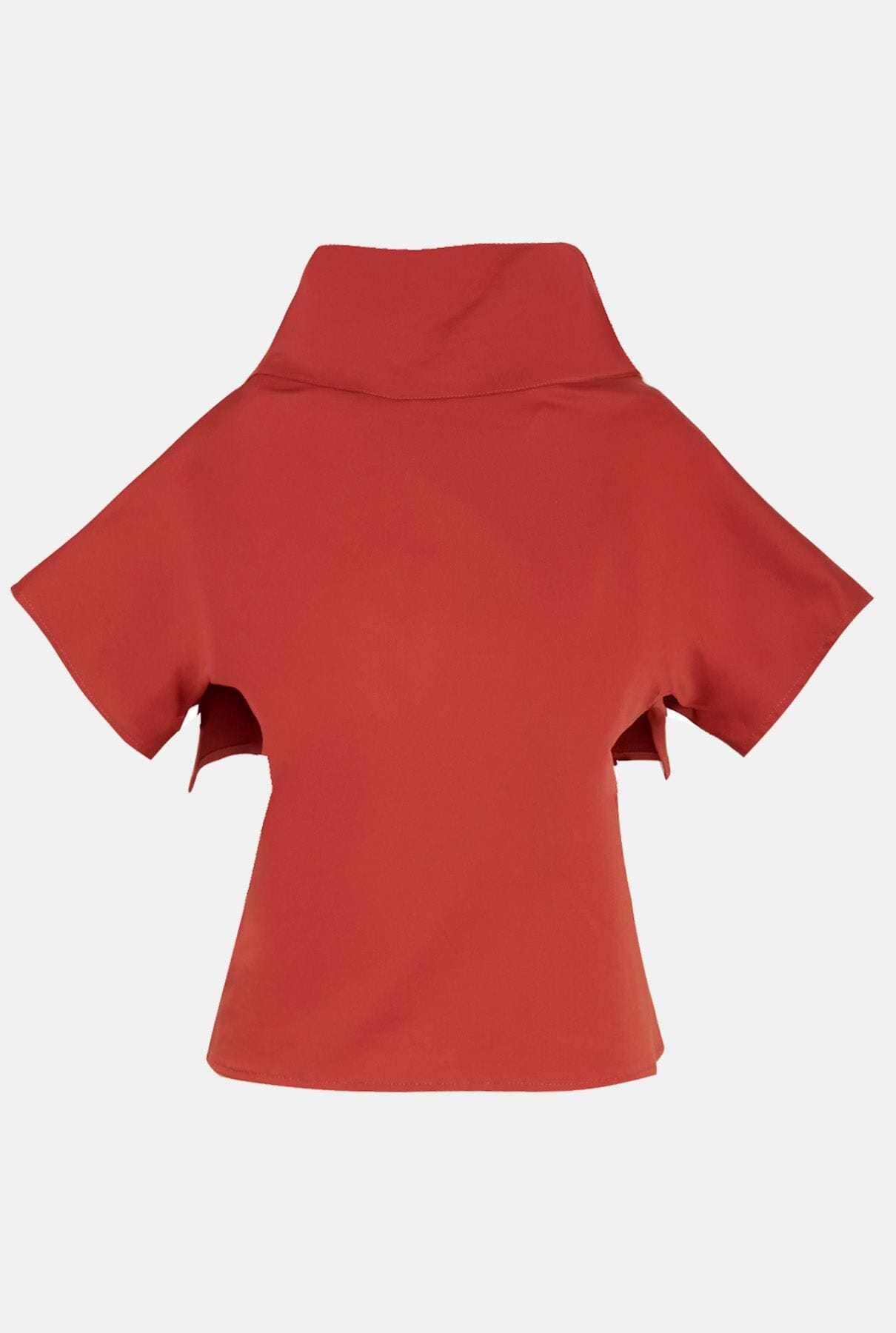 Top de Miguel Marinero en exclusiva para Es Fascinante. Manga corta, diseño original con escote alto y abierto y detalle de capa en la espalda. Combínalo con la falda para un total look.