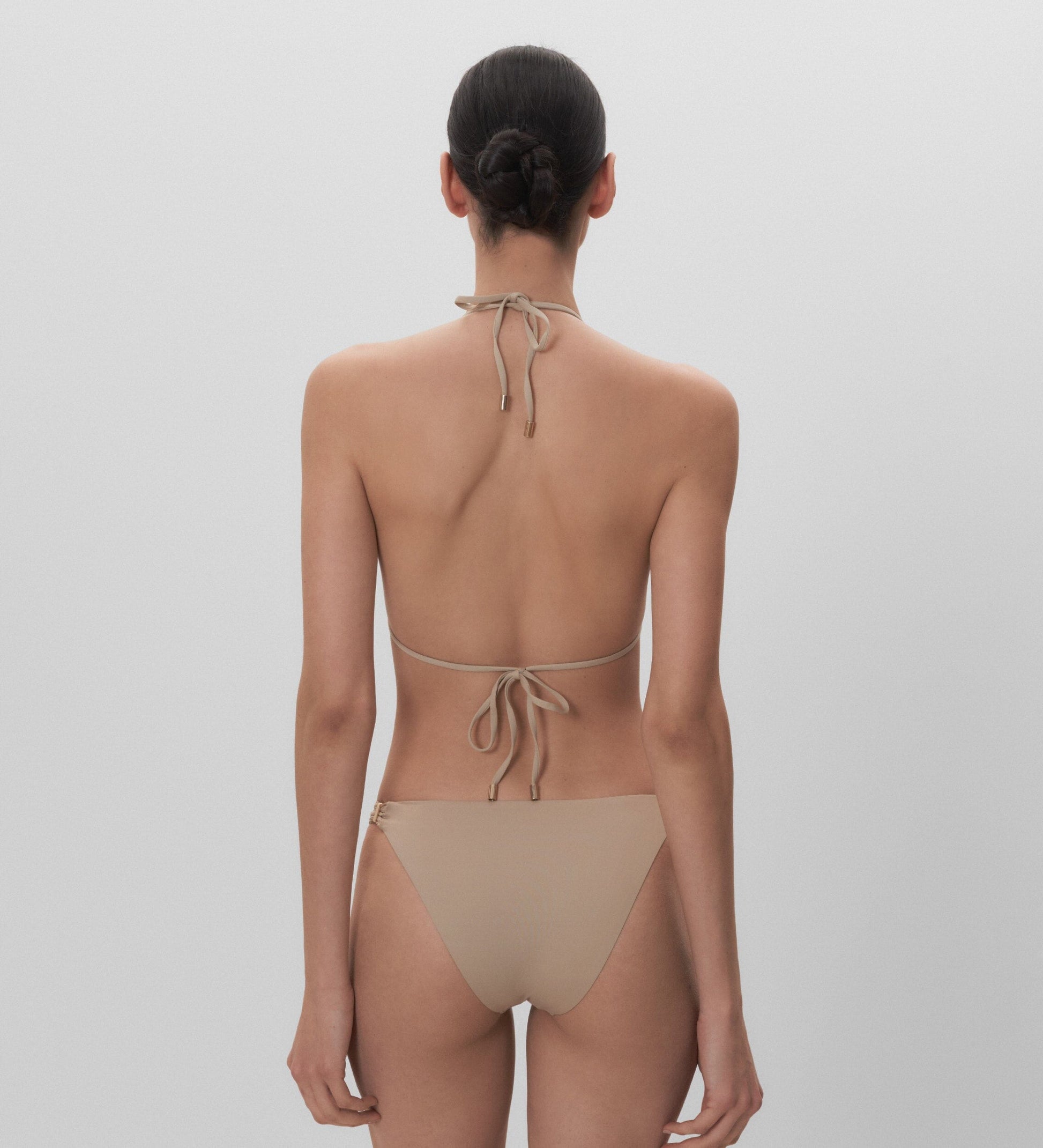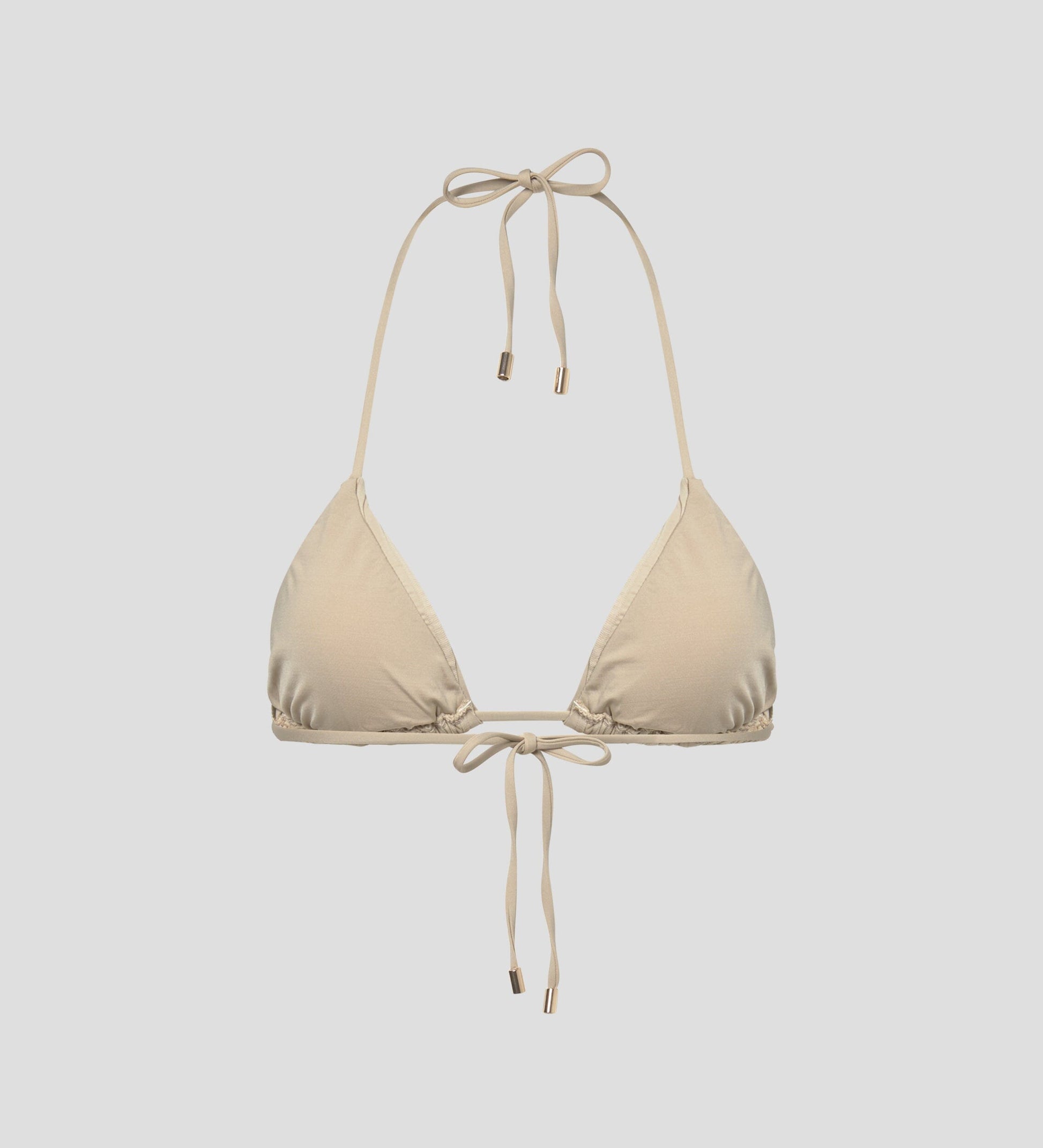 Top de bikini triangular unicolor, foam extraíble y cierre de lazo.