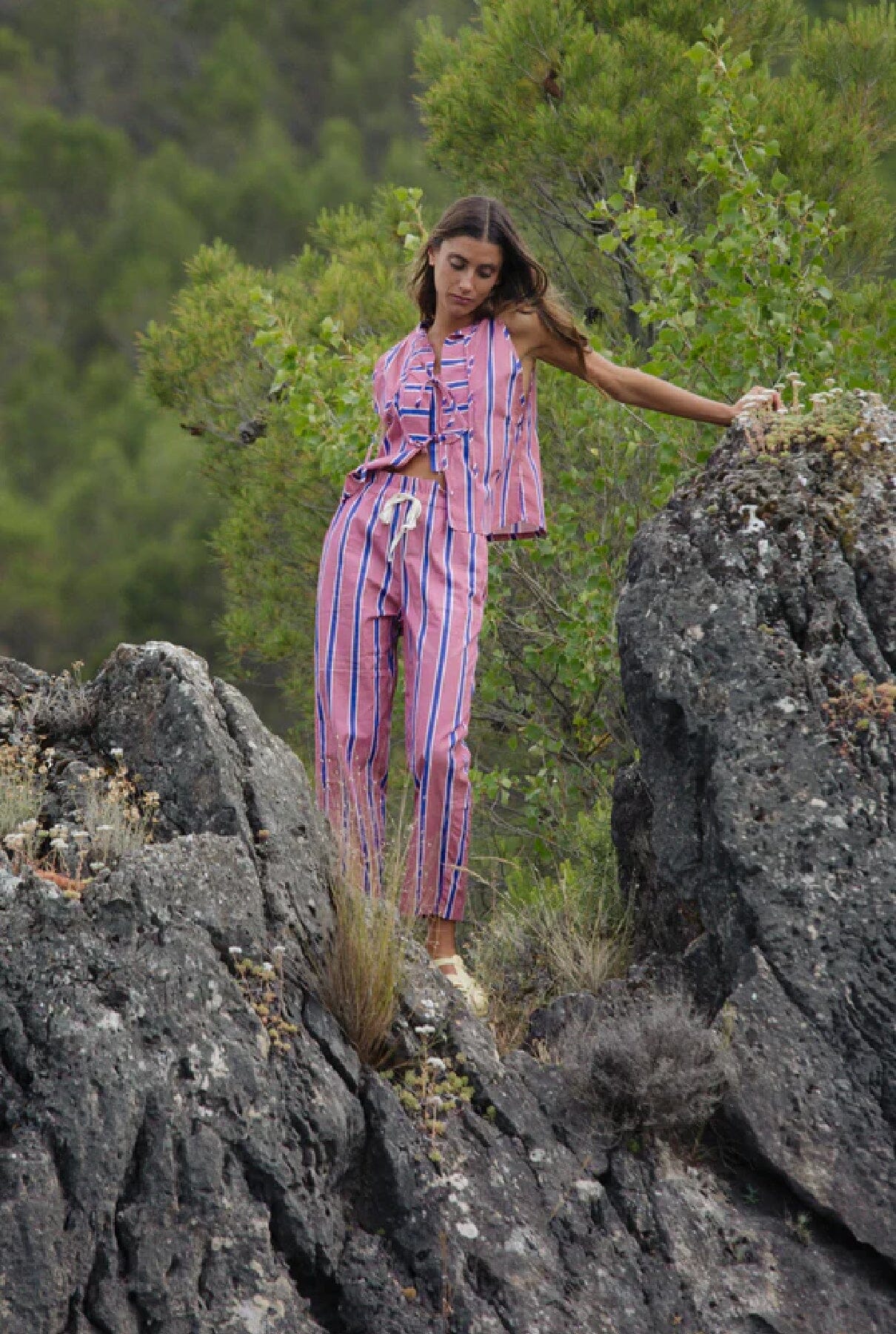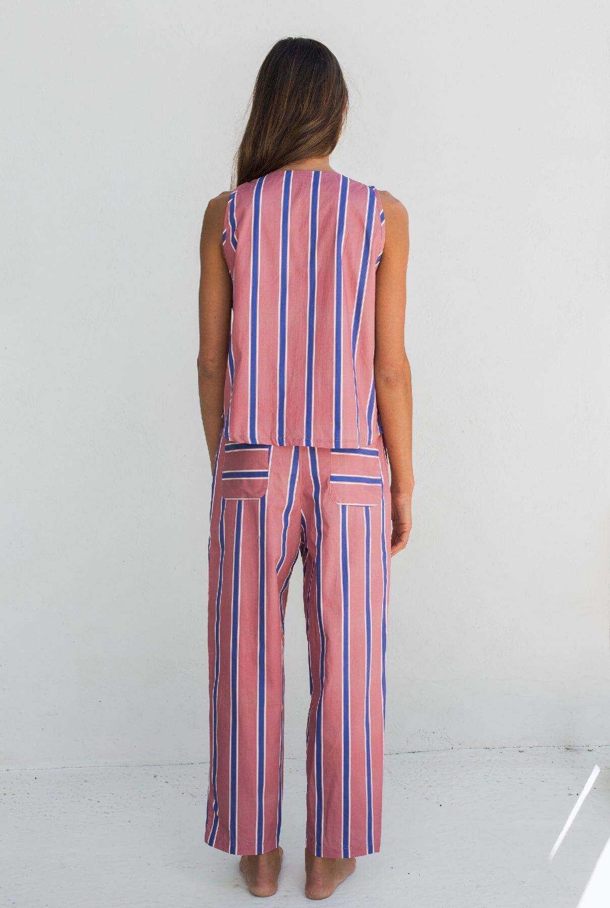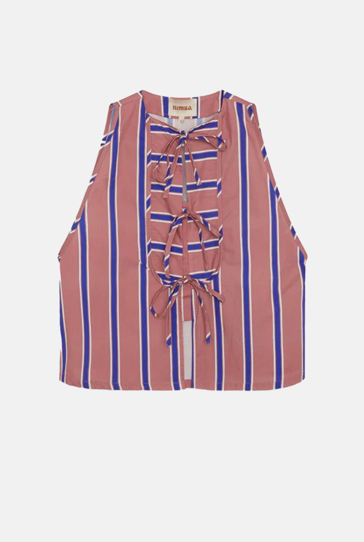 Top de tirantes estampado en tonos rosas con cuello redondo y manga con volumen. Cierre frontal con tres trabillas.