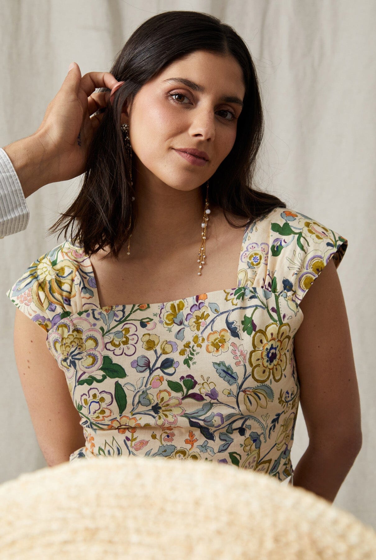 Crop top de manga corta, con un encantador estampado floral primaveral en tonos verdes, amarillos y morados. El sutil fruncido en la espalda no solo añade un toque de estilo, sino que también garantiza un ajuste elegante que realza tu figura con gracia y comodidad.