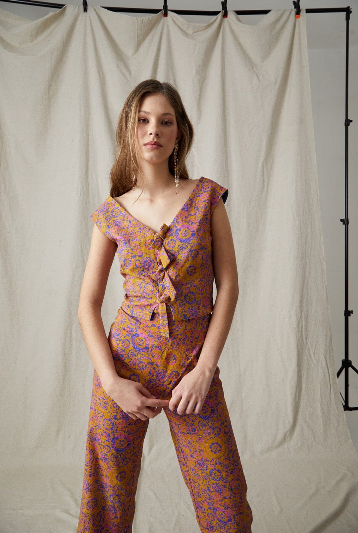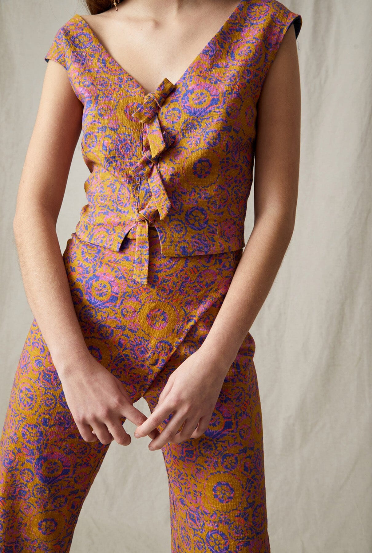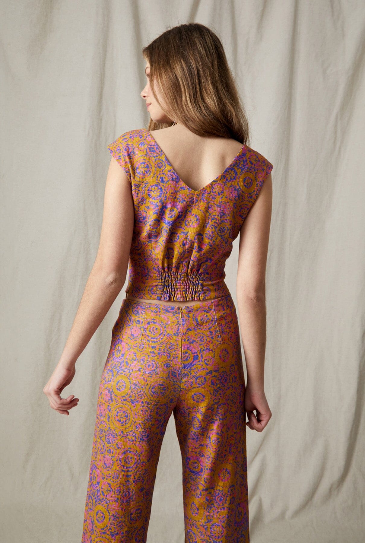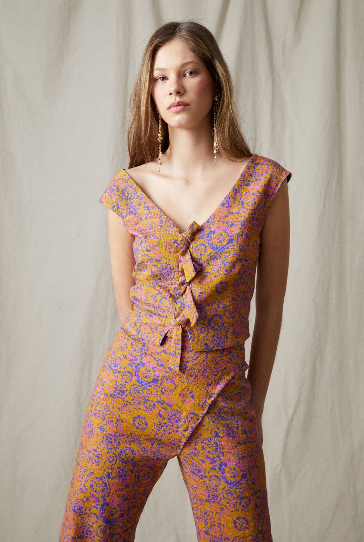 Crop top multicolor de manga corta, perfecto para tus eventos de esta primavera/verano. El cierre consta de tres trabillas en la parte delantera, que te dan la libertad de ajustarlo a tu preferencia, y una cremallera invisible en el lateral. El detalle fruncido en la espalda no sólo aporta un toque de sofisticación, sino que también realza la figura de forma sutil y femenina.