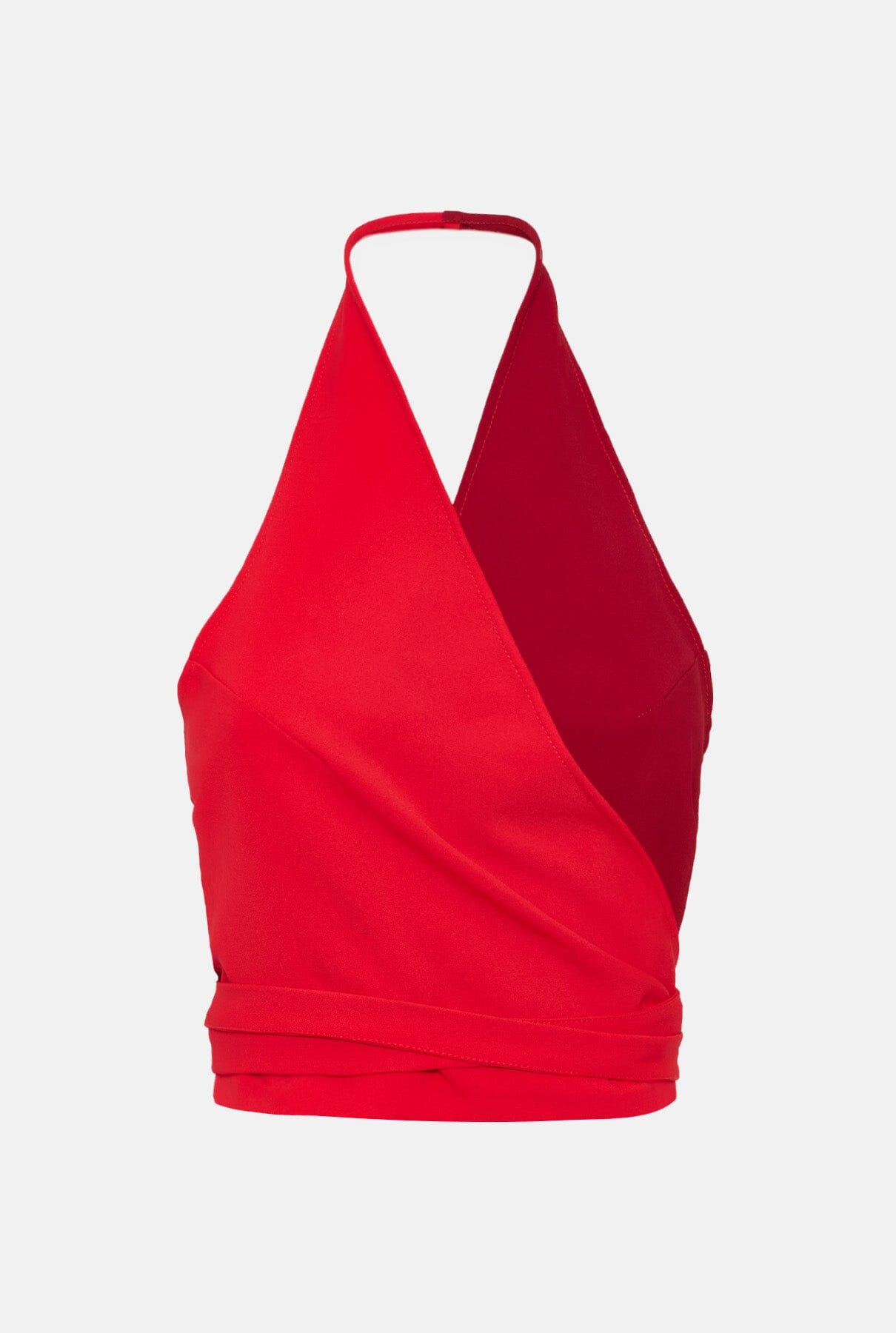 Tapa hecha a mano a mano en nuestro taller en Lanzarote. Top bicolor, cereza y rojo, cruzado con escote en pico y hombros descubiertos. Se cierra con un lazo en la cintura.