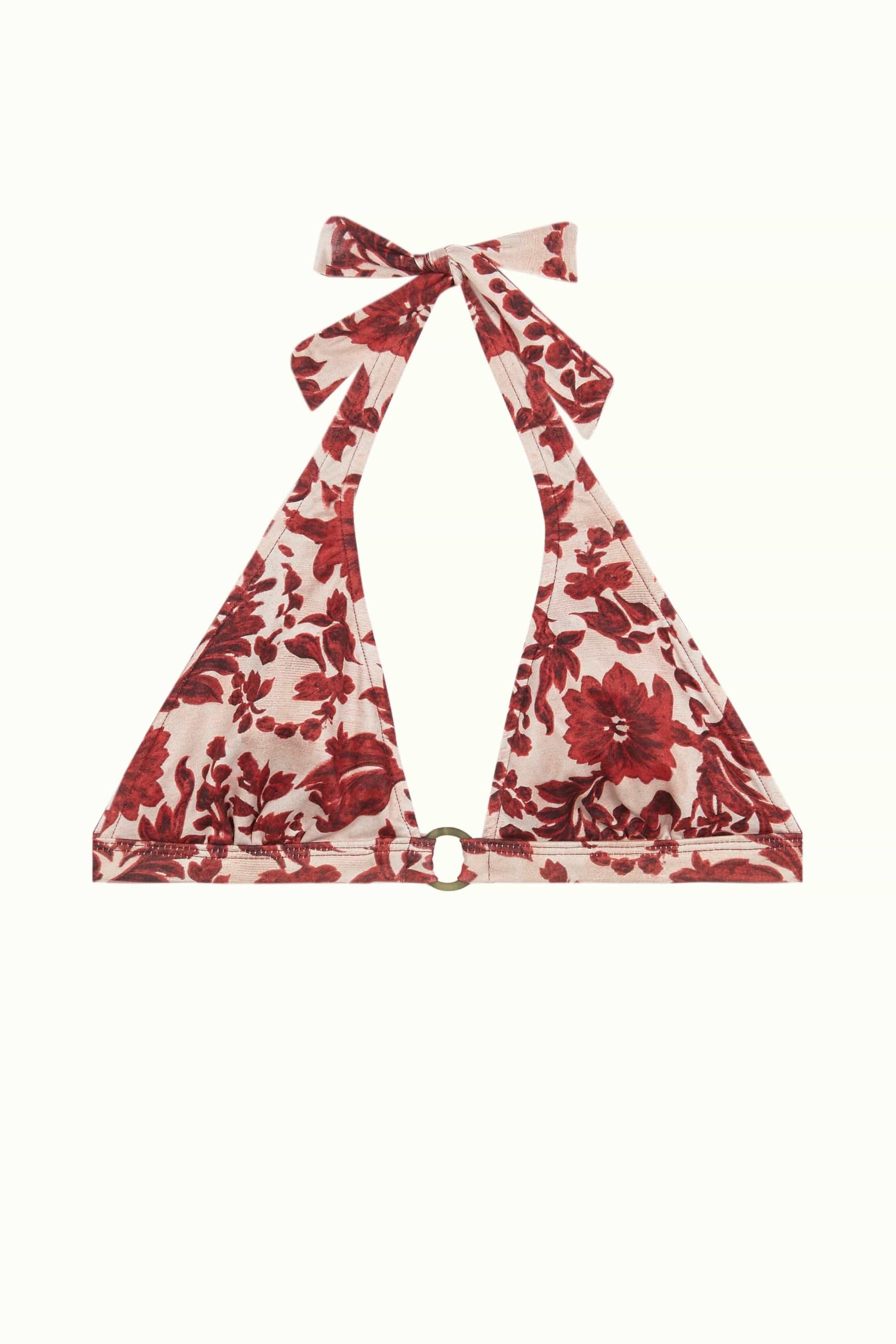 Top de bikini estilo halter cubierto en los laterales con soporte bajo el busto y anilla en el centro, ajustable al cuello con cierre en la espalda.