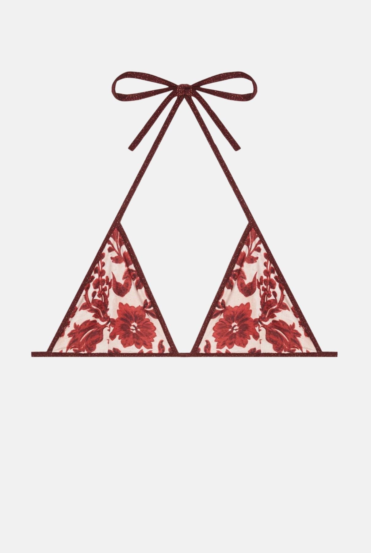 Mezcla dos estampados, un estampado paisley salmón sobre fondo rosa y un estampado floral vintage en tonos granates sobre fondo crudo.
