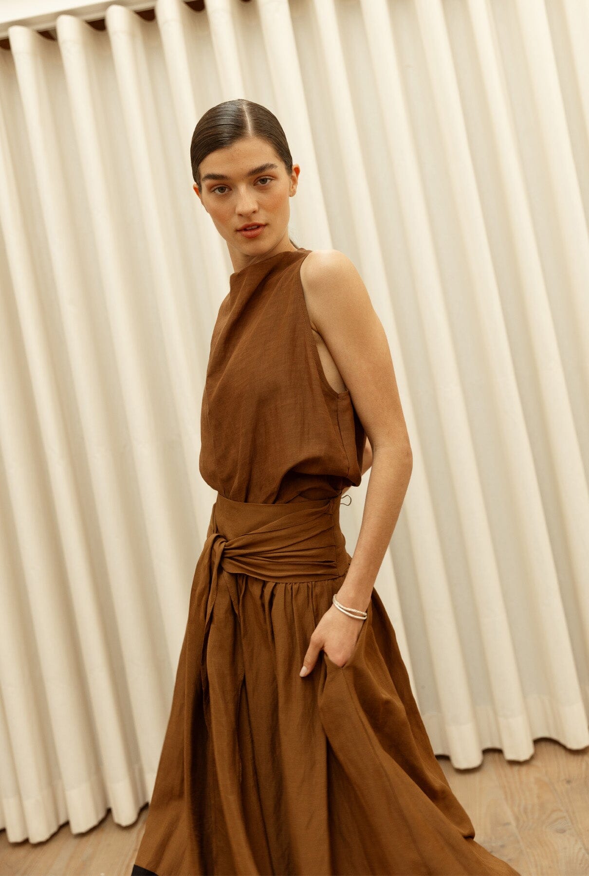 Top con escote en cascada y cuello halter. Abotonado en espalda con botón forrado.
