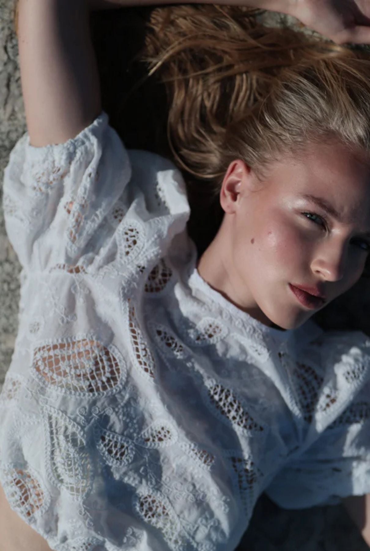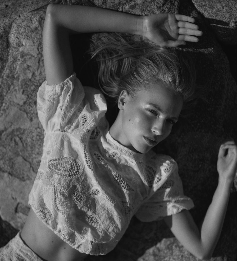 Blusa corta con mangas abullonadas hasta los codos. Cuello redondo con cierre de un solo botón en la espalda.