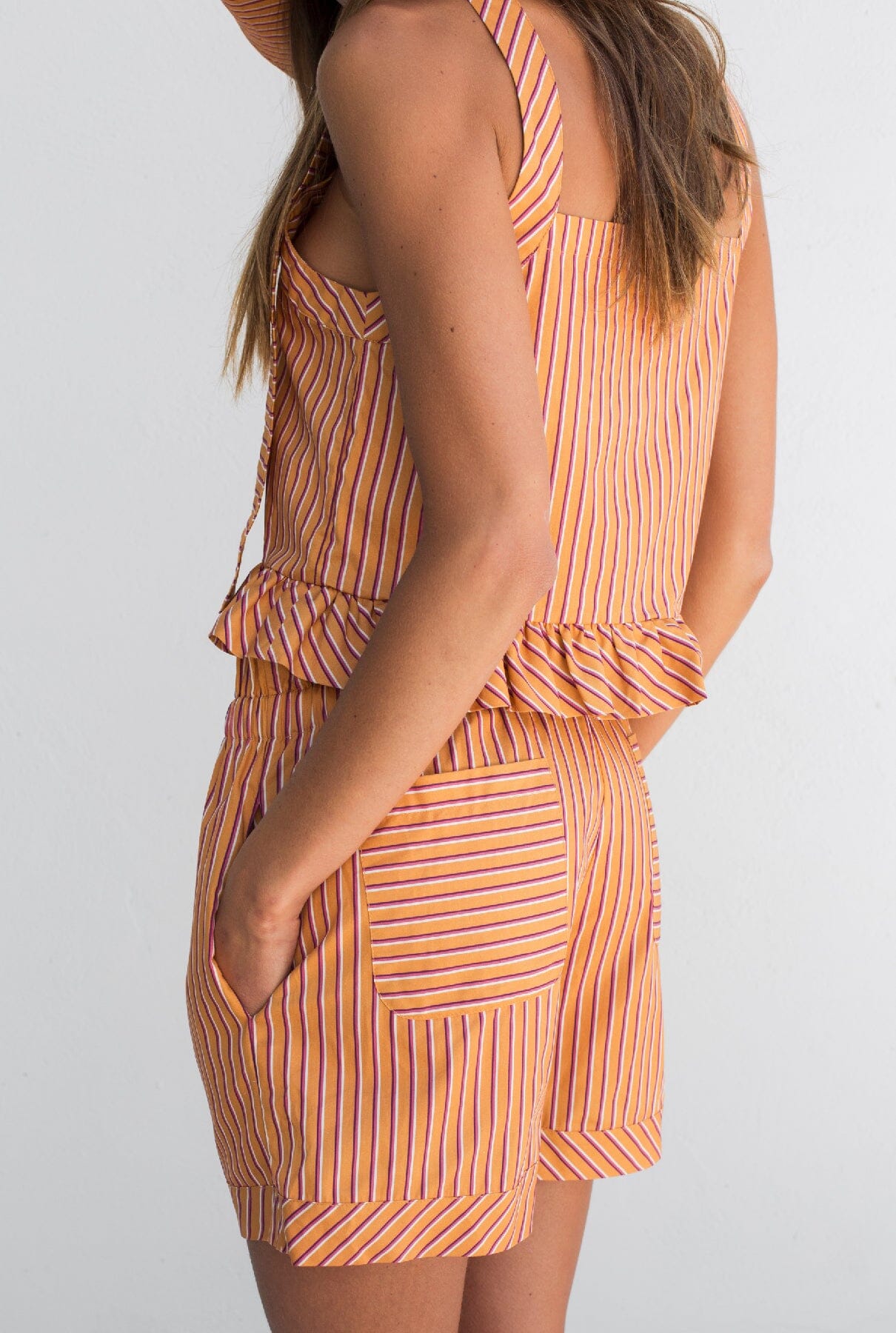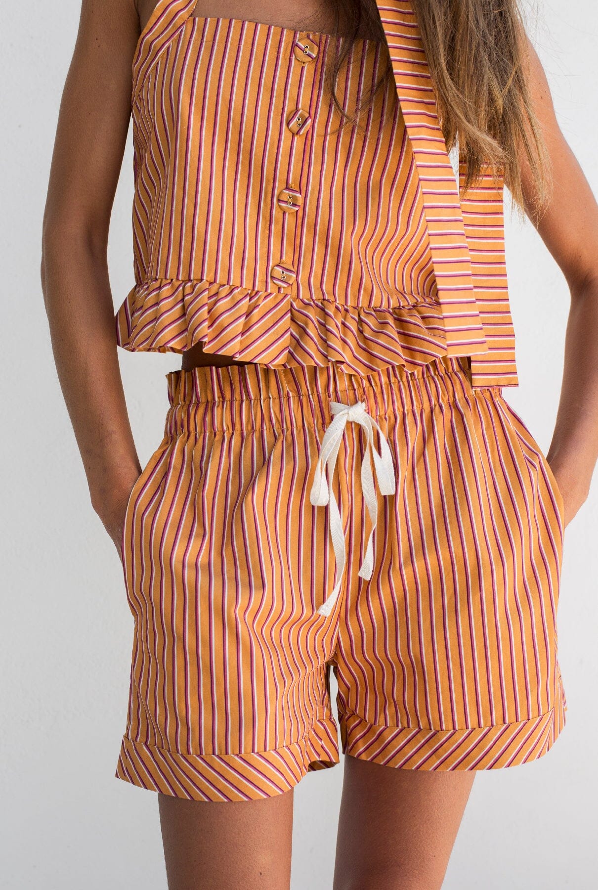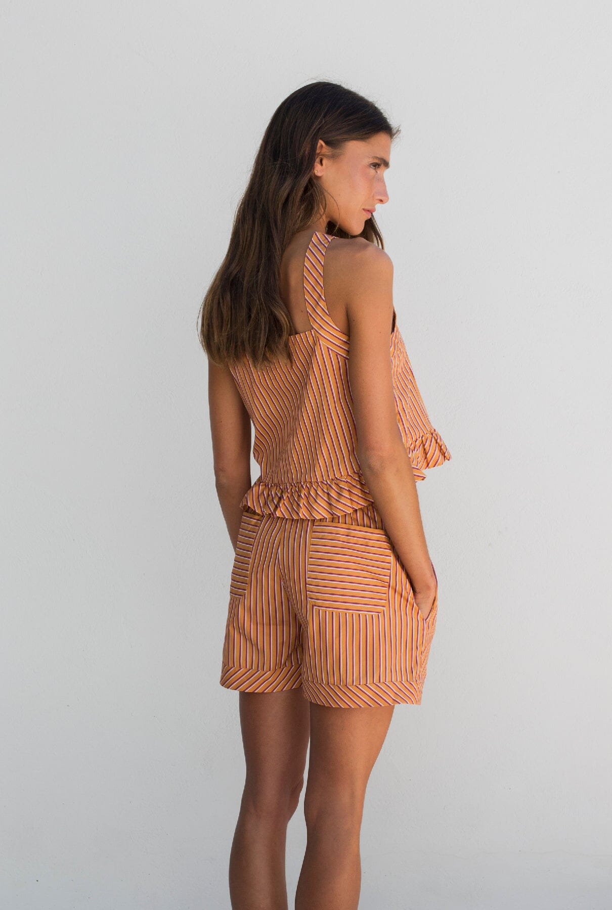 Top de tirantes con cierre de botones y detalle de volante en la parte inferior.