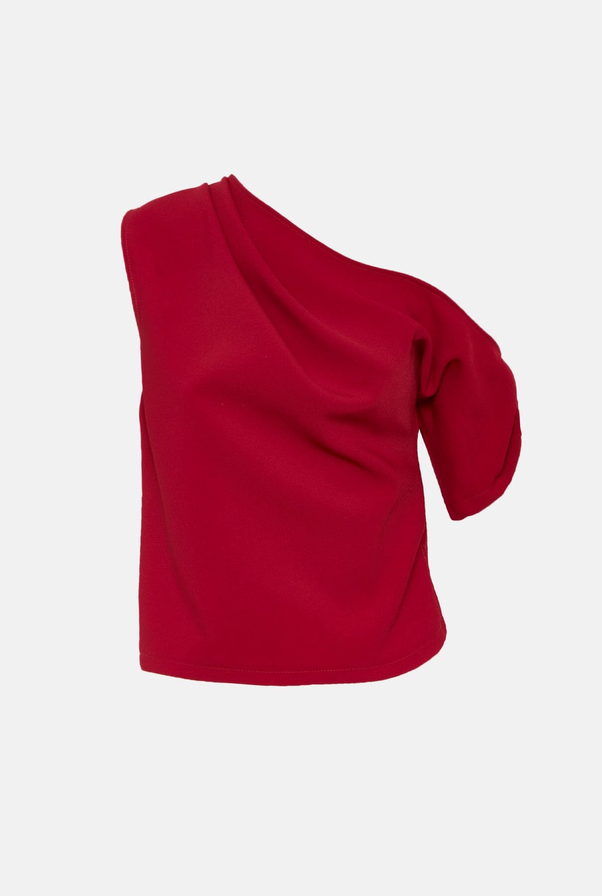 Top confeccionado a mano en nuestro taller en Lanzarote. Top con escote asimétrico y manga corta caída. Detalle de hombros descubiertos y drapeado lateral.