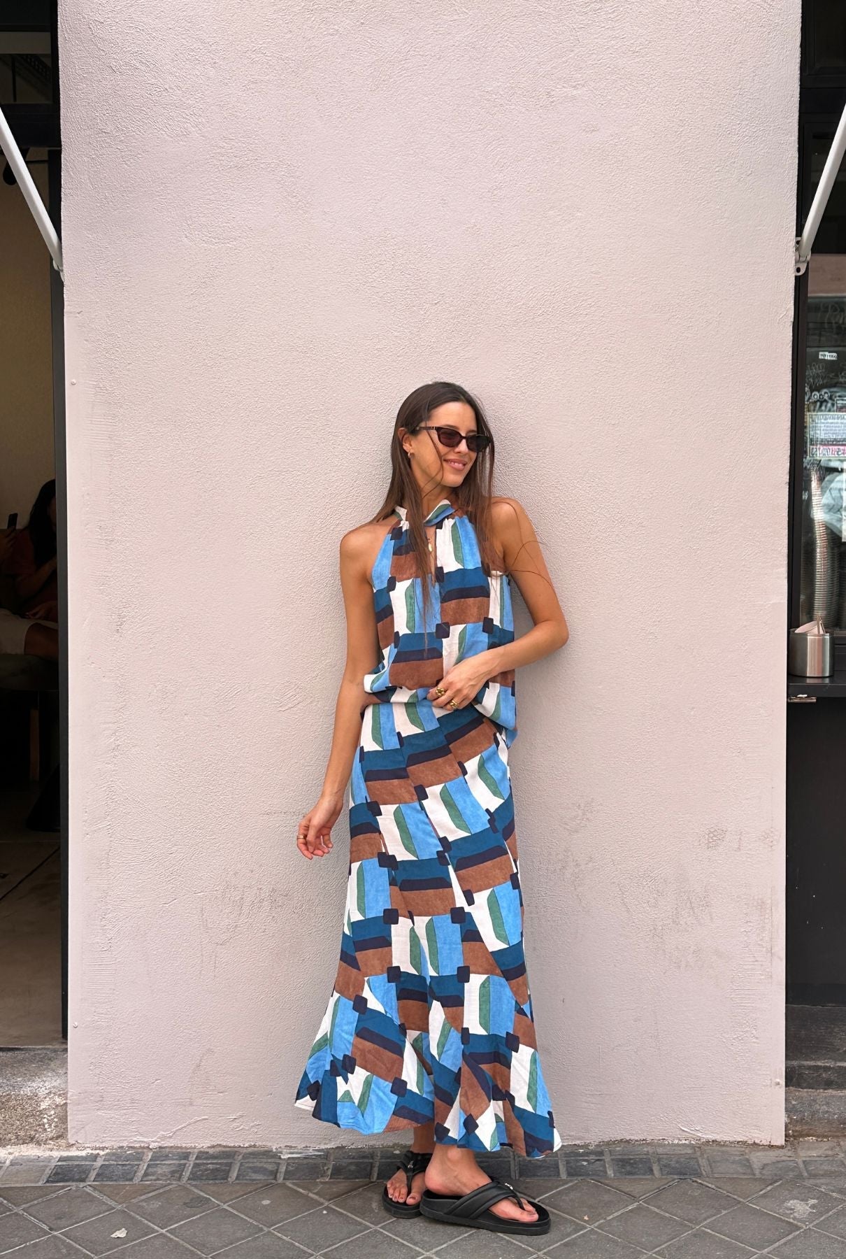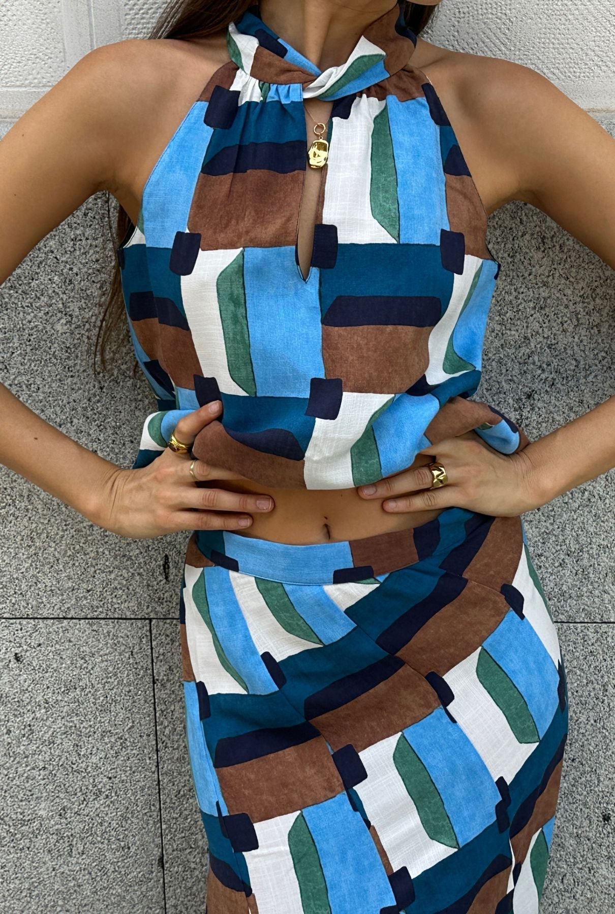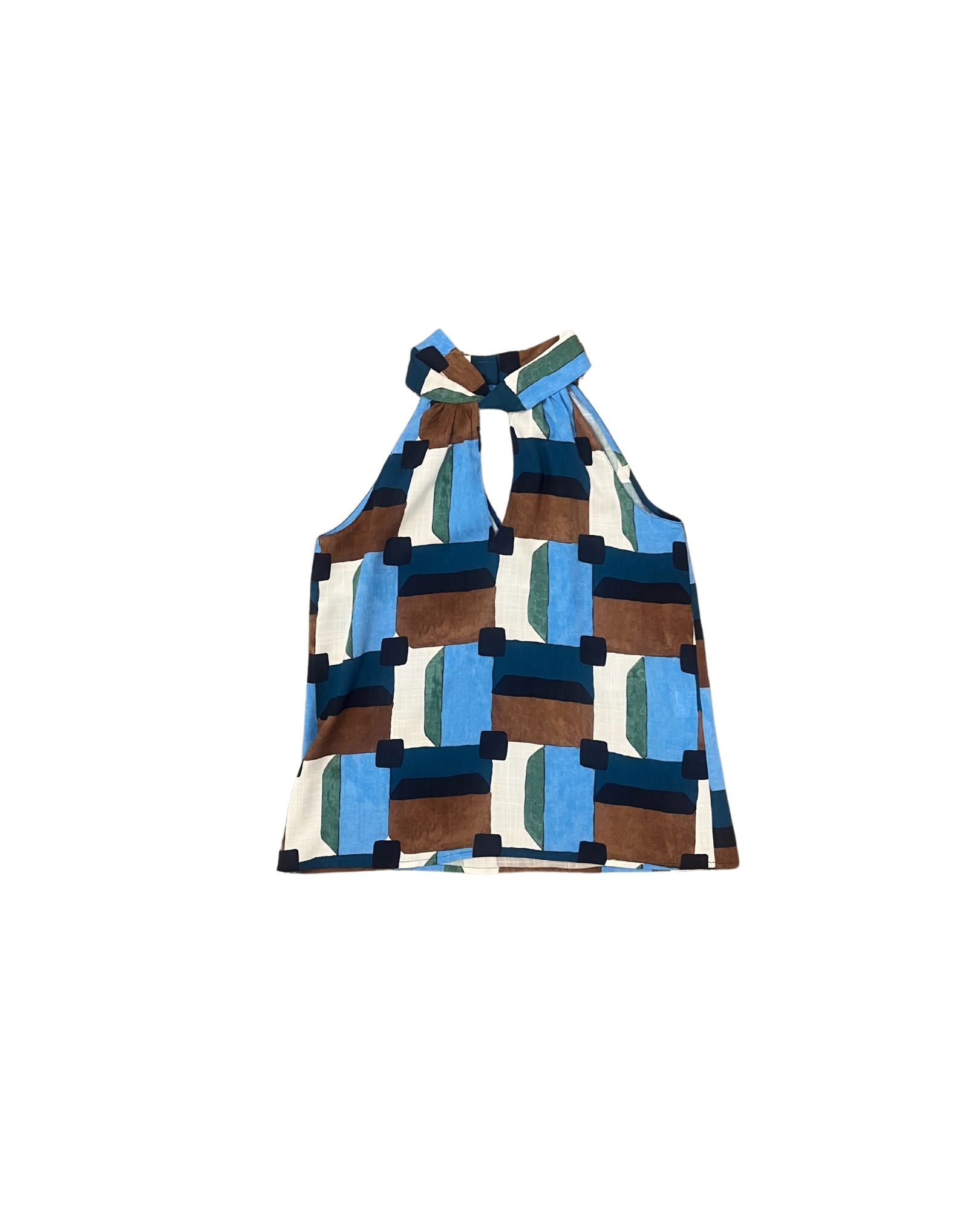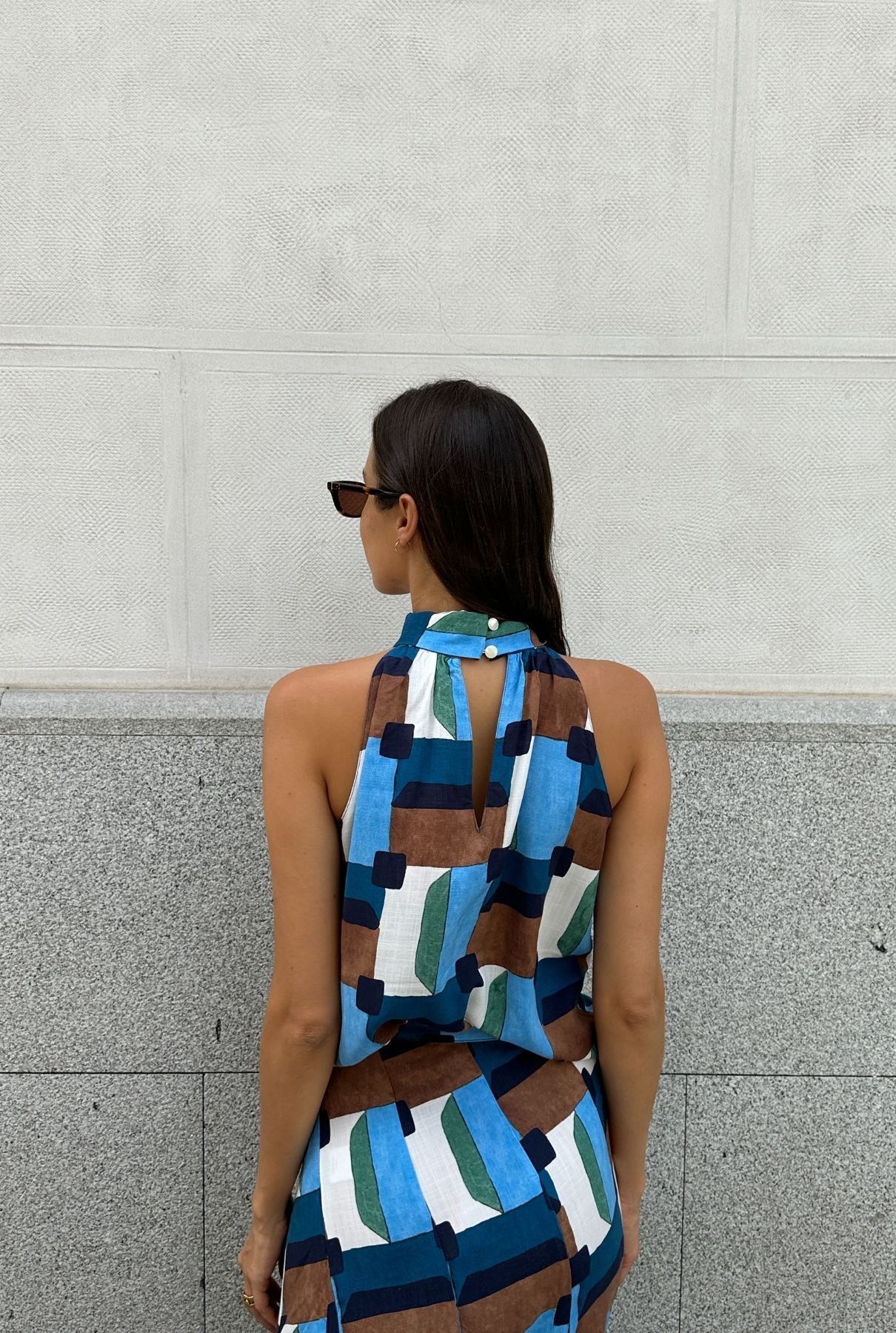 Top halter con escote de lágrima en la parte delantera y trasera. El estampado es geométrico en una tela de viscosa muy fresca.
