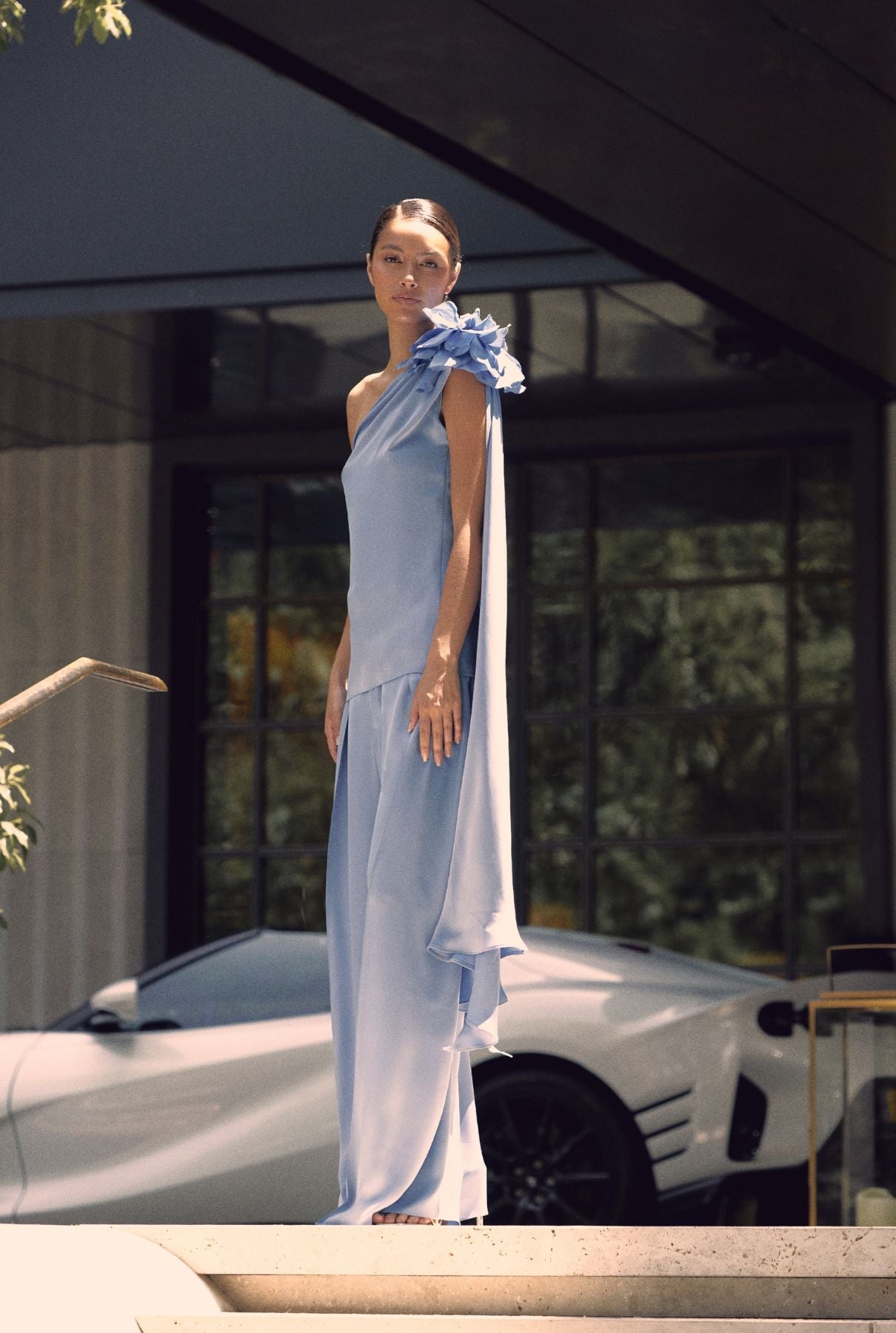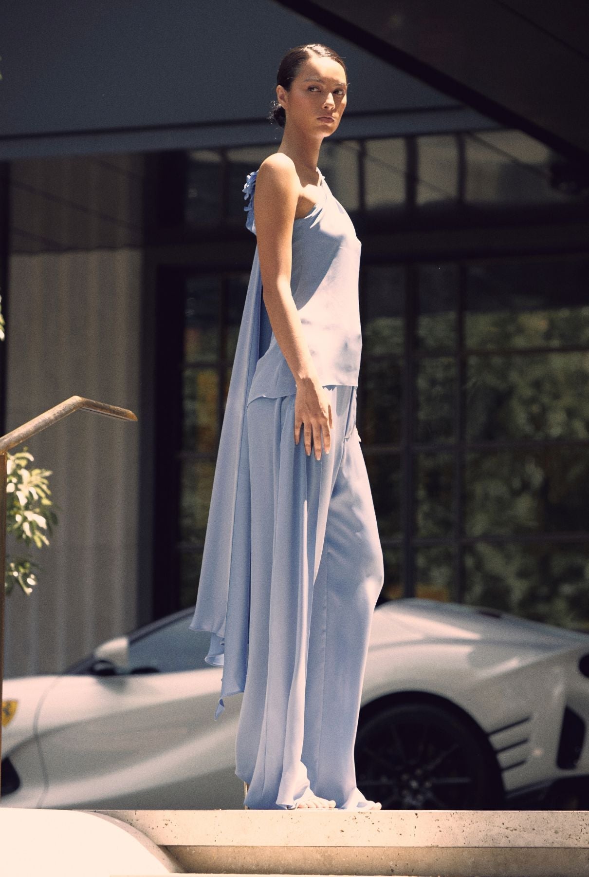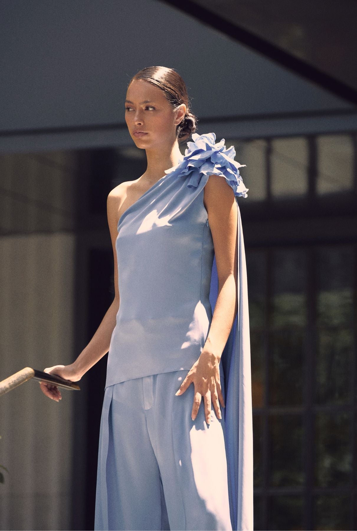 Top asimétrico con capa y flor hecha a mano y pantalón palazzo a juego.