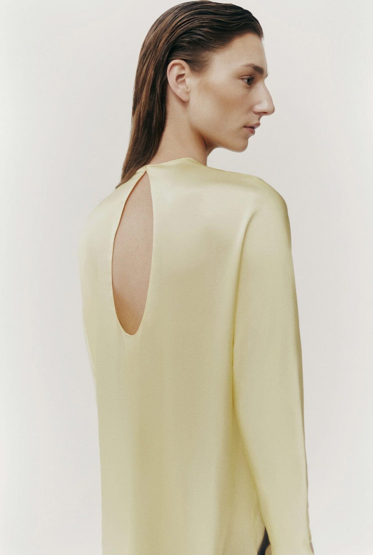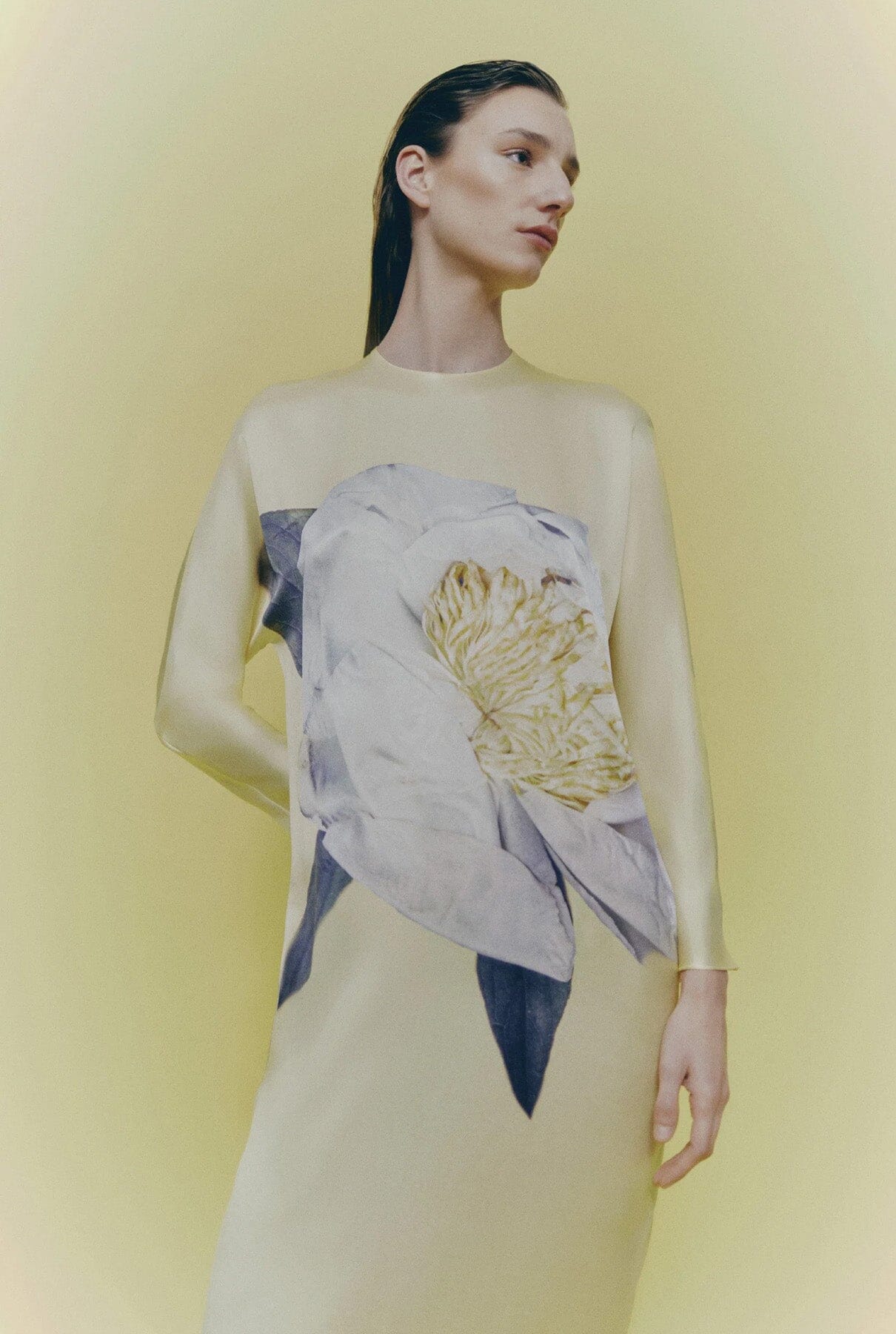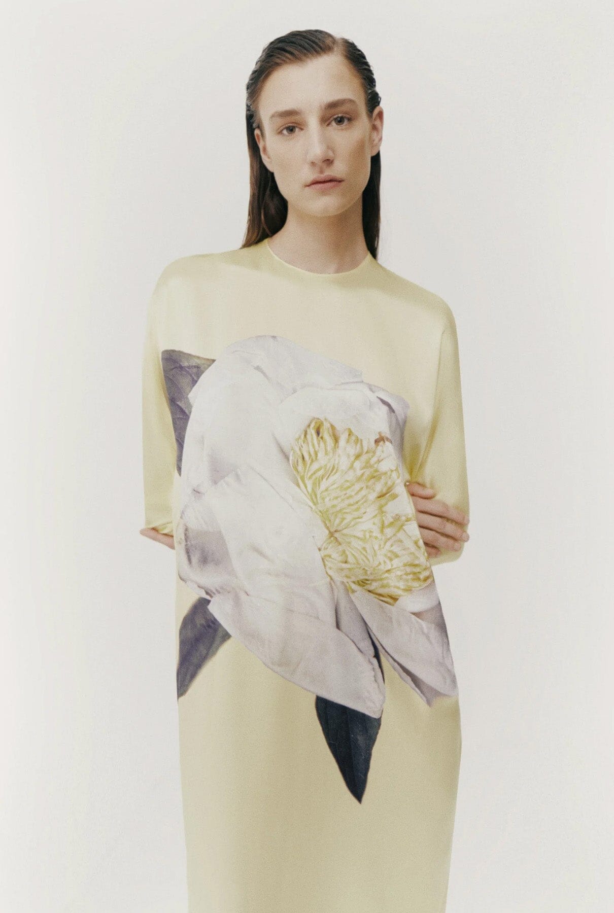 VESTIDO LAGUNA CON SILUETA RECTA, CUELLO CAJA Y MANGAS JAPONESAS, CON LAGRIMA EN LA ESPALDA Y ABERTURA BAJA DE LA ESPALDA, ESTAMPADO DE PEONÍAS POSICIONALES EN EL CENTRO DELANTERO.