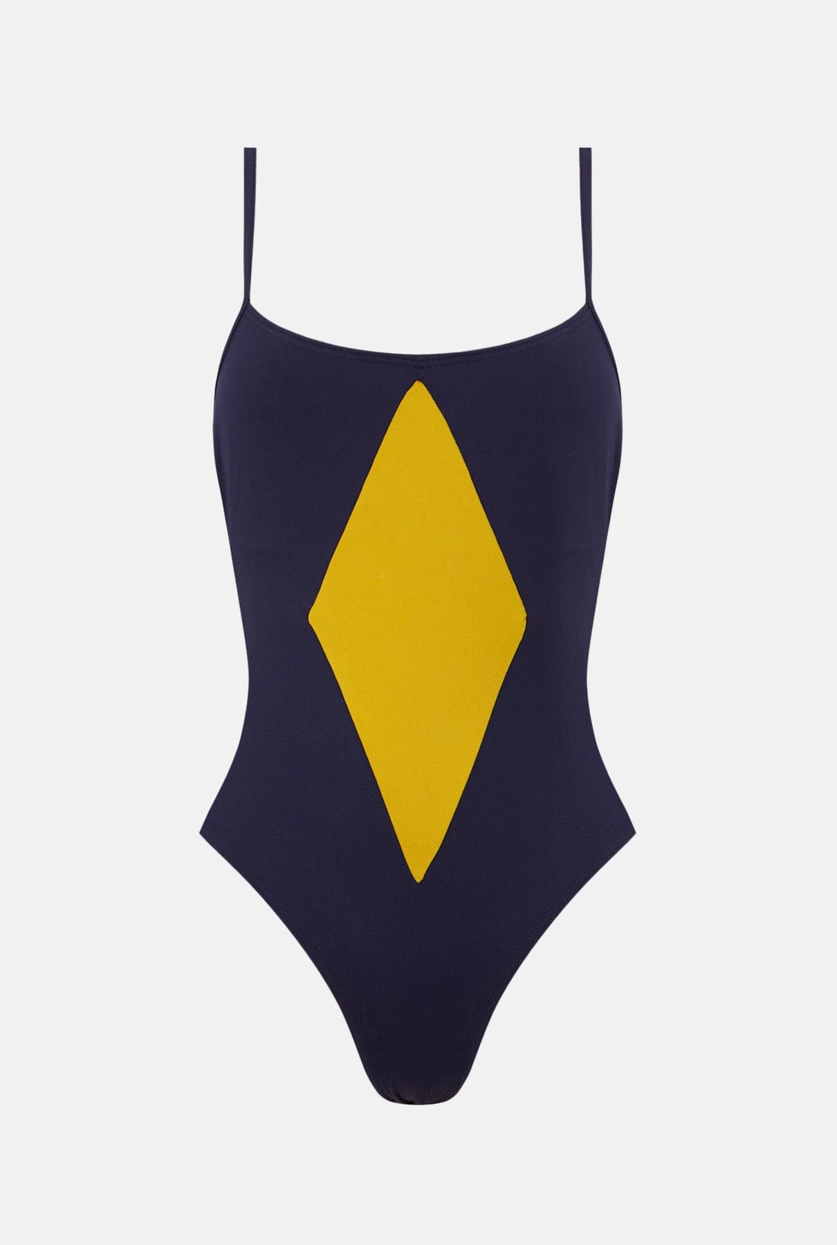 Este bañador azul marino ofrece un estilo único y llamativo con su rombo contrastante que hace que la cintura se sienta más estrecha. Aunque cuenta con tirantes finos que brindan un soporte más ligero, su diseño te permite ajustar el tirante de diferentes maneras para adaptar el nivel de soporte según tus preferencias. Con un amplio escote en la espalda y perfecto para quienes buscan un bañador que combine estilo y versatilidad. Forro interior incorporado y copas extraíbles.