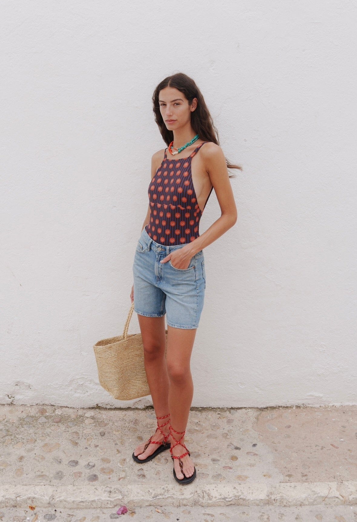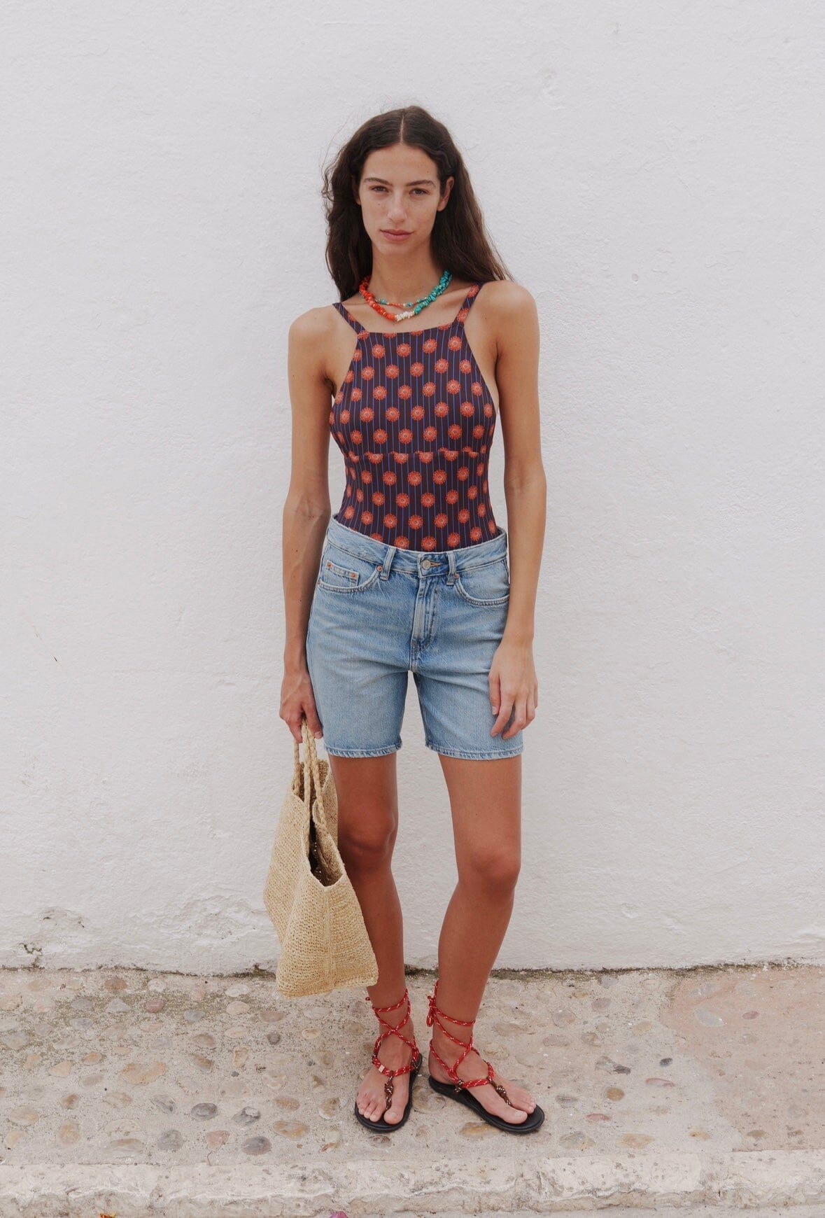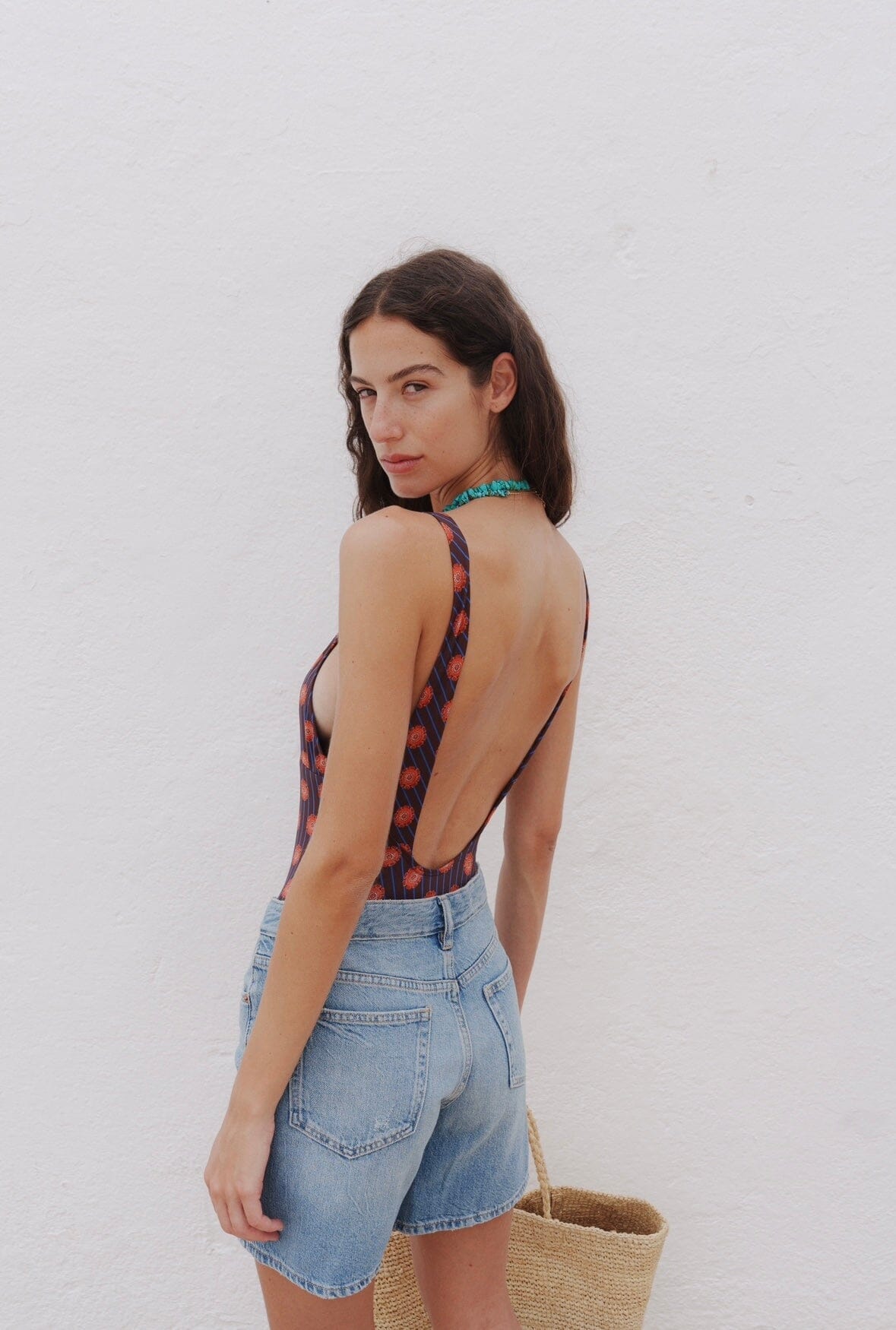 Traje de baño con escote halter y espalda escotada. Confeccionado en tejido técnico estampado, mezcla de poliamida y elastano, que se adapta al cuerpo y se seca rápidamente.
