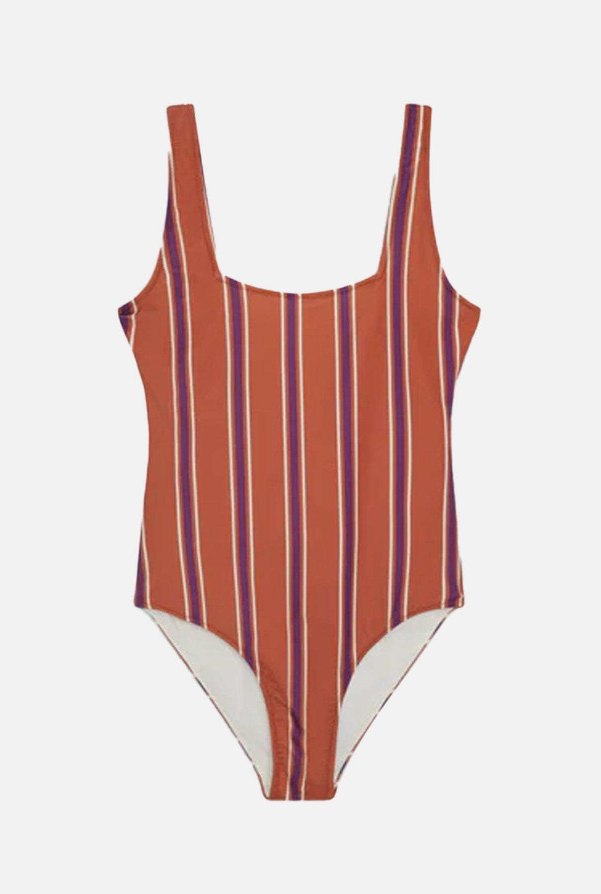 Bañador de rayas violeta, naranja y blanco. Sujetador sin aros, espalda abierta y tirantes anchos.