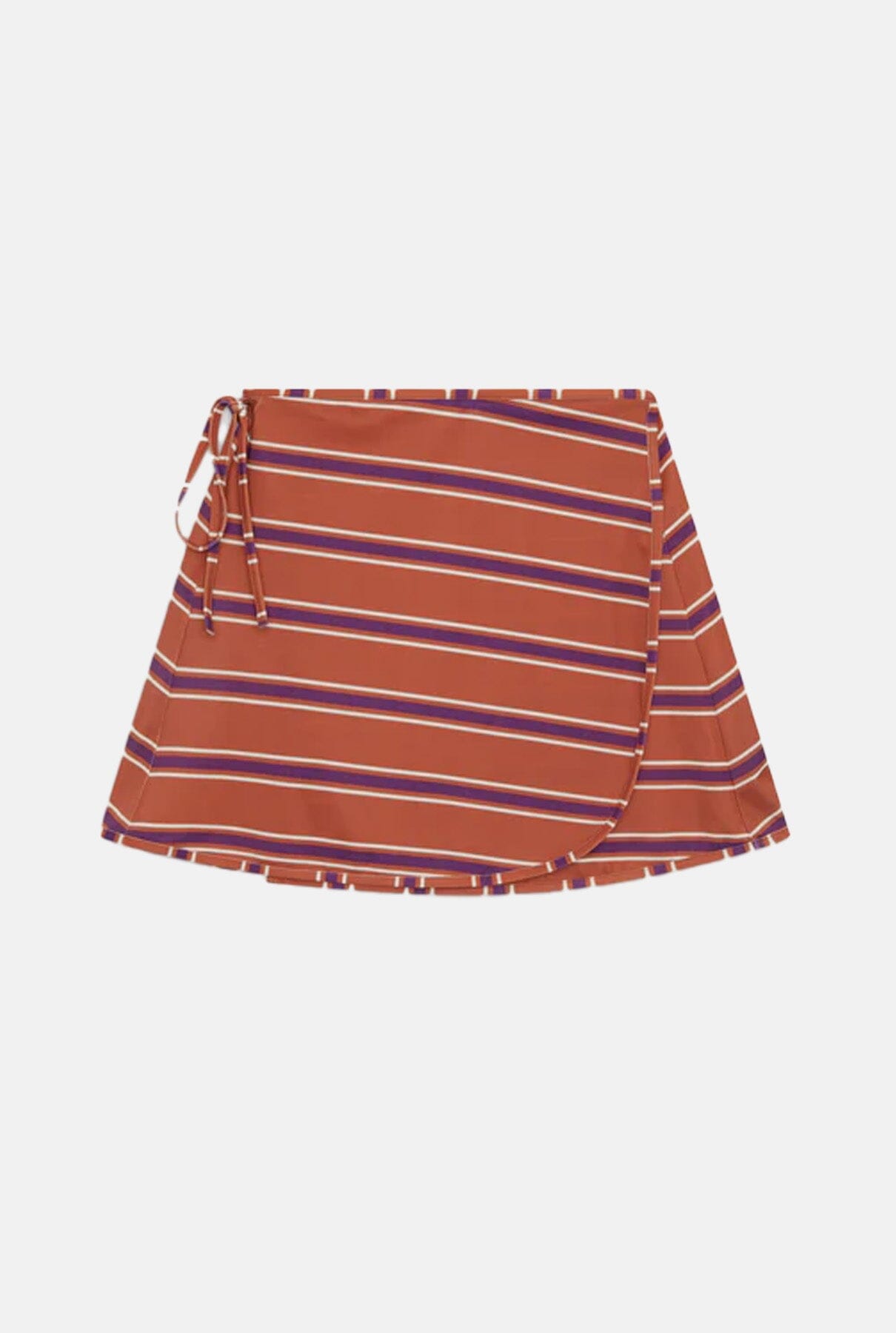Mini pareo que se envuelve en la cintura y se ajusta con un nudo en el lateral. Confeccionado en la misma tela de rayas naranjas, moradas y blancas que el bañador.