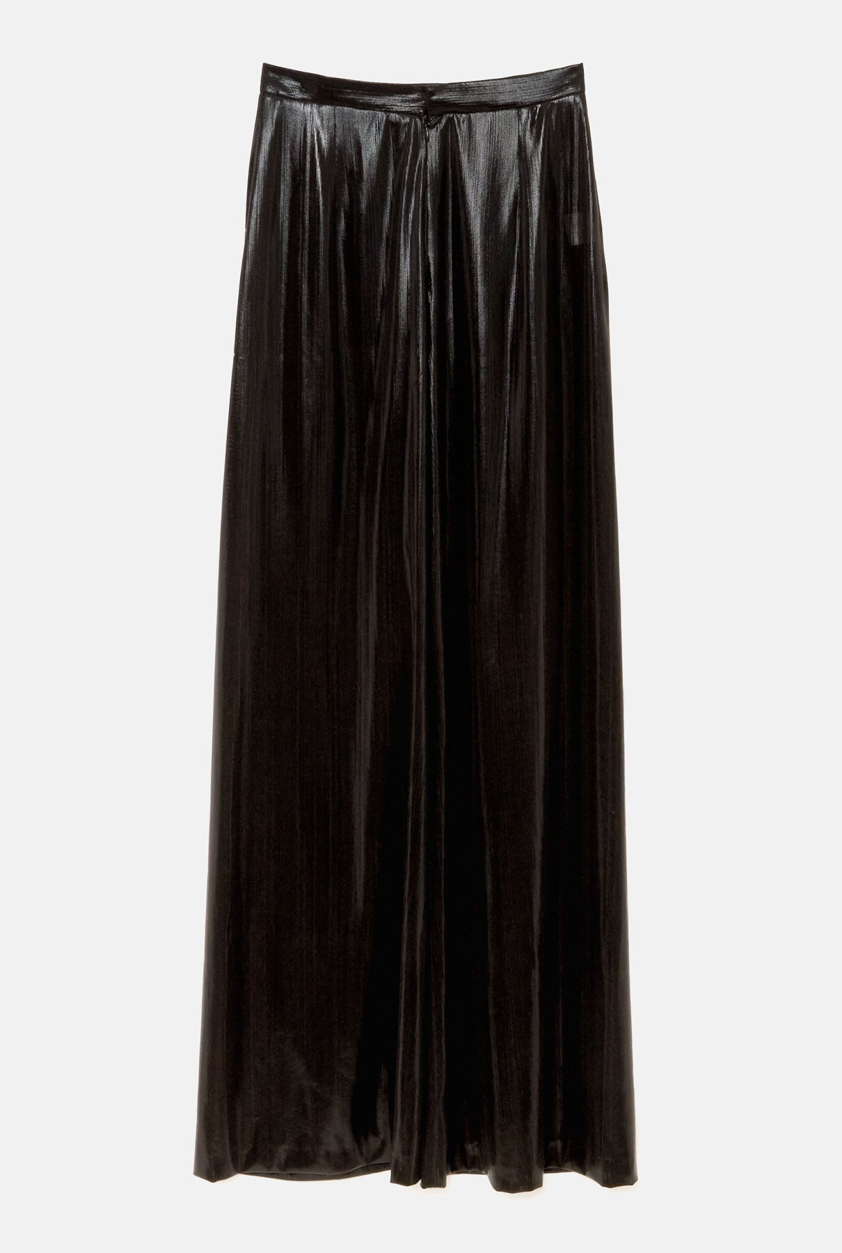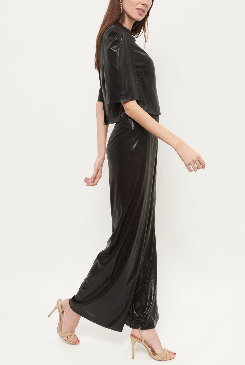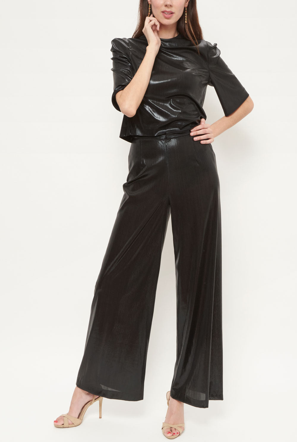 PANTALON PIERNA ANCHA, CINTURA ALTA, CIERRE FRONTAL CON CREMALLERA INVISIBLE. TELA BRILLANTE Y CON UNA CAÍDA INCREÍBLE. LONGITUD 108 CMS. Se fabrica en nuestros talleres de Galicia, con el saber hacer de la Industria Española. Diseñado por Devota&Lomba.