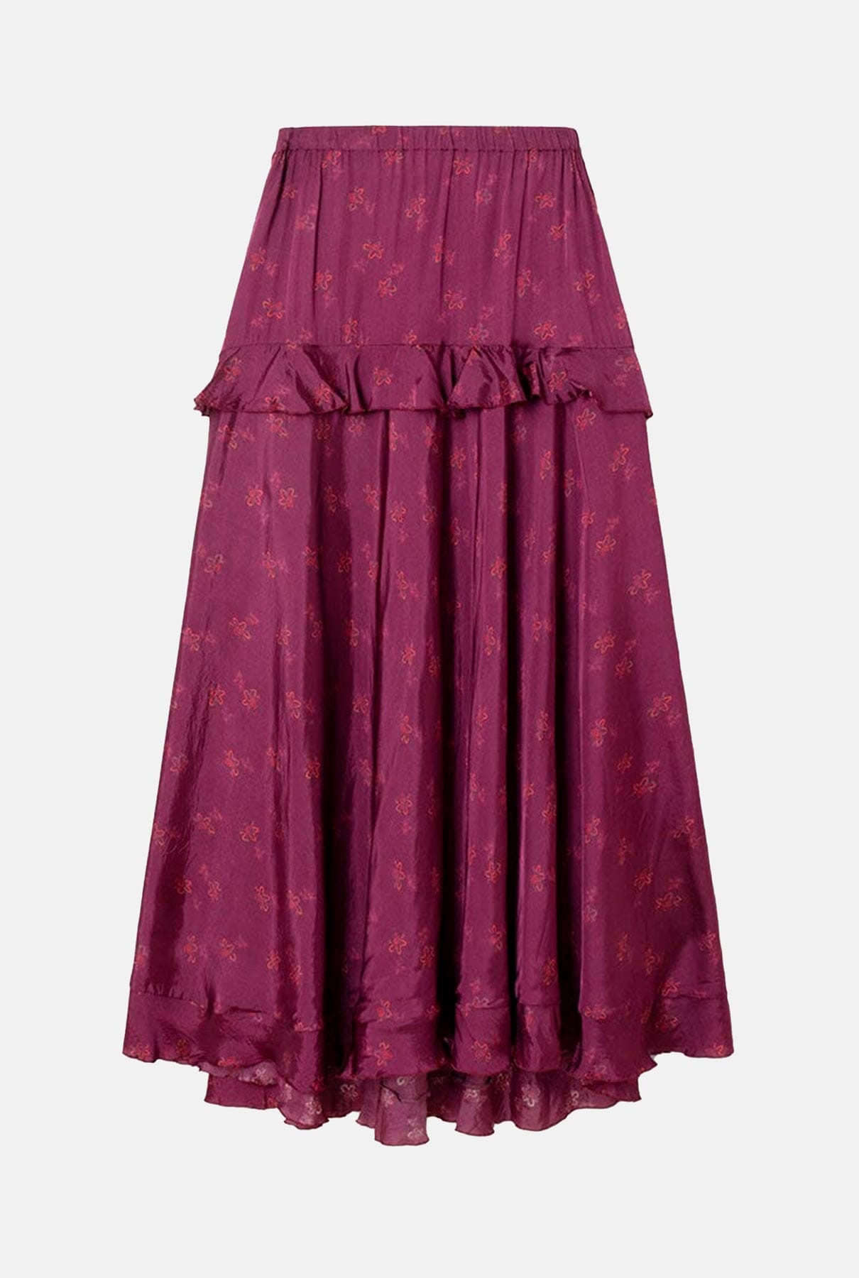Falda larga ajustada a la cintura con banda elástica. Adornada con un volante debajo de la cadera y rematada con un volante en el bajo.