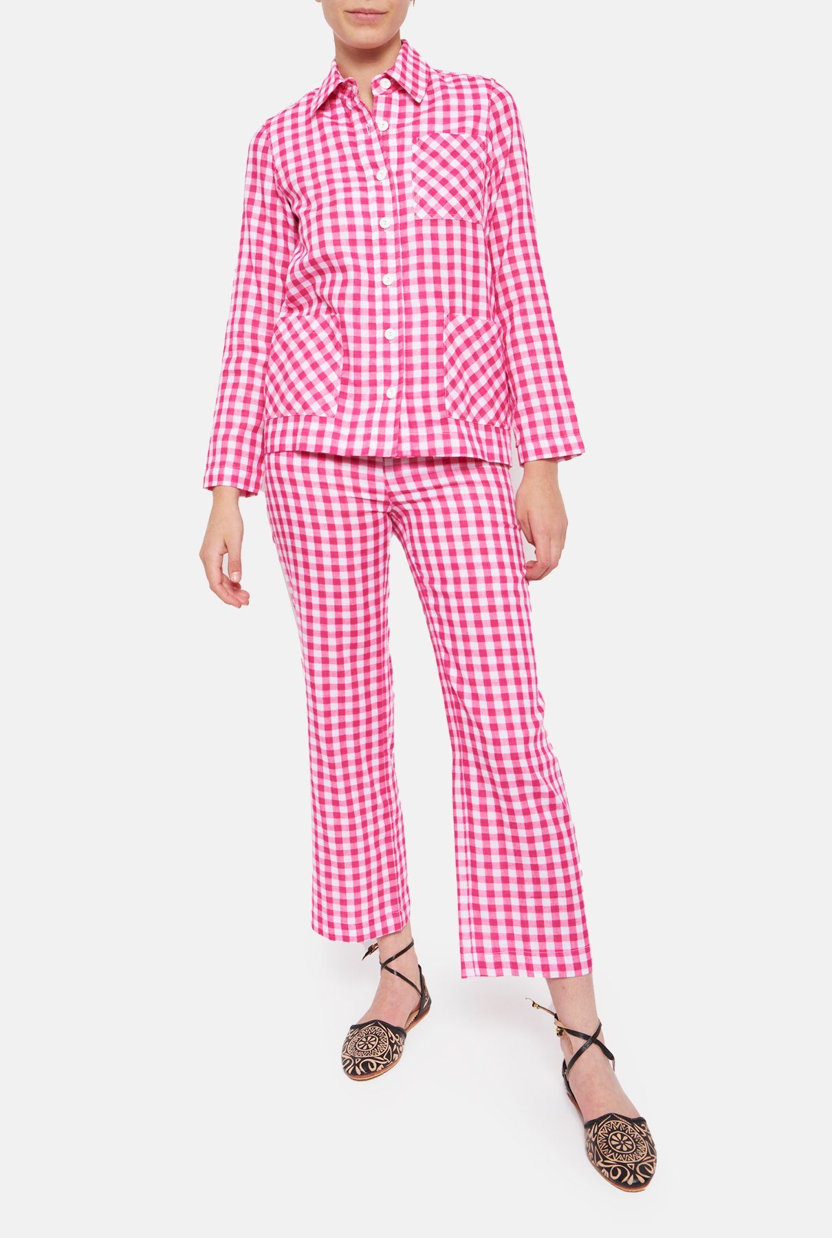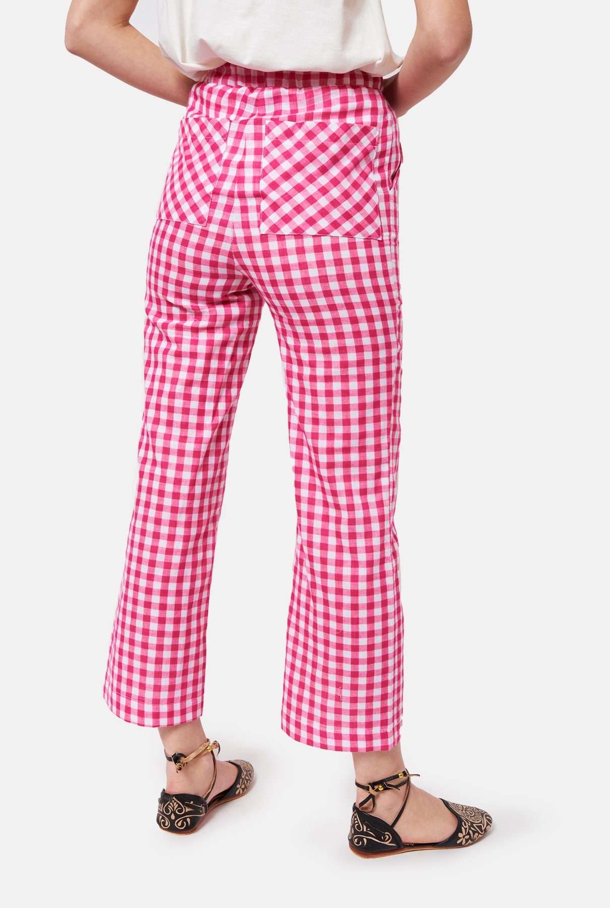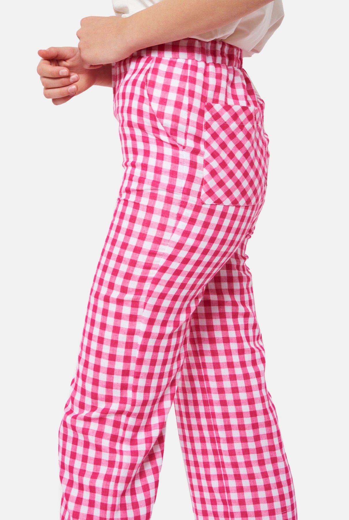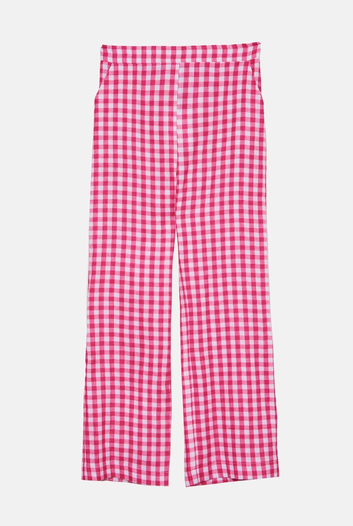 Pantalón recto vichy fucsia con bolsillos en la parte trasera y cintura elástica. Diseñado por Kolonaki