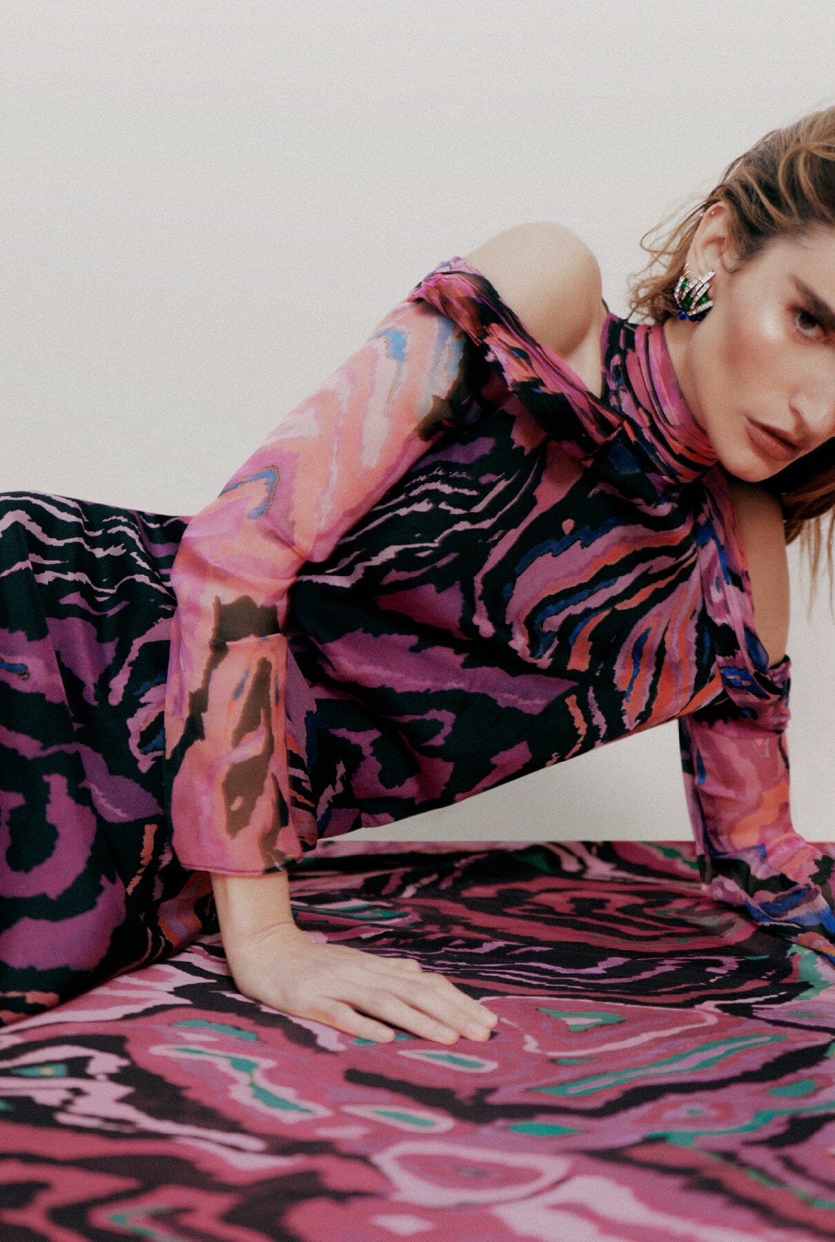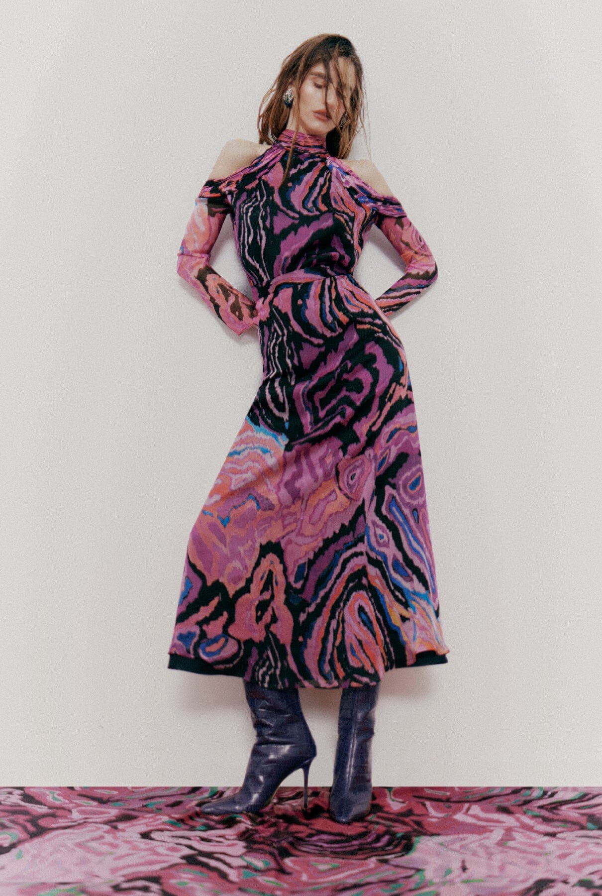 Blusa con mangas, hombros descubiertos y cierre de botones en la nuca.