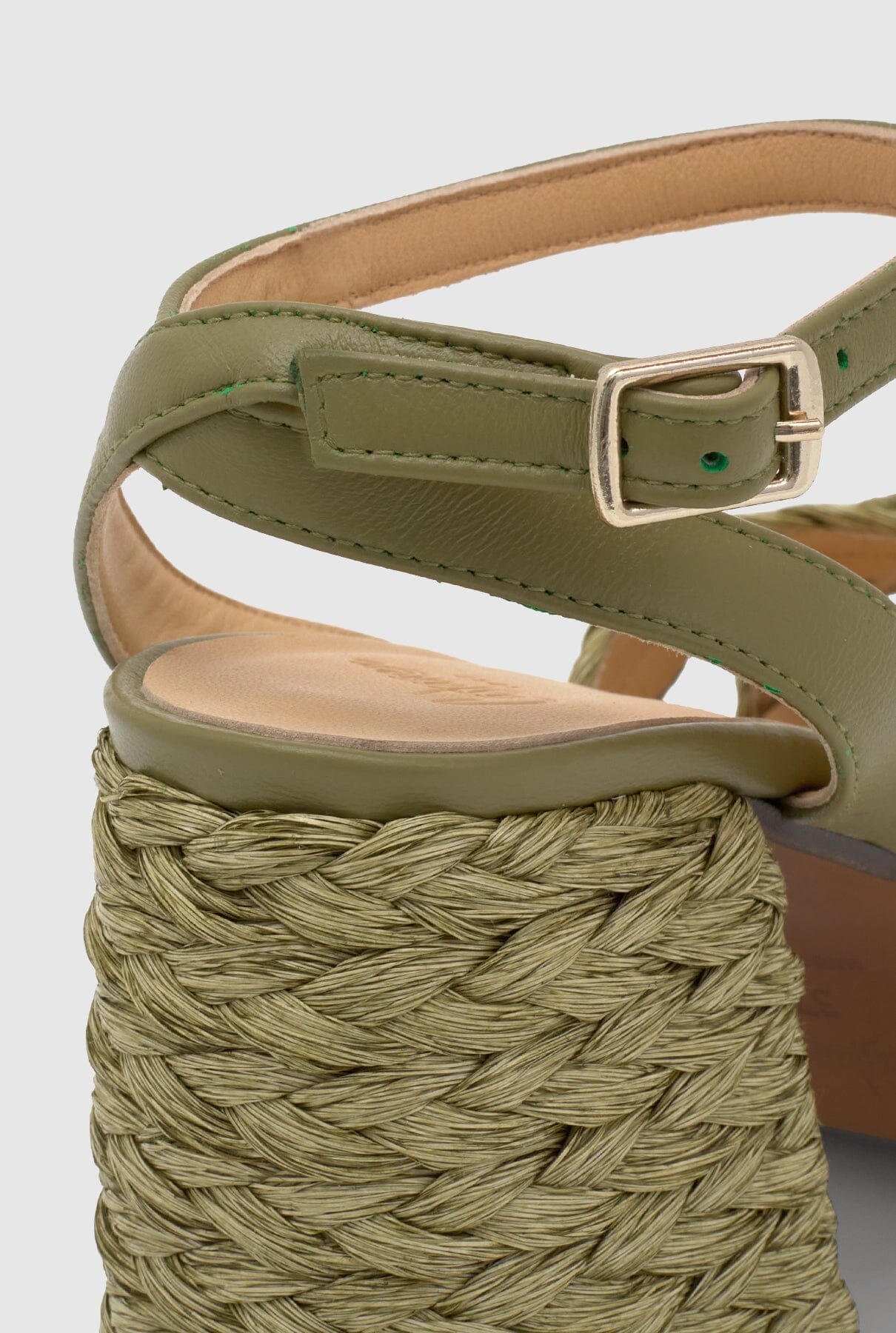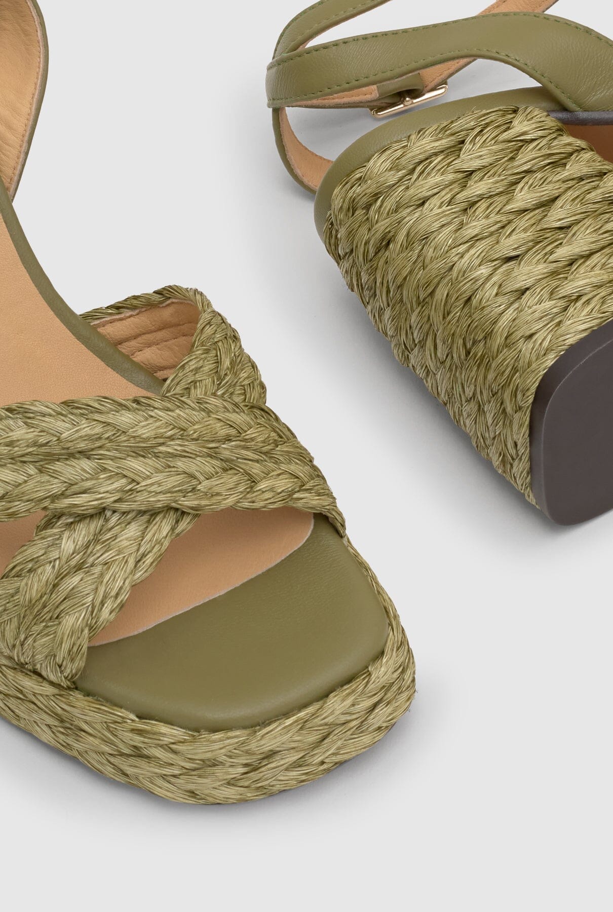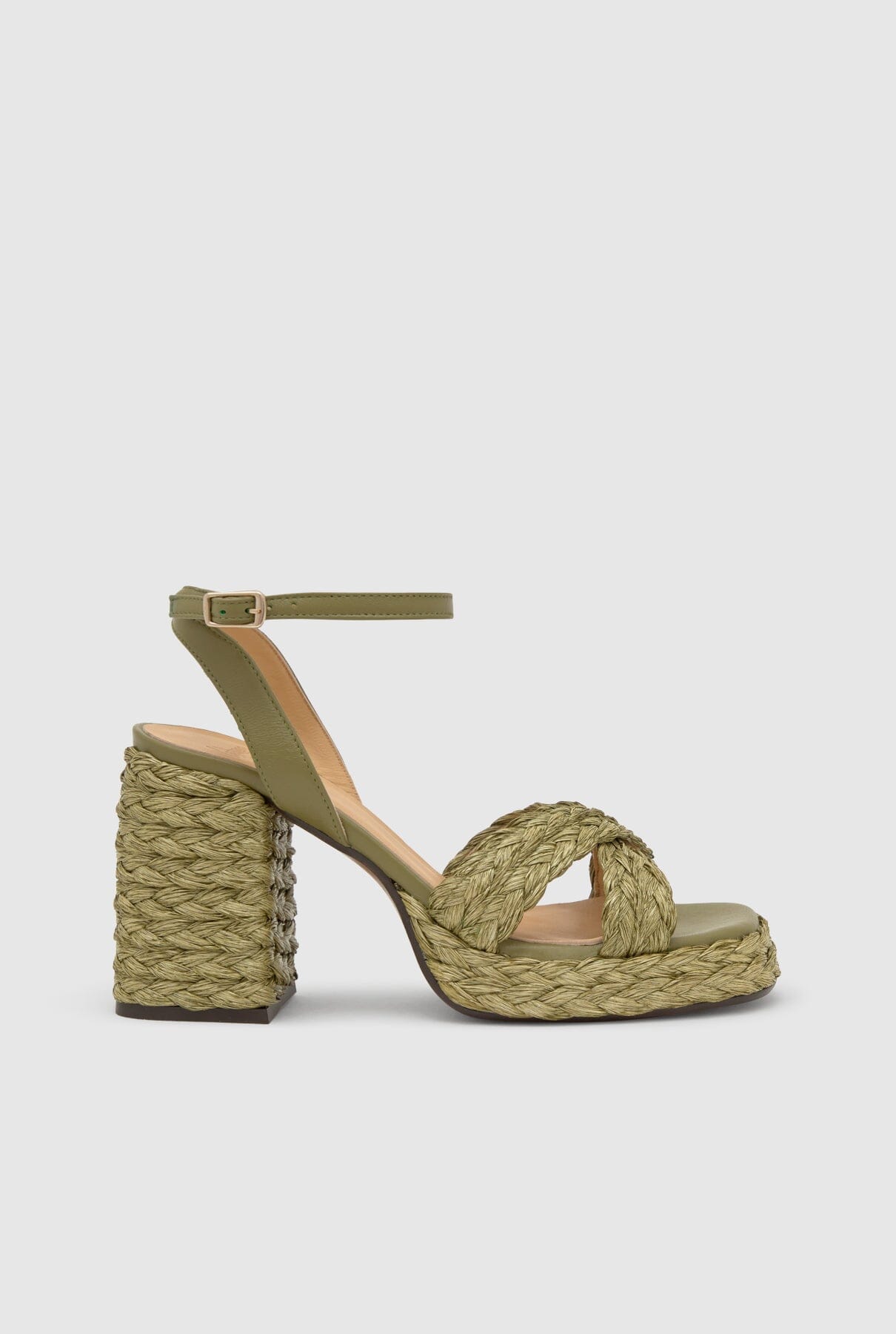 Sandalia Valeriette en rafia natural con cierre de pulsera, plantilla acolchada, escote en pico y tacón de 10cm con forro a juego.