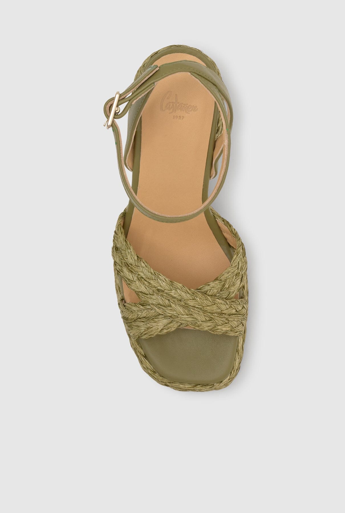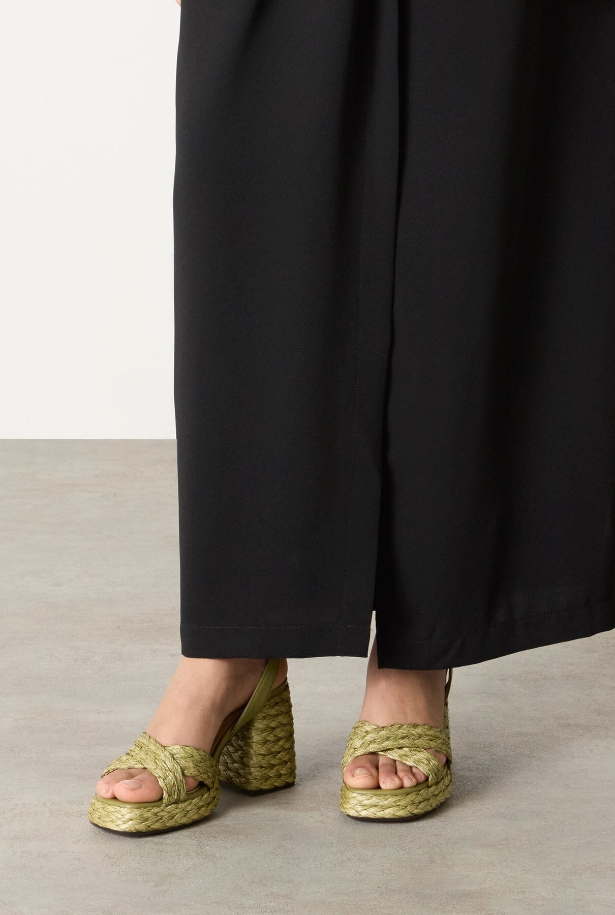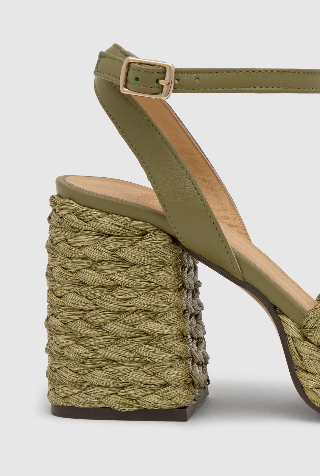 Sandalia Valeriette en rafia natural con cierre de pulsera, plantilla acolchada, escote en pico y tacón de 10cm con forro a juego.